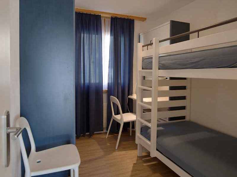 Elternschlafzimmer mit Bett und Kommode sowie Kleiderschrank mit Schreibflaeche. Daneben das zweite Schlafzimmer mit Kajuettenbett für 2 Personen, Kleiderschrank und ebenfalls eingebauter Schreibflaeche. Küche: