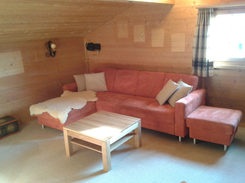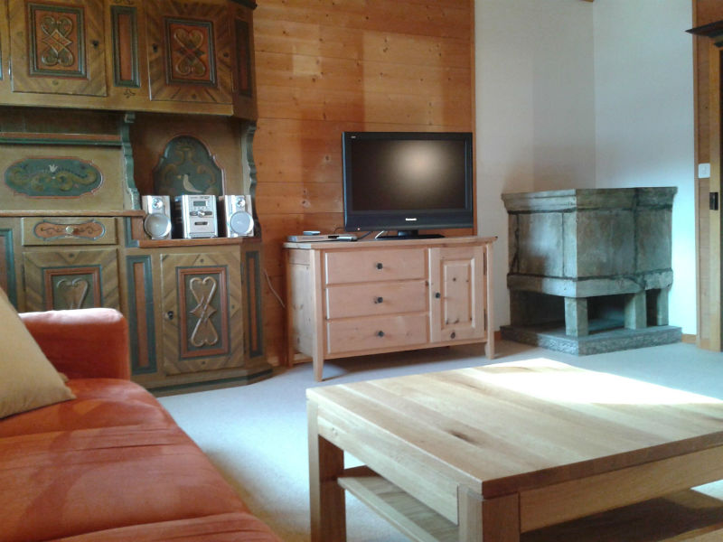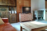Wohnzimmer mit Specksteinofen (Holz vorhanden und inbegriffen) TV, Radio und W-LAN sind vorhanden und inbegriffen. Küche