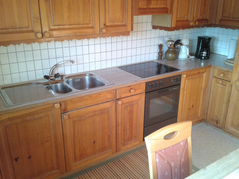 Küche mit Esstisch und Stühlen. Küchenwäsche ist vorhanden und inbegriffen.