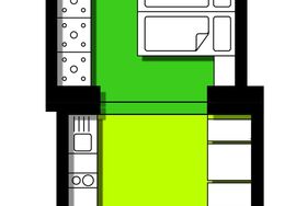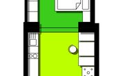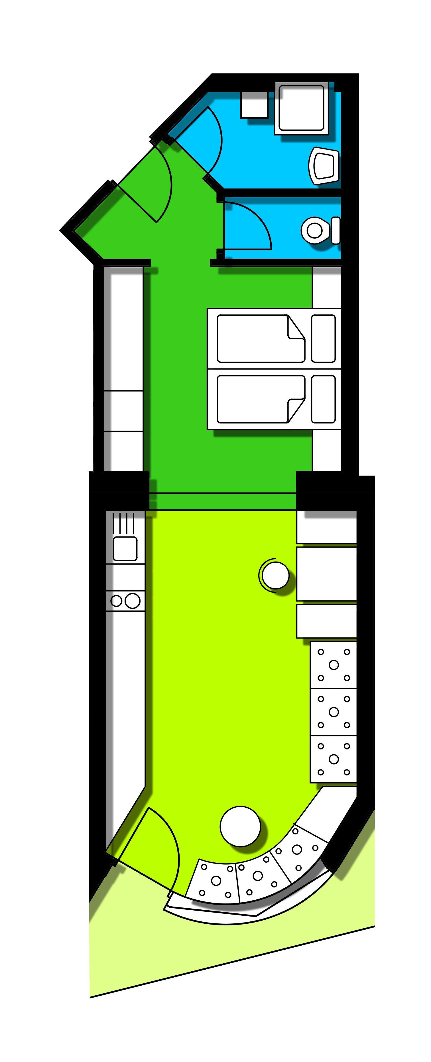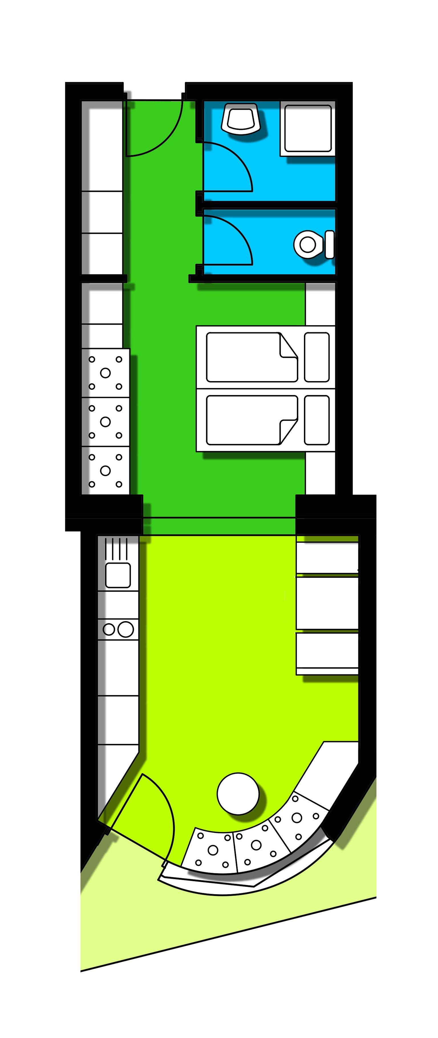 Appartement mit Schlafraum, getrenntem Wohnraum, kleine Kochnische ausgestattet mit Zweiplattenherd, Spüle, Kühlschrank, Geschirrspüler, Kaffeemaschine, Mikrowelle und ausreichend Geschirr. Durch die Couchliege besteht die Möglichkeit für eine 3. Person.