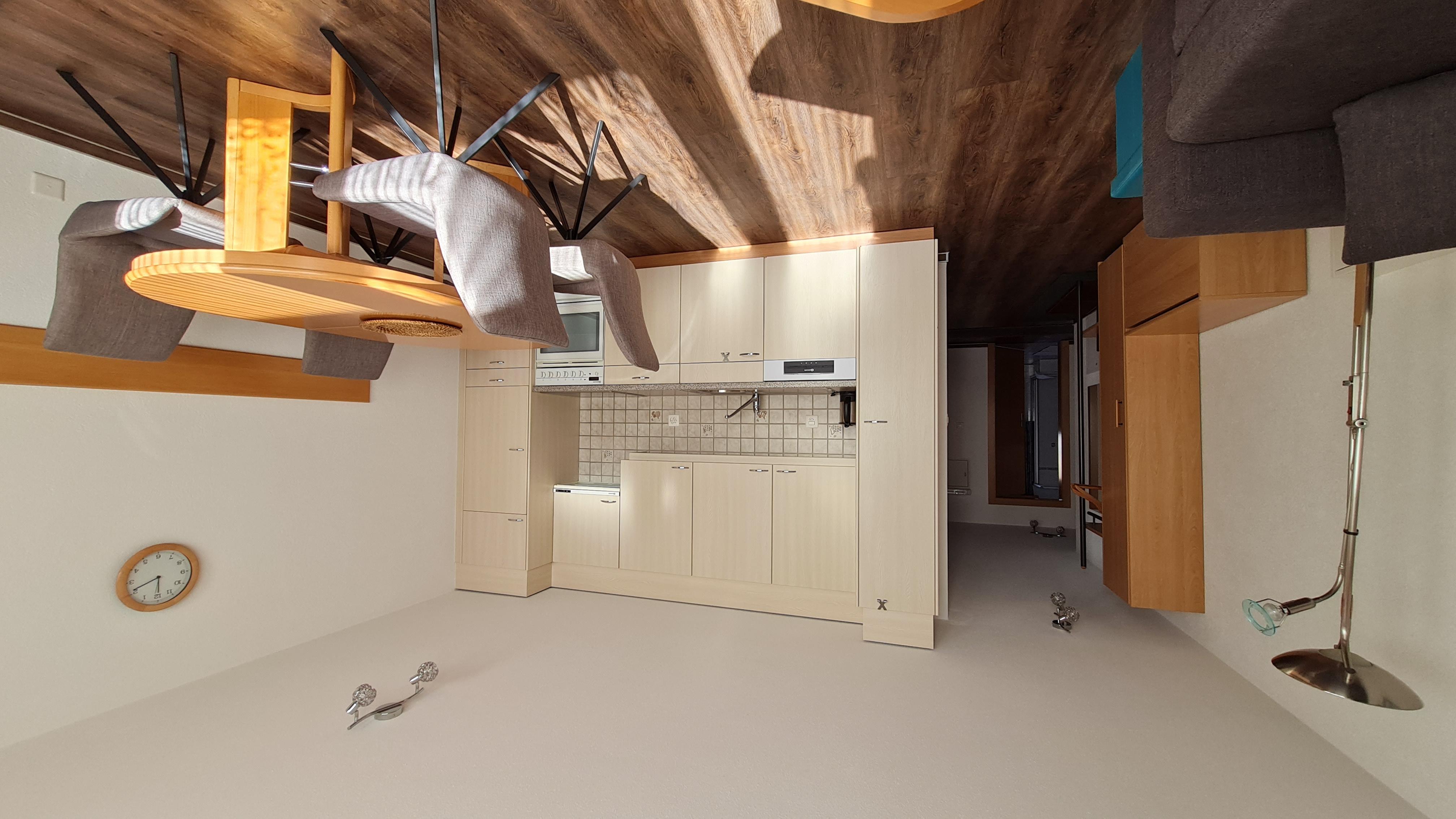 Wohnraum mit Küche und Essecke. 2 Schlafzimmer, Dusche/WC.