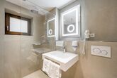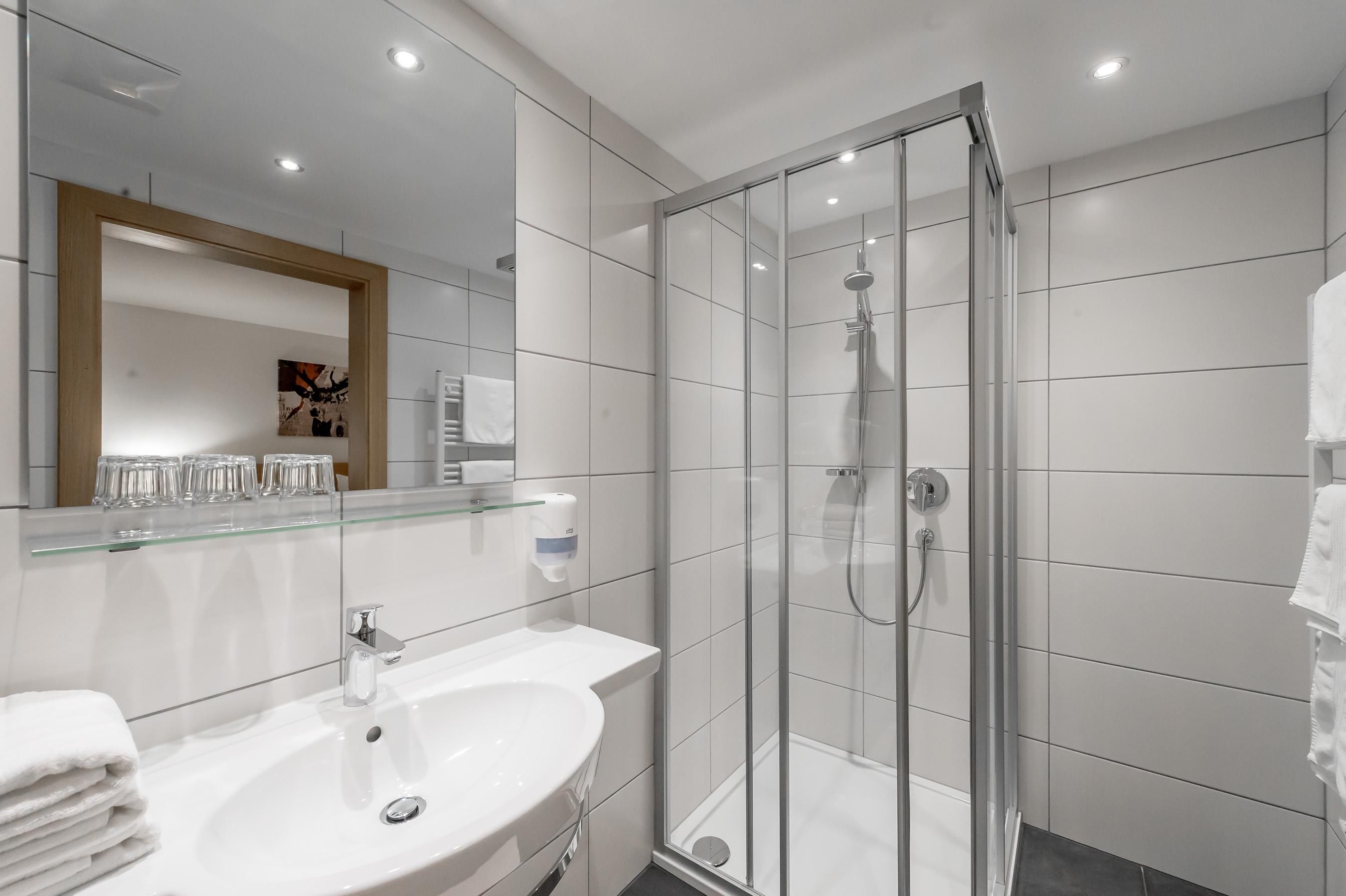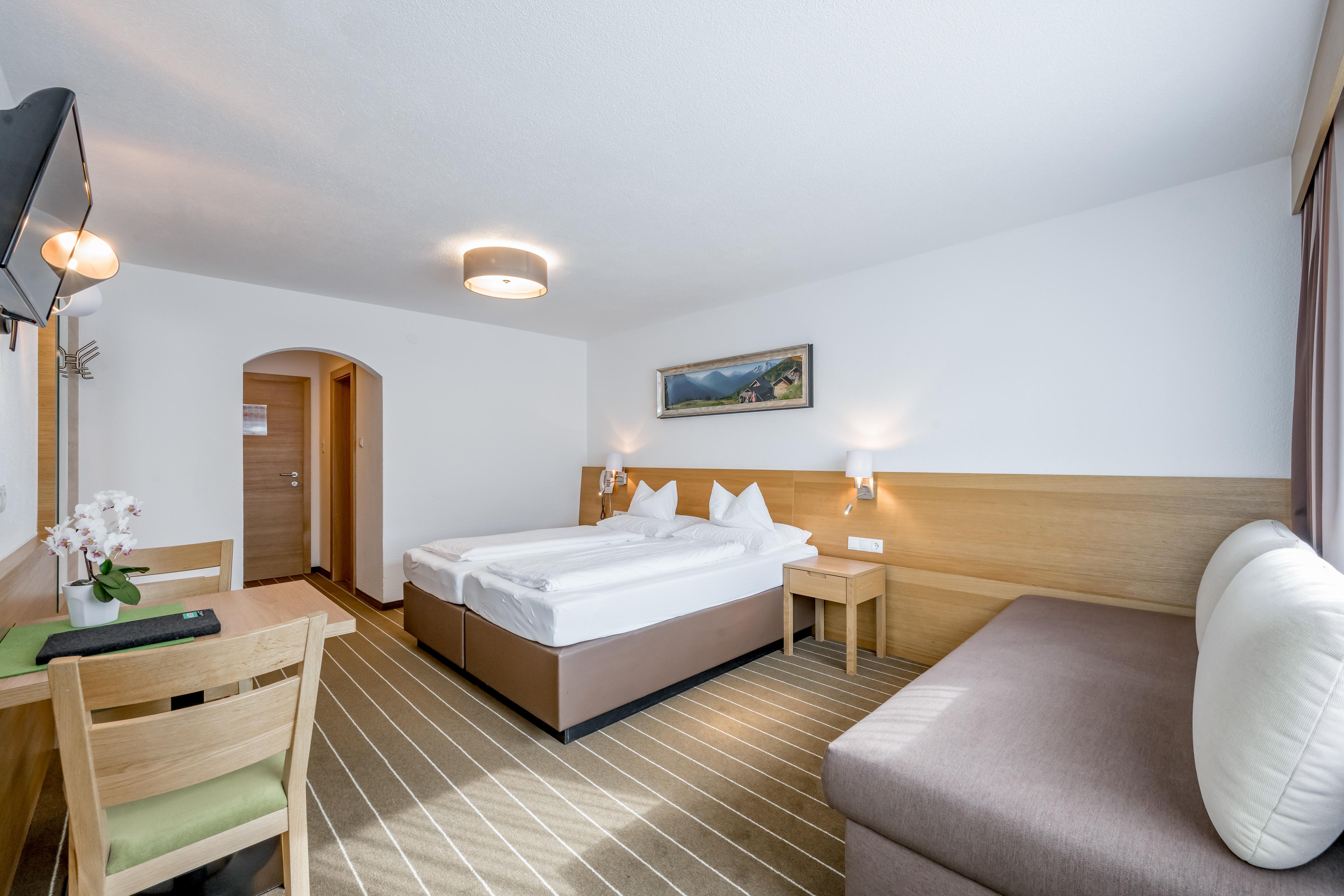 Zimmer mit Dusche/WC, 1 Doppelbett sowie eine Sofaliege für die 3. Person, Kabel-TV (Flat TV), Haarföhn, Safe, WLAN kostenlos.Balkon bzw. Terrasse zur Ostseite mit Panoramablick ins Tal.
