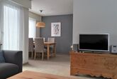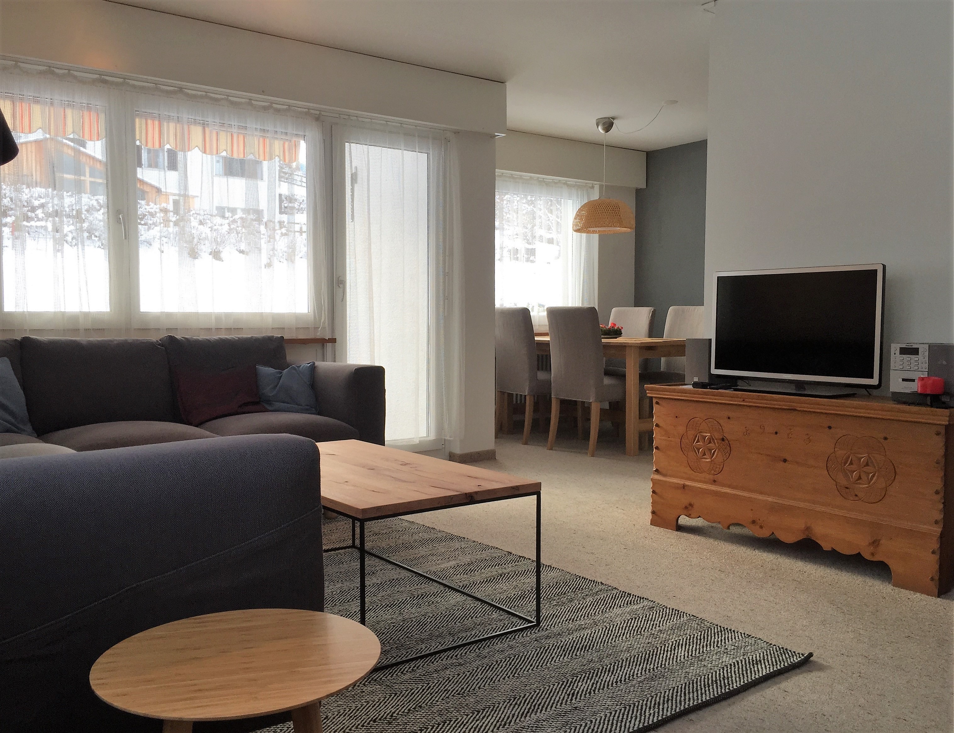 Wohnung im 1. Stock mit sonnigem Südbalkon. Zwei Schlafzimmer (eines davon mit Doppelbett, eines mit zwei Einzelbetten). Grosser Wohn-/Essbereich mit offener, gut ausgestatteter Küche (z.B. Geschirrspülmaschine, Nespresso-Kaffeemaschine, Dampfkochtopf, Mikrowelle, Toaster, Racletteofen, Fondue-Caquelon etc.). Wohnzimmer mit grossem, gemütlichem Ecksofa sowie Radio und TV. Kleines Badezimmer mit Dusche. WC separat. Balkon mit Tisch und vier Sitzgelegenheiten.