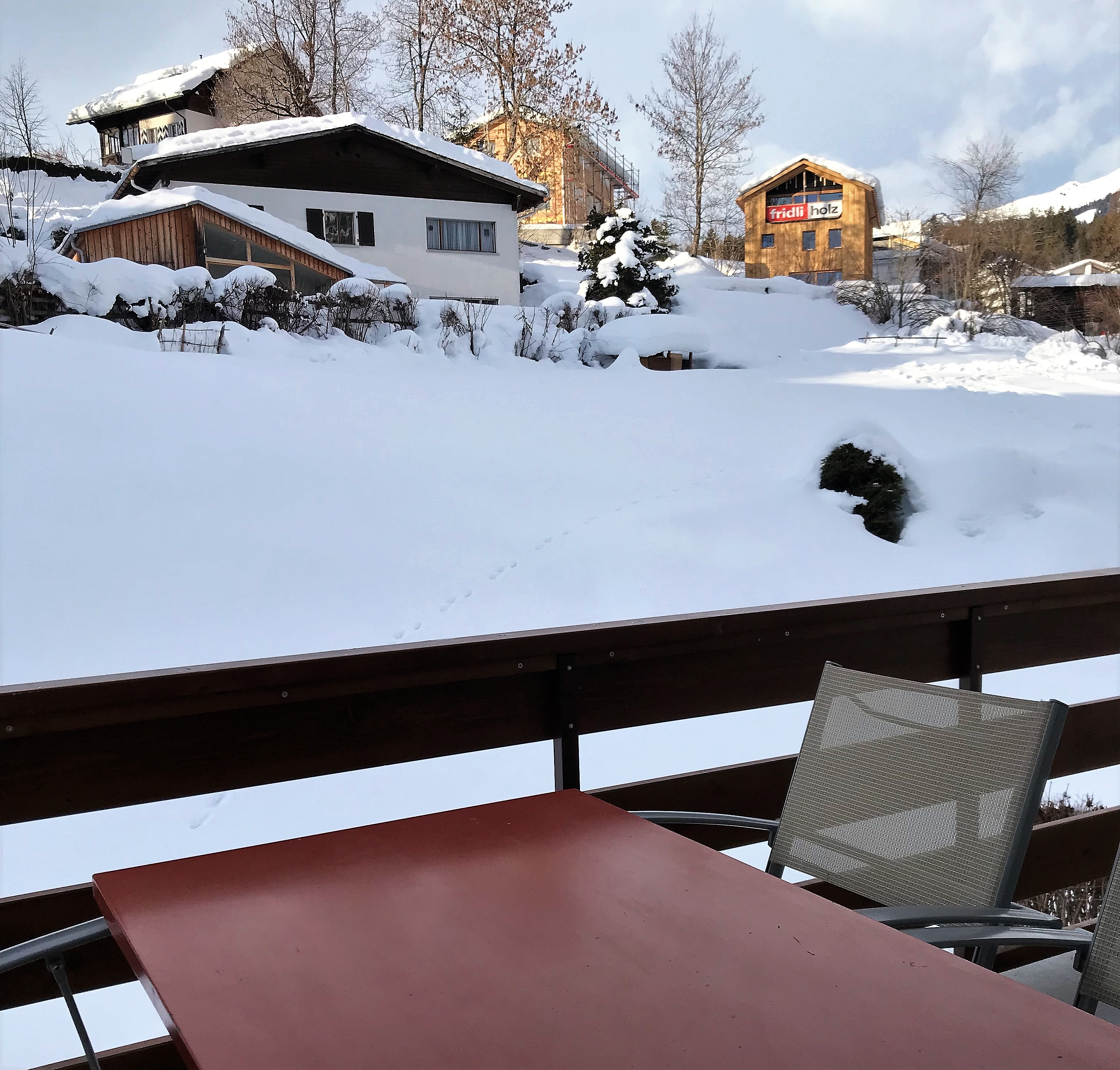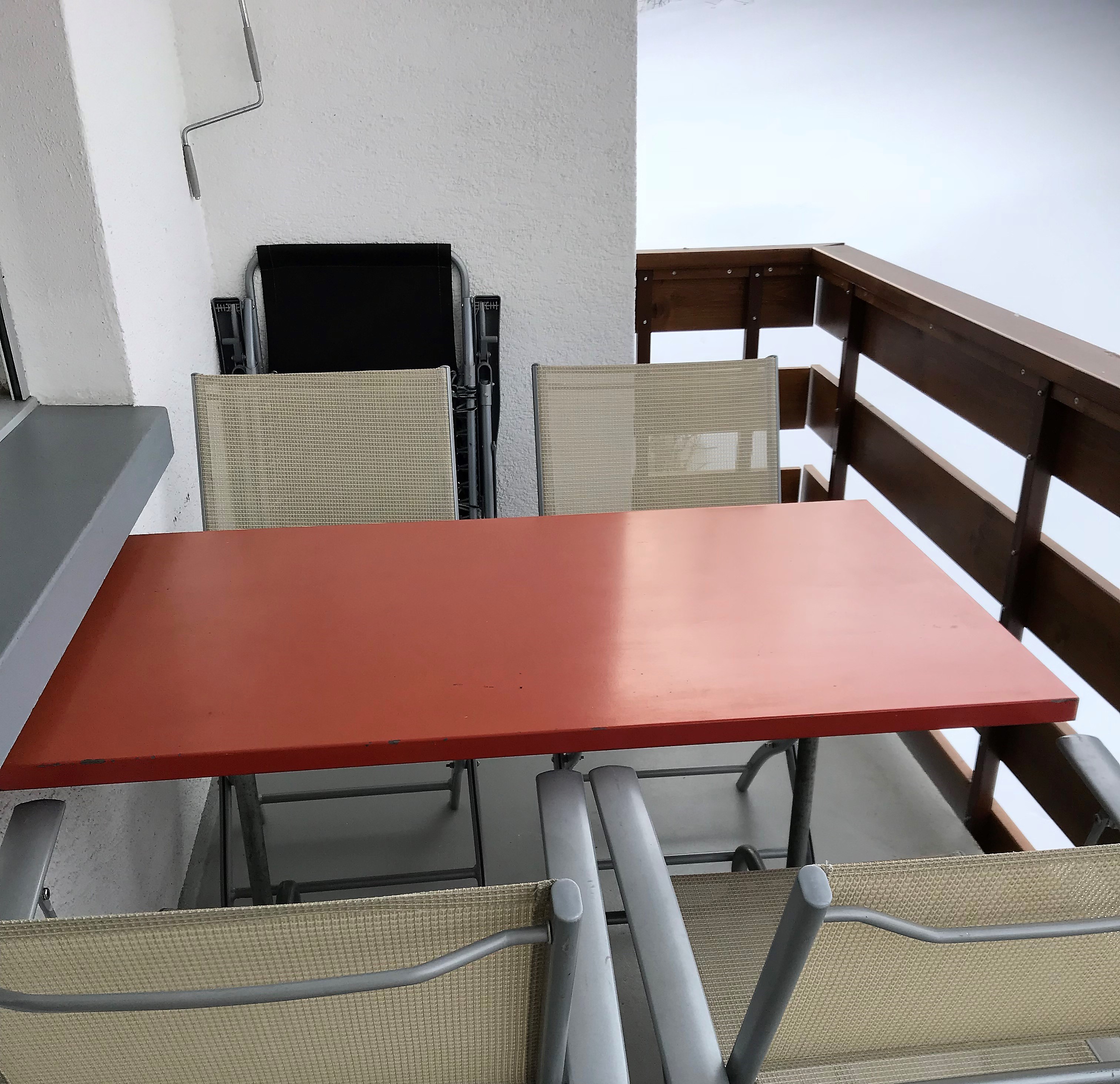 Balkon mit Tisch und vier Sitzgelegenheiten.Gesamte Wohnung mit Balkon zur Alleinnutzung. Skikeller und Tiefgaragenplatz für sämtliche Bewohner zugänglich. Waschmaschine und Tumbler im Untergeschoss verfügbar (gegen Gebühr). Grosser Garten für sämtliche Hausbewohner.Das Haus wurde 1970 erbaut.