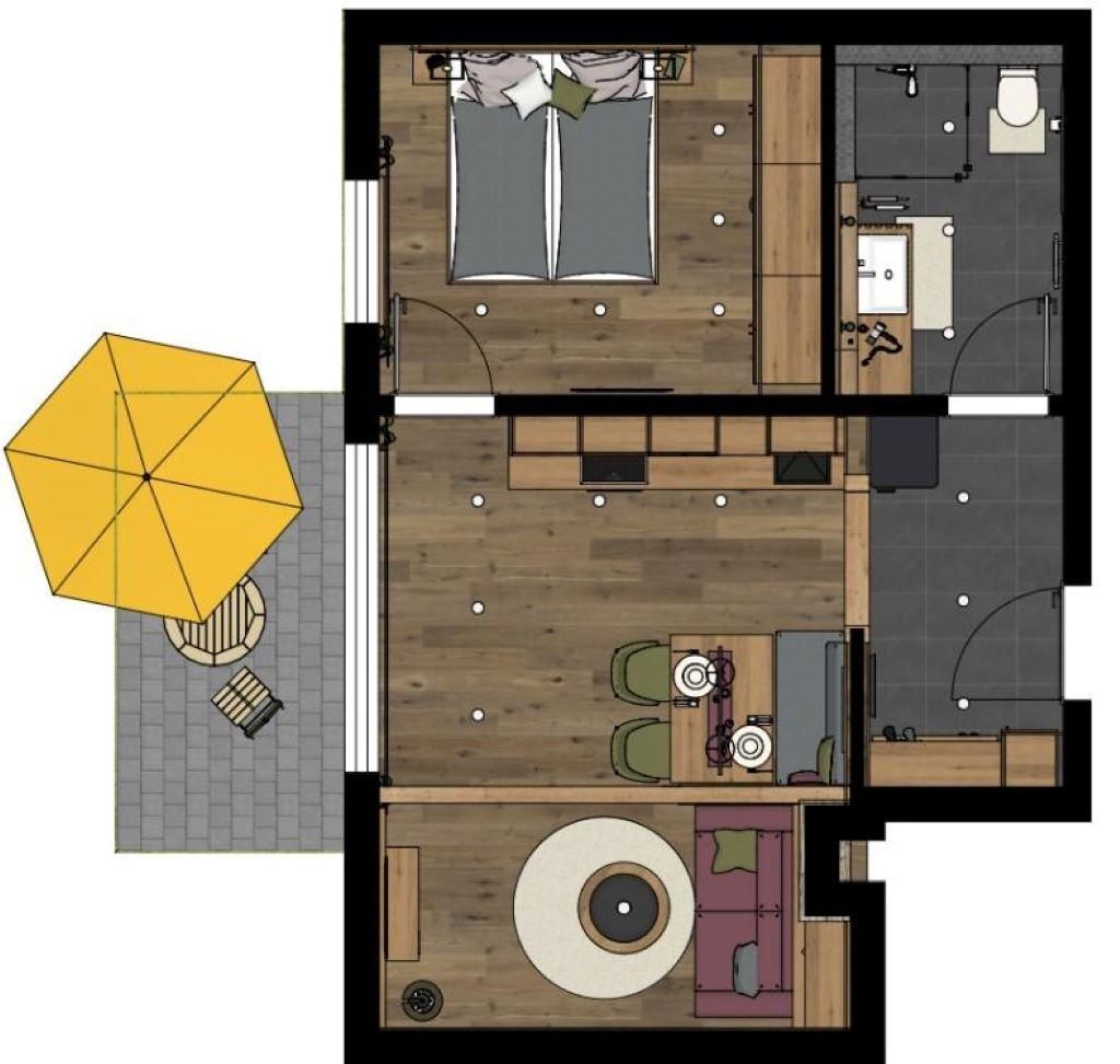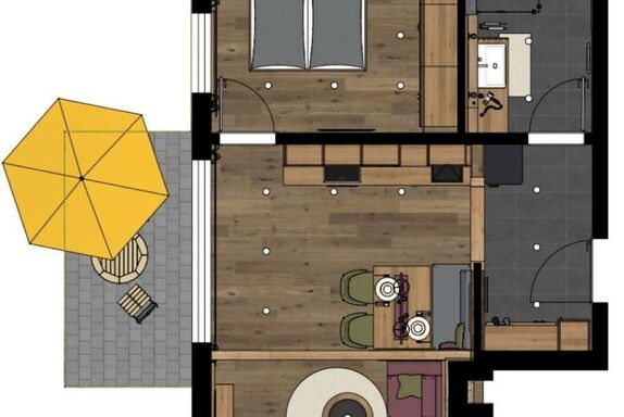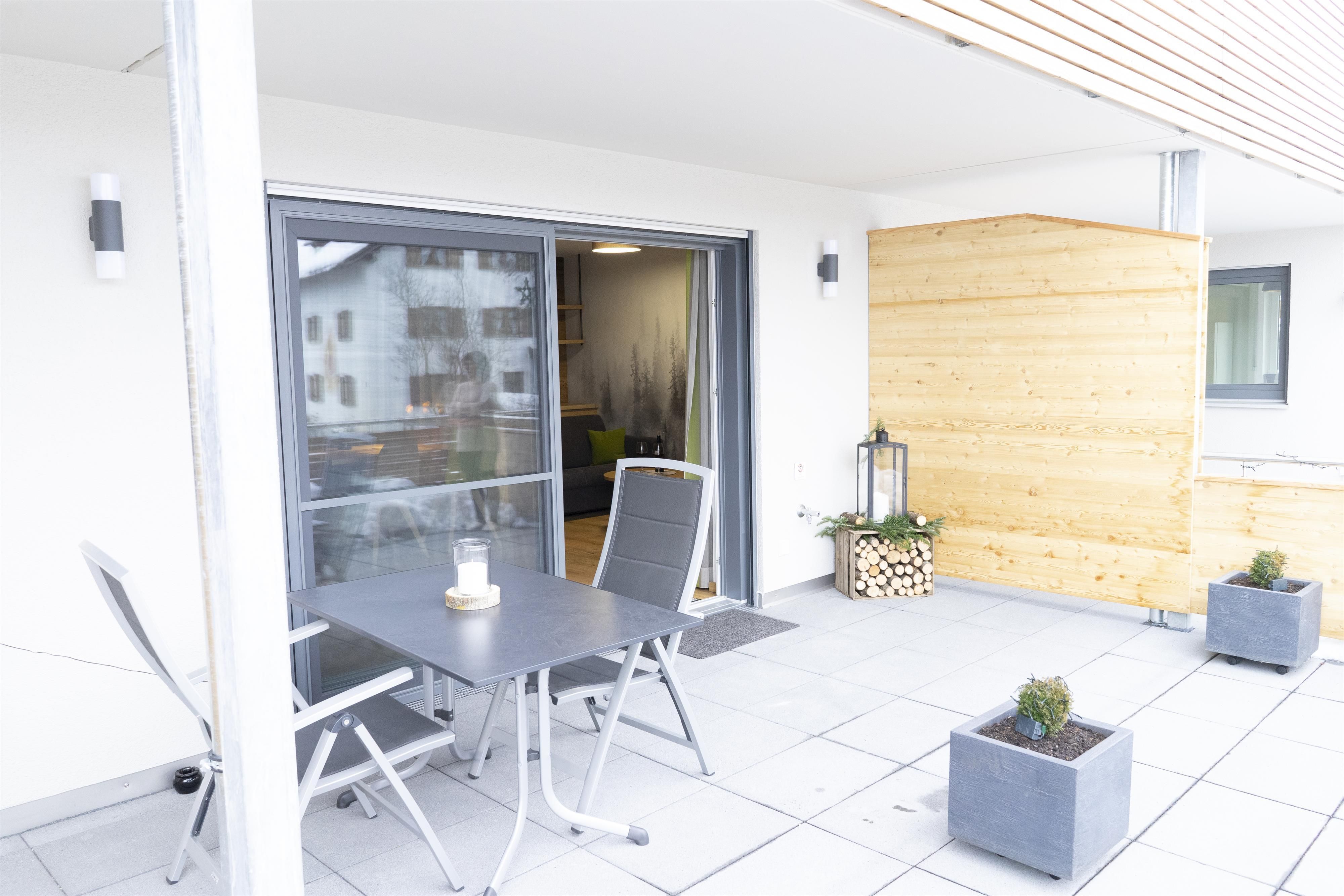Entspannung finden Sie auf der großzügig, teils überdachten 28m² Terrasse mit Gartenmöbeln und Liegestühlen mit Blick auf den Dorfbach.