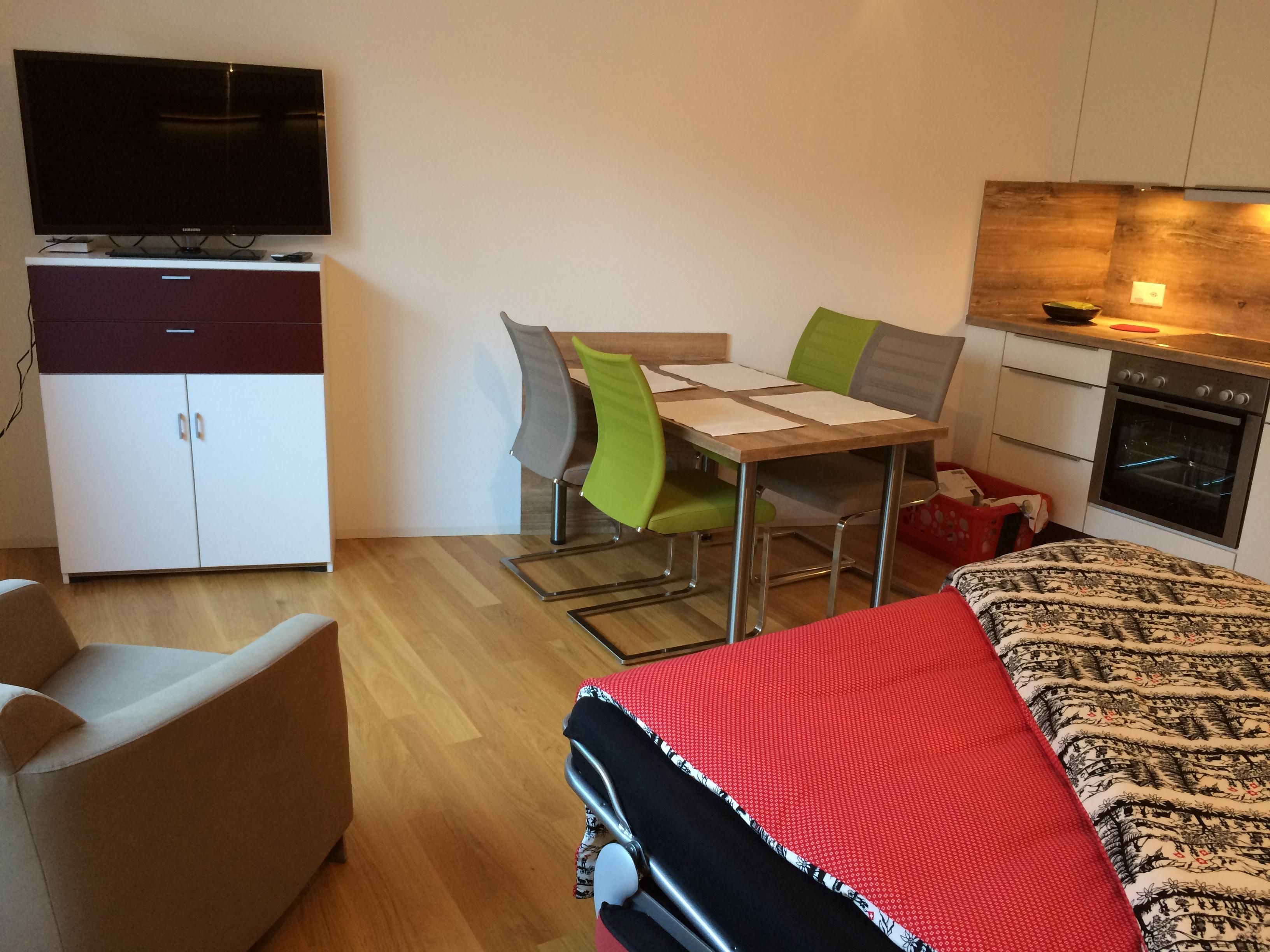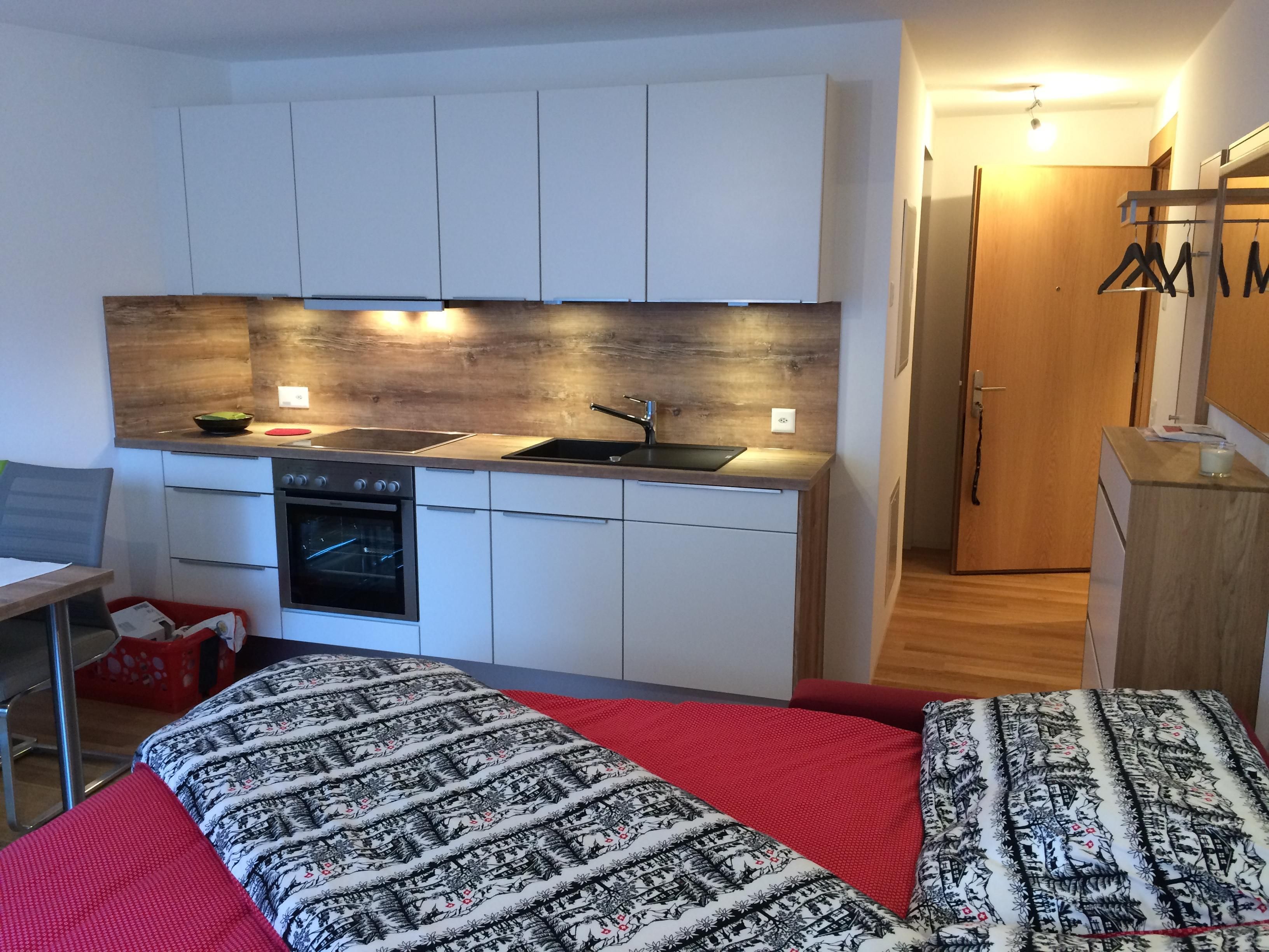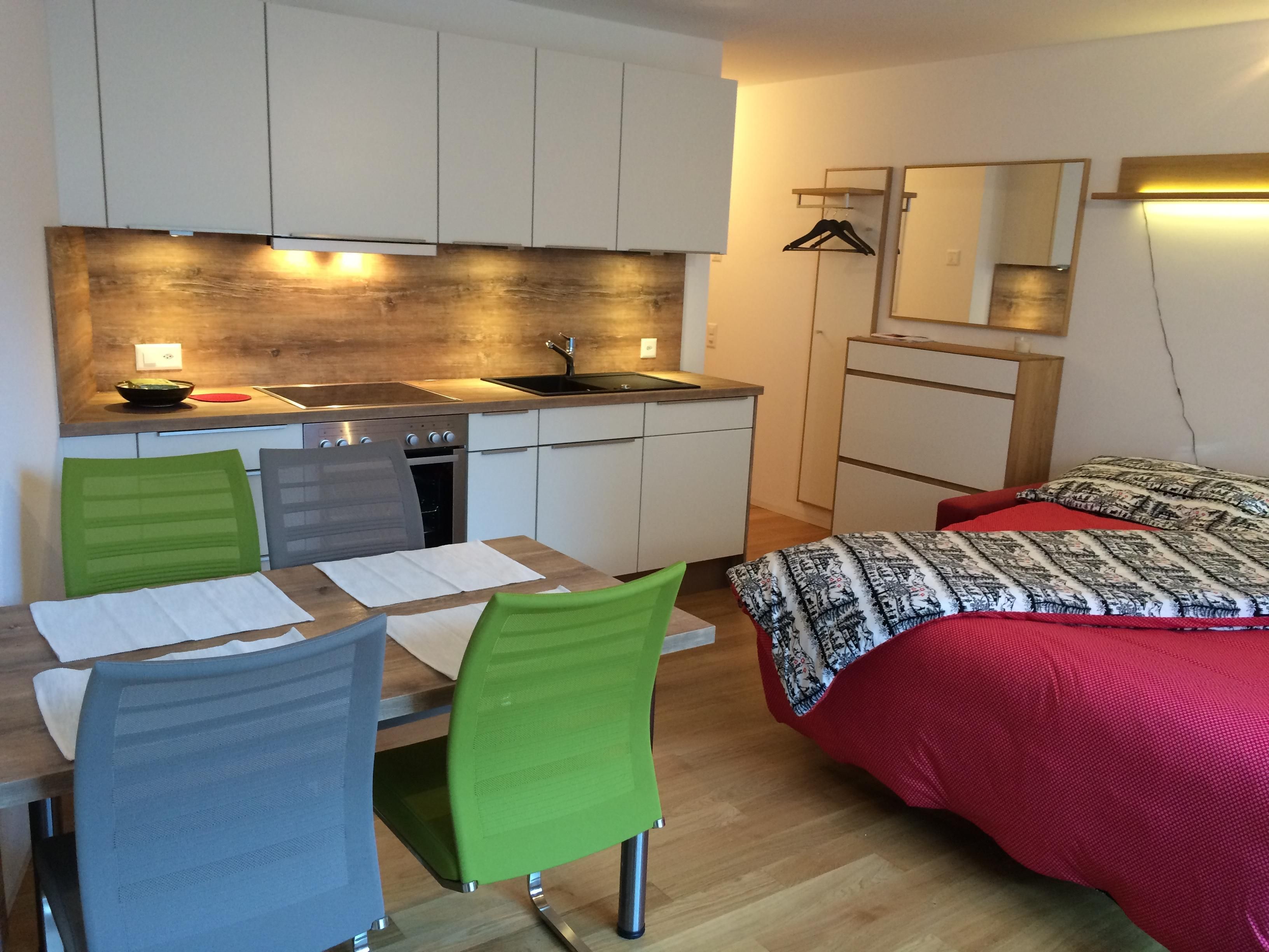 Innen besticht das Studio durch seine praktischen und gemütlichen Wohnlösungen. Wandeln Sie das Sofa mit wenigen Handgriffen in ein komfortables Bett mit Matratze und Lattenrost (160 cm) um und genießen Sie den Raum tagsüber erneut als Wohnbereich. Eine offene, gut ausgestattete Küche mit Backofen, Kochherd, Kühlschrank sowie essentiellen Küchenutensilien und einer Nespresso-Kaffeemaschine lädt zum gemeinsamen Kochen und genießen am Esstisch für vier Personen ein. Zusätzlichen Stauraum bieten eine kleine Garderobe, ein Kleiderschrank, ein Sideboard und ein Kellerabteil.