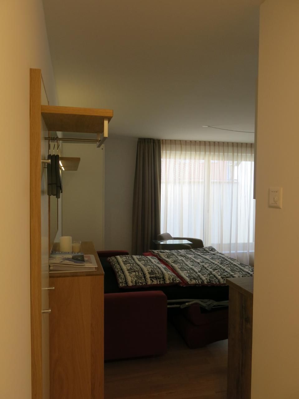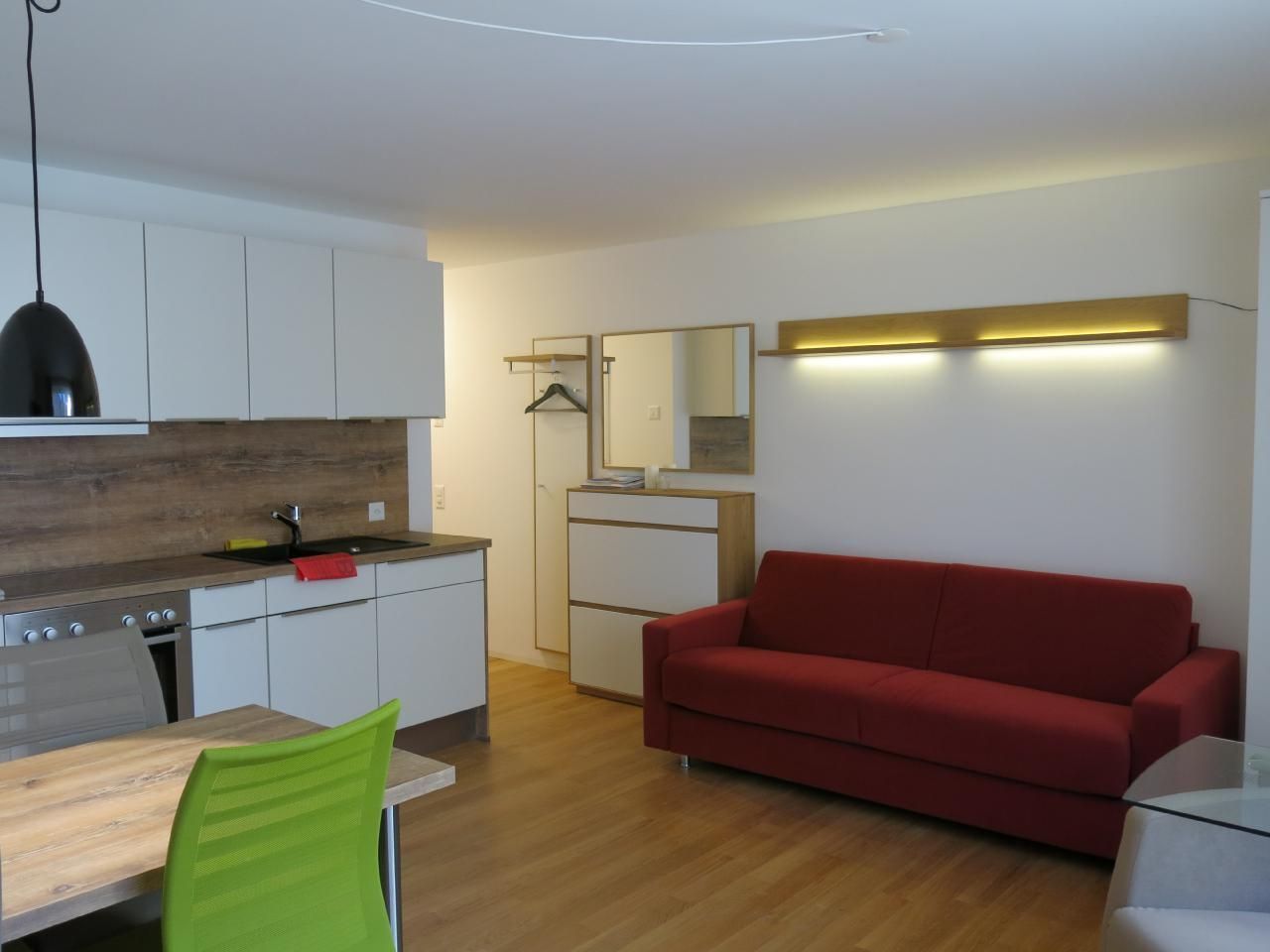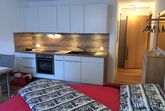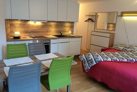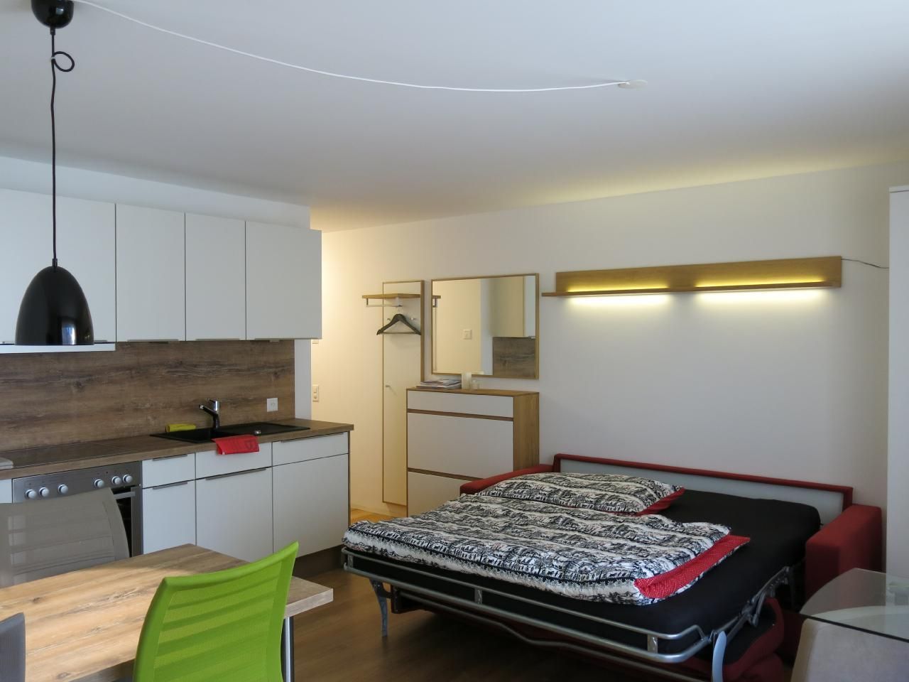 Innen besticht das Studio durch seine praktischen und gemütlichen Wohnlösungen. Wandeln Sie das Sofa mit wenigen Handgriffen in ein komfortables Bett mit Matratze und Lattenrost (160 cm) um und genießen Sie den Raum tagsüber erneut als Wohnbereich. Eine offene, gut ausgestattete Küche mit Backofen, Kochherd, Kühlschrank sowie essentiellen Küchenutensilien und einer Nespresso-Kaffeemaschine lädt zum gemeinsamen Kochen und genießen am Esstisch für vier Personen ein. Zusätzlichen Stauraum bieten eine kleine Garderobe, ein Kleiderschrank, ein Sideboard und ein Kellerabteil.