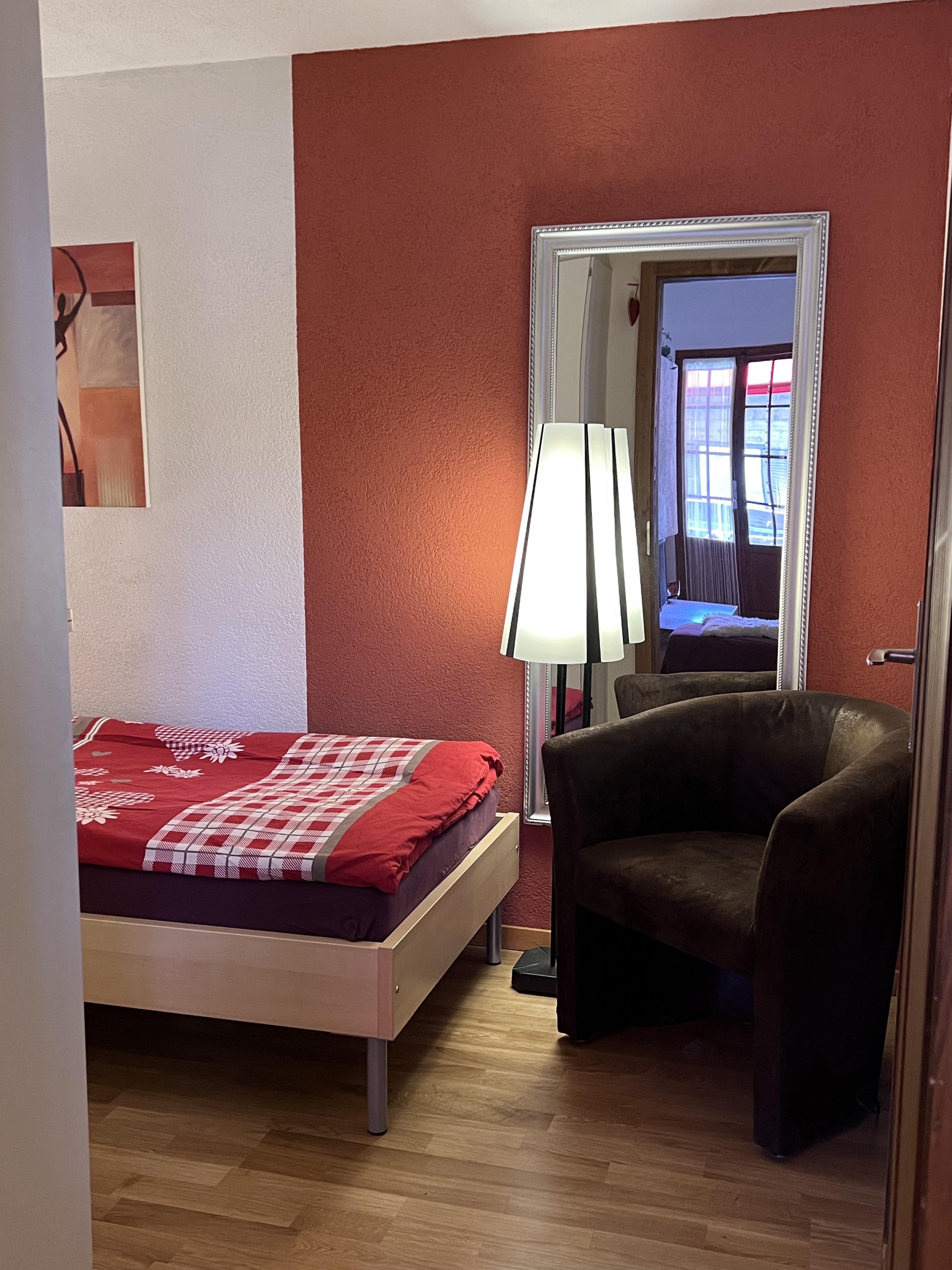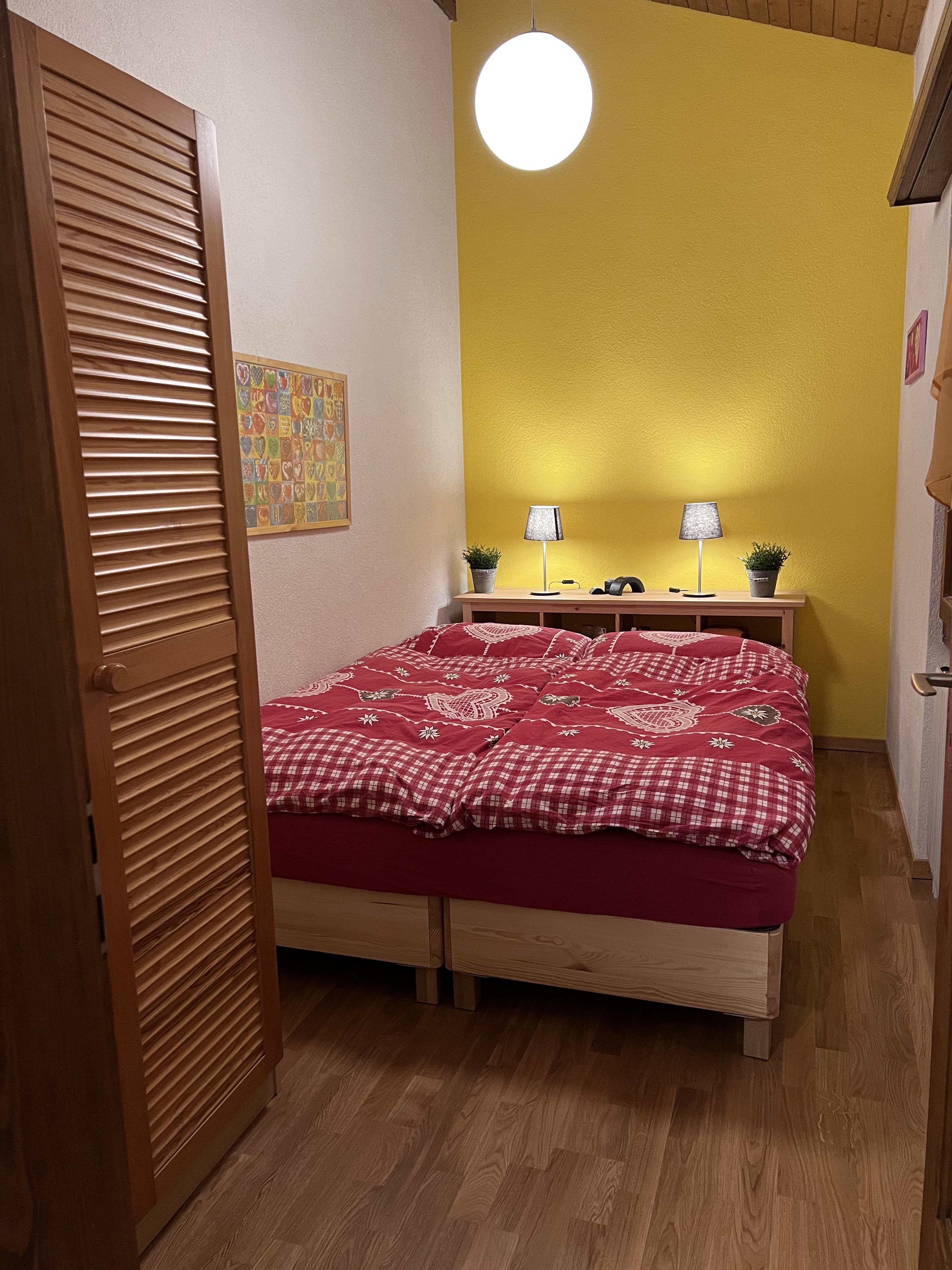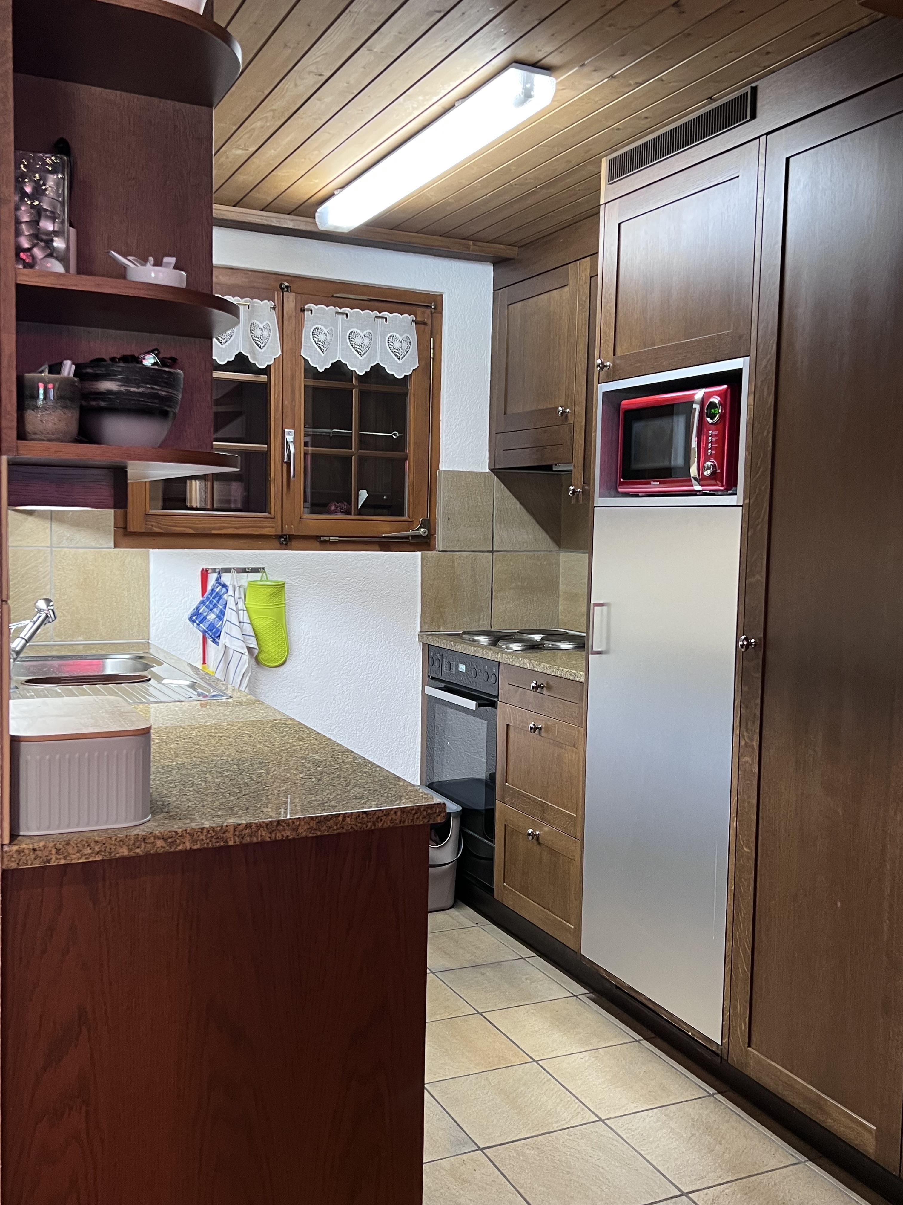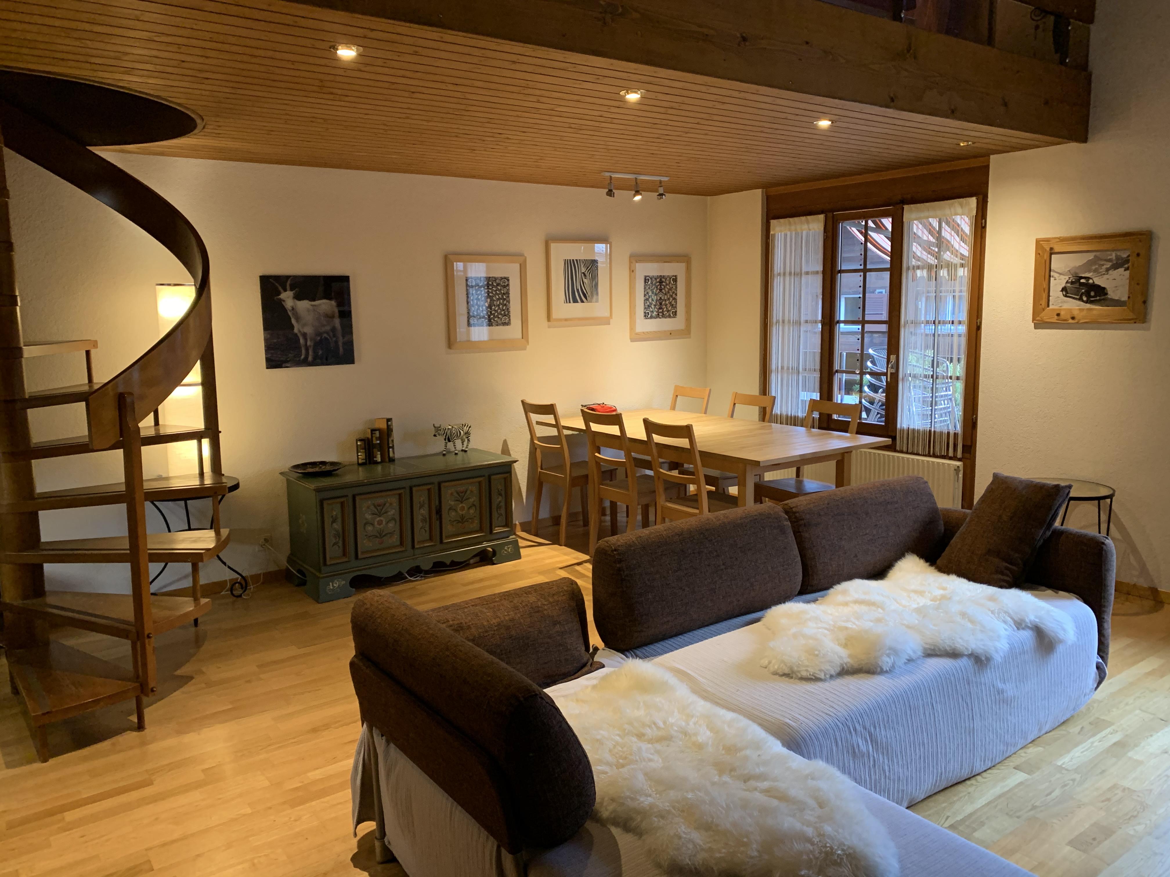 Grosses Wohn- und Esszimmer mit einem 6er-Sofa, Tisch mit 6 Stühlen. TV (Apple-TV, Teleboy-Fernseh-Programm, Youtube), DVD und Radio (DAB, Internetradio, Bluetooth, Spotify). Offene Küche mit 4 Herdplatten, Dampfabzug, Kühlschrank mit Gefrierfach, Backofen, Mikrowelle, Geschirrspüler, italienischer Kaffeekocher und Kolbenkaffeemaschine sowie Fondue-Set. Schlafzimmer mit 2 Betten (2x90x200cm). Schlafzimmer mit 1 Einzelbett (2x90x200cm). Galerie mit Doppelbett (160x200cm). Schränke in jedem Zimmer. 1 Dusche/WC und 1 separates WC. Waschmaschine. WiFi.