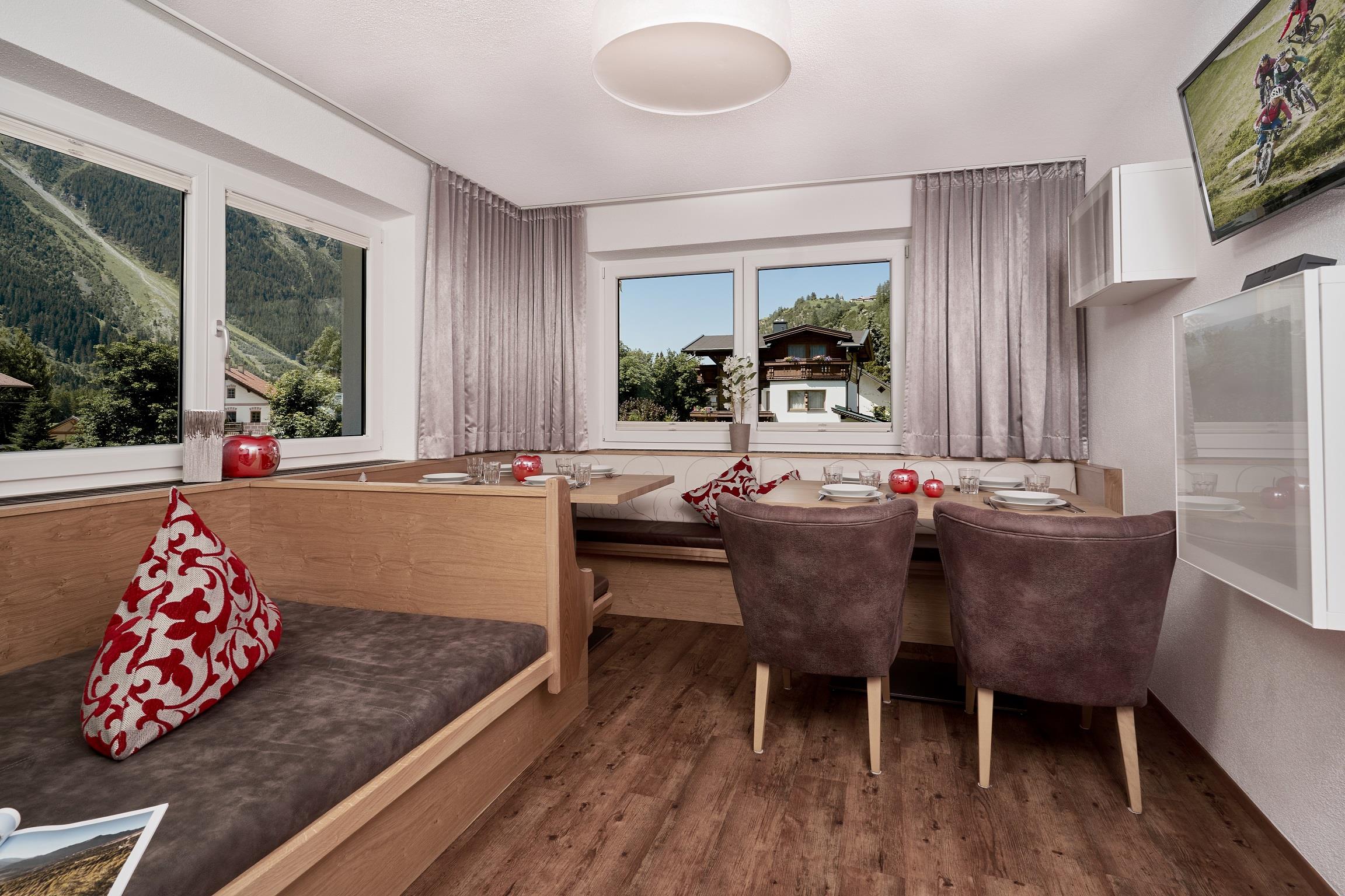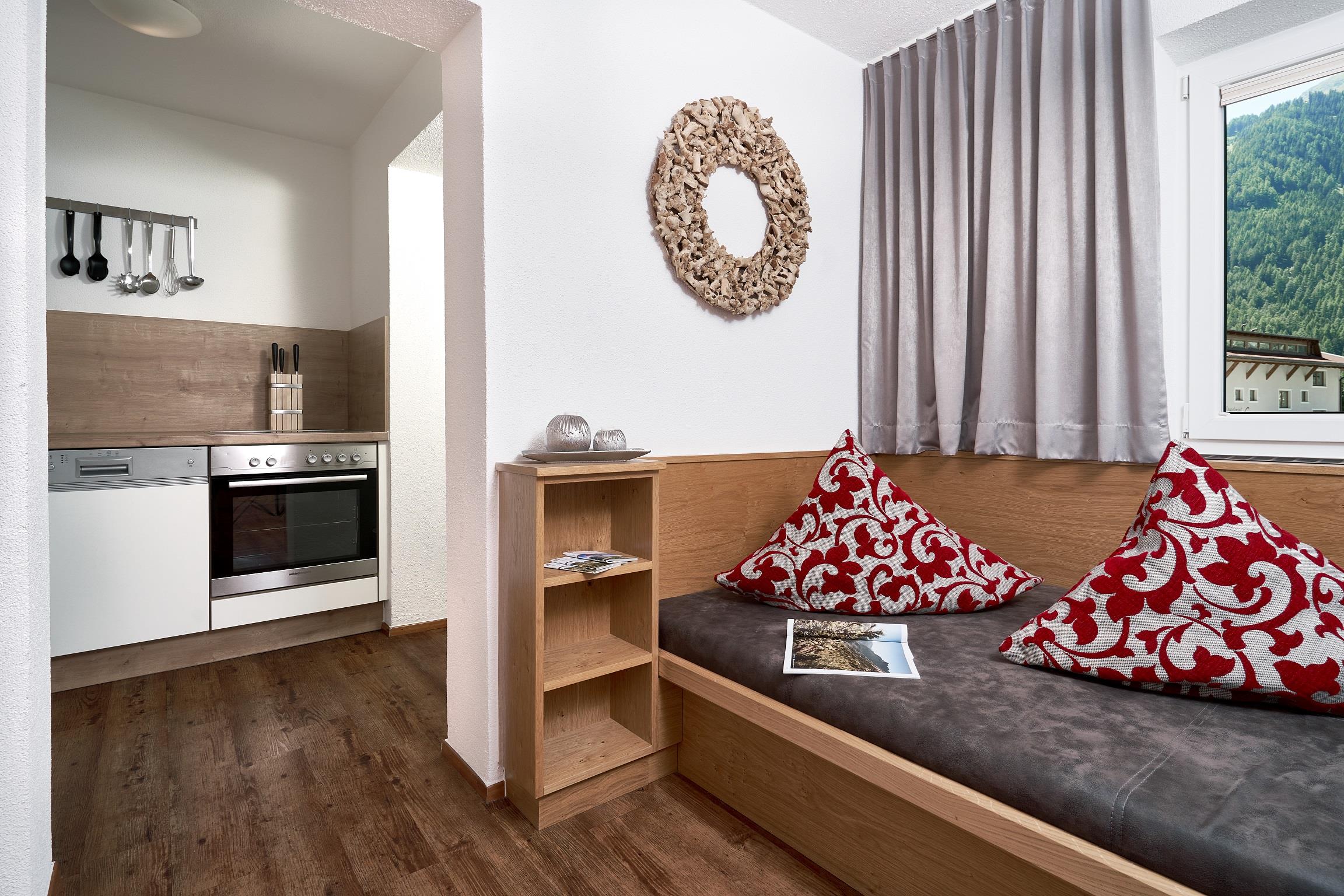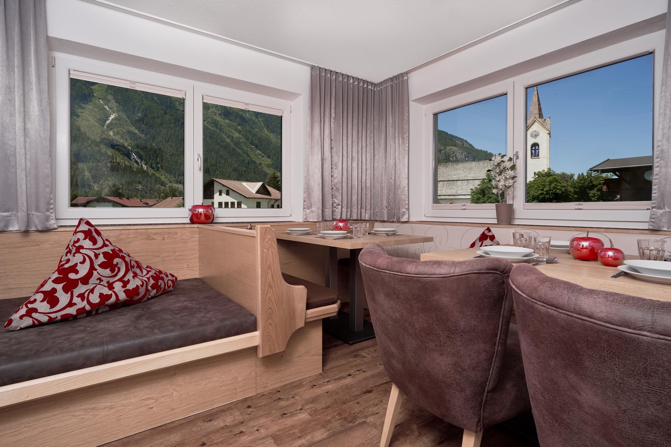 Die voll ausgestattete Küche mit Wohn- und Essbereich lädt zu gemeinsamen Mahlzeiten ein. Von hier aus gelangen Sie auf die großzügige Terrasse mit Sitzmöbeln und Grill. Komfort, Gemütlichkeit und ausreichend Platz für alle machen das Apart Alessandro zum perfekten Rückzugsort im Urlaub!