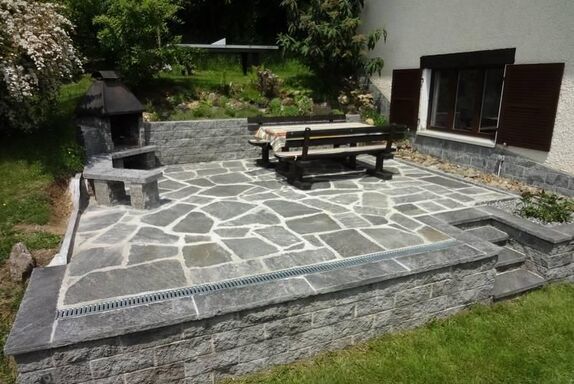- Sonnenterrasse mit Liegewiese und Gartentisch, Liegestühlen, Sonnenschirm