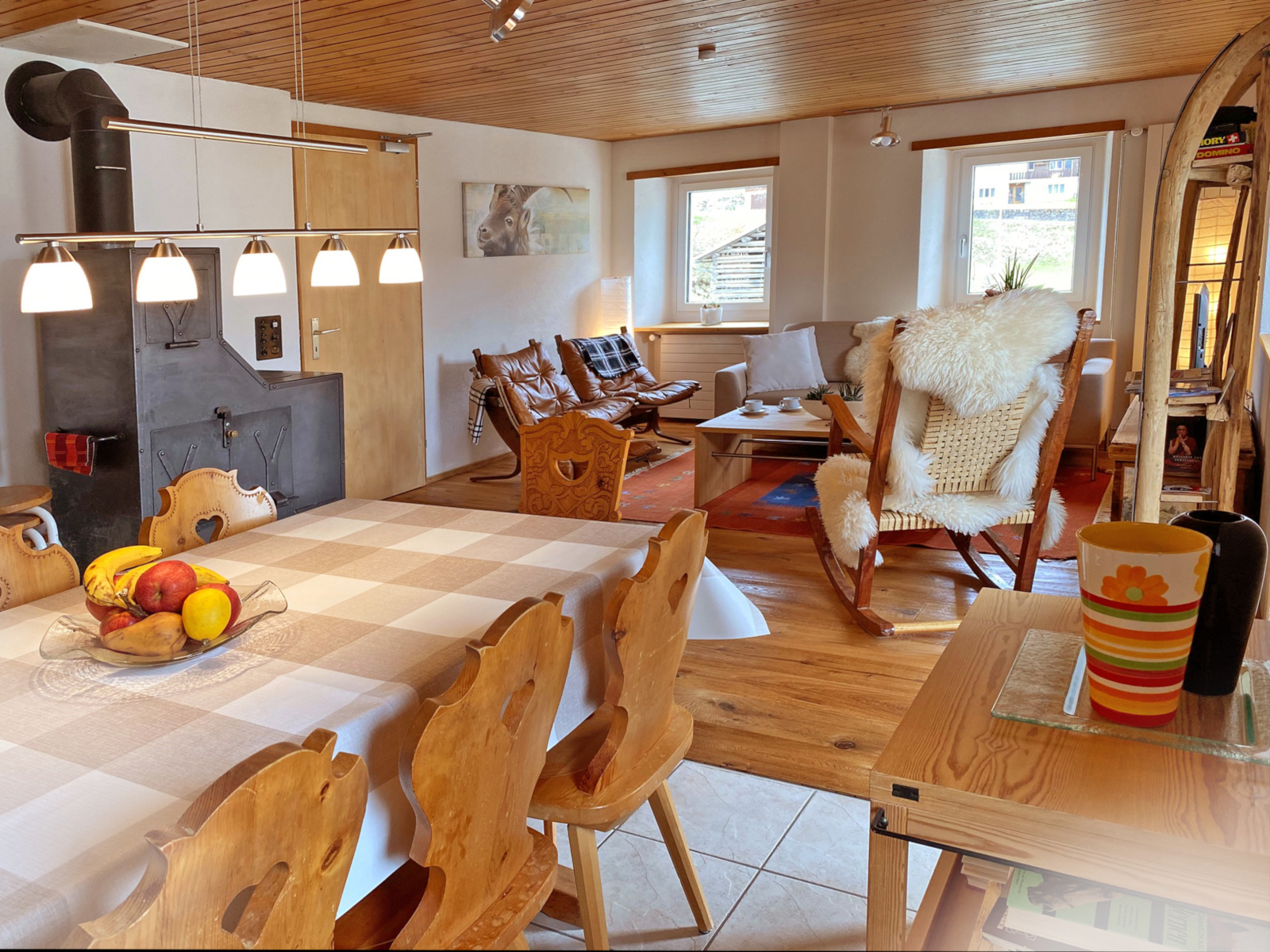Schöner, sonniger Wohnraum mit offenem Küchen-/Essbereich. Ein grosser Esstisch mit 9 Stühlen für das entspannte gemeinsame Essen. Der Wohnbereich verfügt über ein Club-Tisch, grosses Sofa und Lederstühle, Swisscom-TV, kostenloser WLAN, Bücher und Spiele. Der Balkon (Süd/West) lässt die Mittag- und Abendsonne geniessen. Küche: