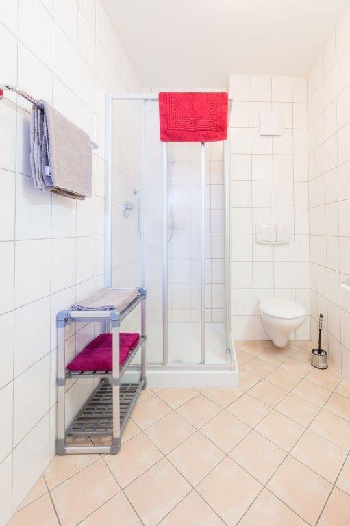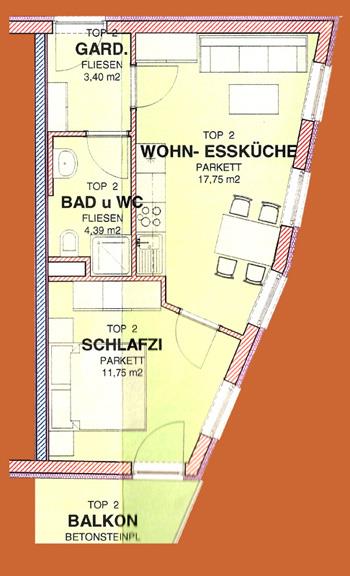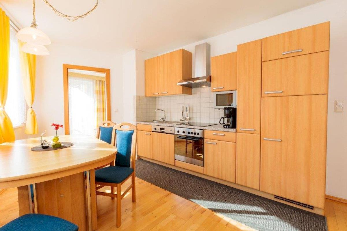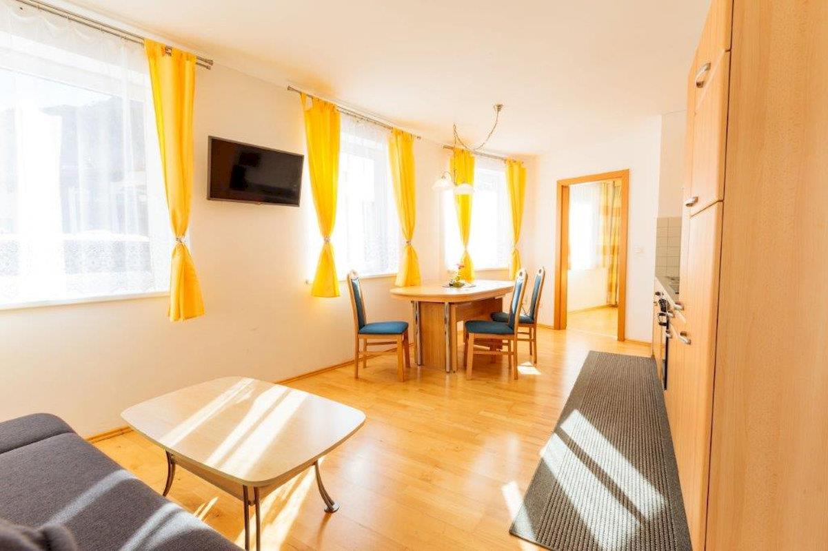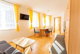Gemütlich und helles Appartment Florian mit Balkon: 1 Doppelzimmer, vollausgestattete Wohnküche (Geschirrspüler, Kaffeemaschine, Wasserkocher, Mikrowelle, Toaster und Eierkocher uvm.) mit Essecke, ausziehbarer Couch (Schlafmöglichkeit für 1 weitere Person) und Kabelfernsehen, 1 Badezimmer mit Dusche/WC und Föhn, Vorraum mit Garderobe. Größe: ca. 42 m²