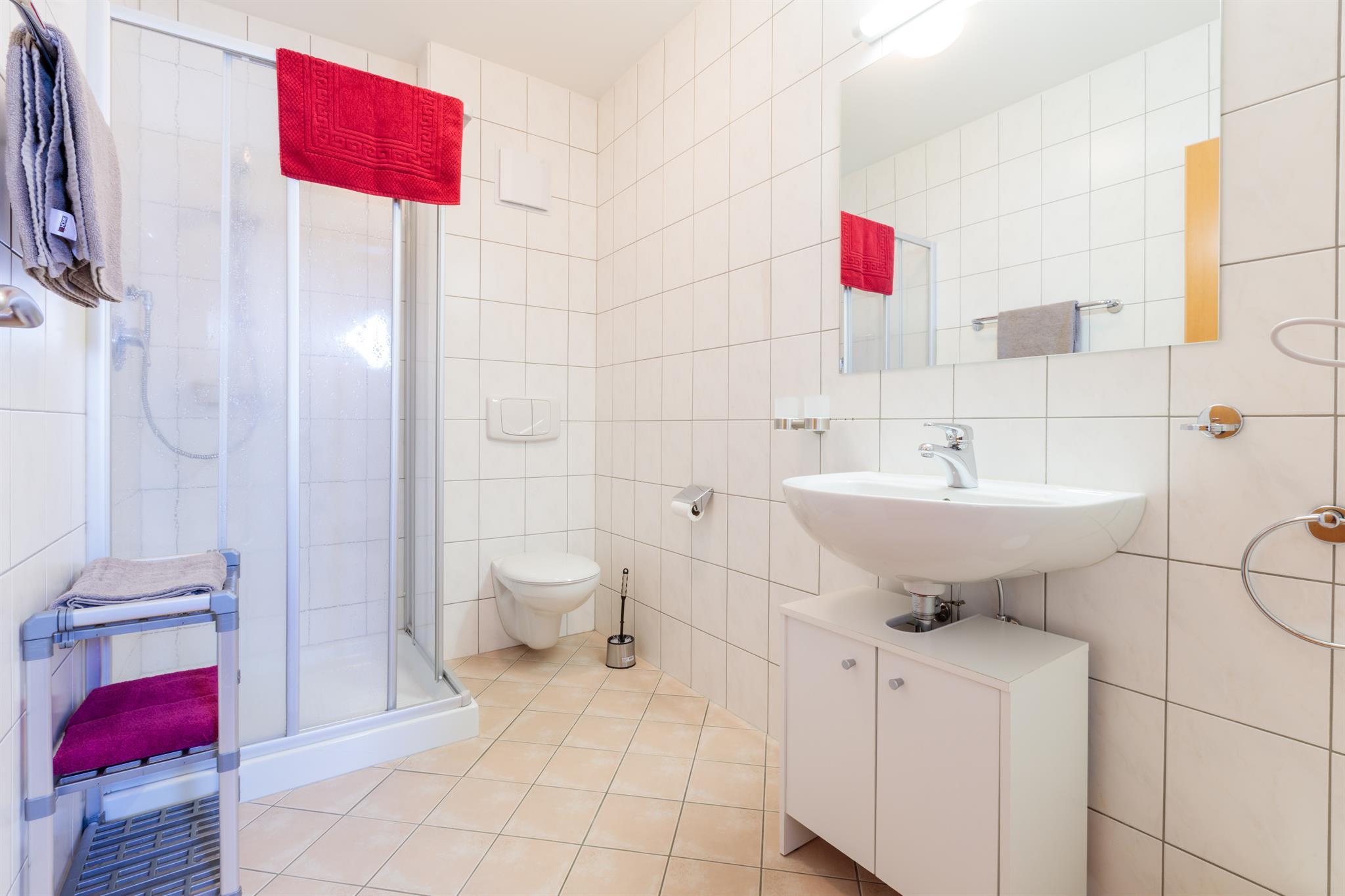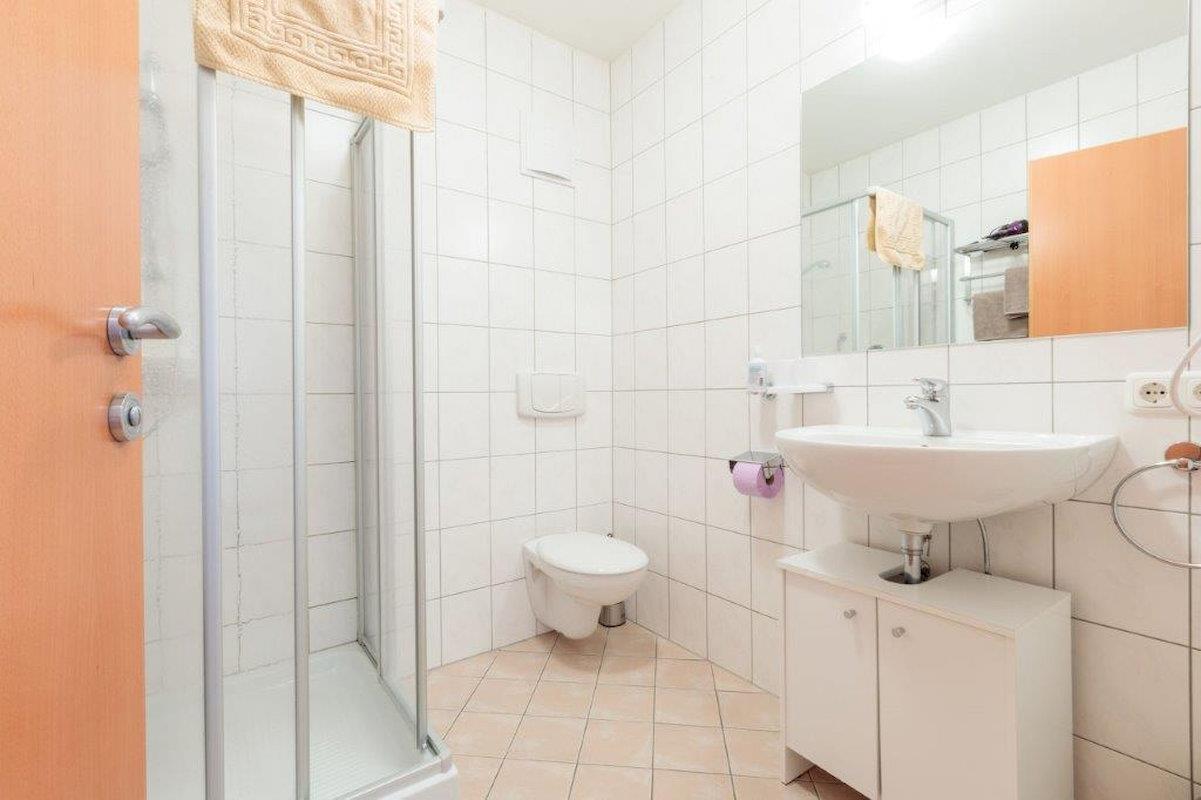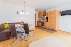 Gemütliches und helles Appartement Conny mit Balkon: 2 getrennte Doppelzimmer, vollausgestattete Wohnküche (Geschirrspüler, Kaffeemaschine, Wasserkocher, Mikrowelle, Toaster und Eierkocher uvm.) mit Essecke, ausziehbarer Couch (Schlafmöglichkeit für 1 weitere Person) und Kabelfernseher, 1 Badezimmer mit Dusche/WC und Föhn, Vorraum mit Garderobe. Größe: ca. 61 m²