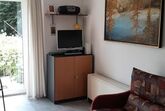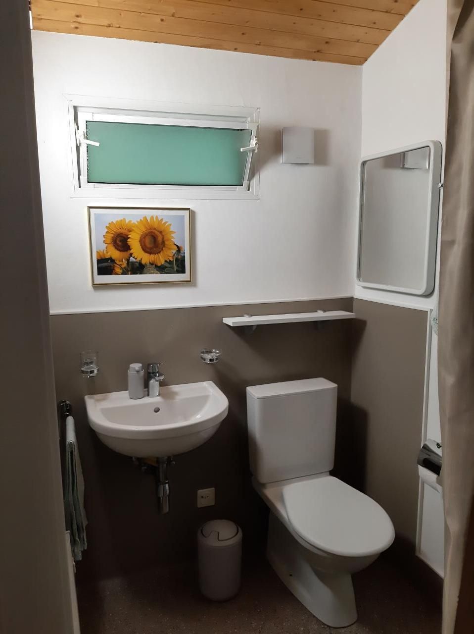 Vom Garten aus gelangt man ins Innere, das (neben der Waschküche, die auch als Atrium dient) zwei Ebenen umfasst: die Wohnebene mit einer voll ausgestatteten offenen Küche (Küchenzeile mit vier Kochplatten - plus zwei weitere Kochplatten, Backofen, Geschirrspüler, Kühlschrank - ein zusätzlicher, größerer Kühlschrank mit Gefrierfach steht in der Waschküche zur Verfügung), Sitzecke (mit TV und Radio), zwei Badezimmer (WC mit Badewanne/Dusche) und die Schlafebene mit Garderobe und zwei Schlafzimmern (ein Doppel- und eines mit zwei Etagenbetten).
