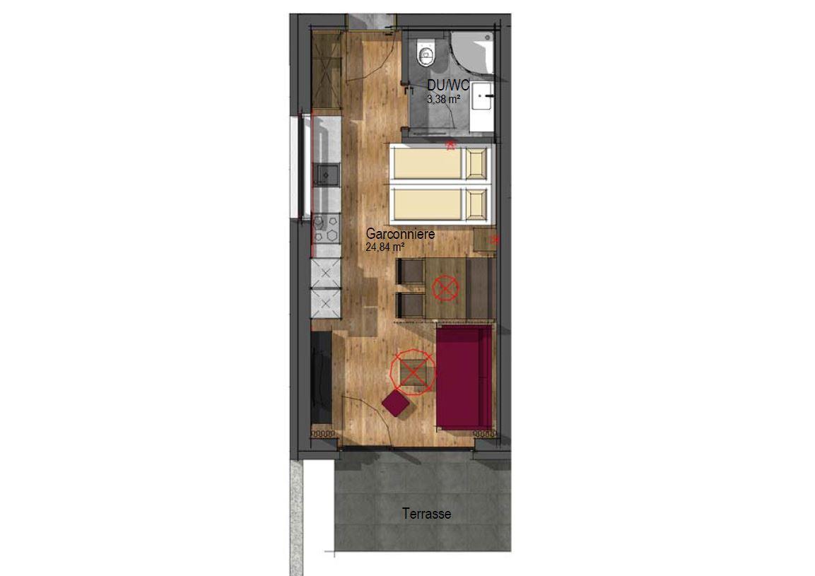 Gemütliches Ein-Raum Appartement mit Wohn- und Schlafbereich, Küchenzeile, Badezimmer und Terrasse