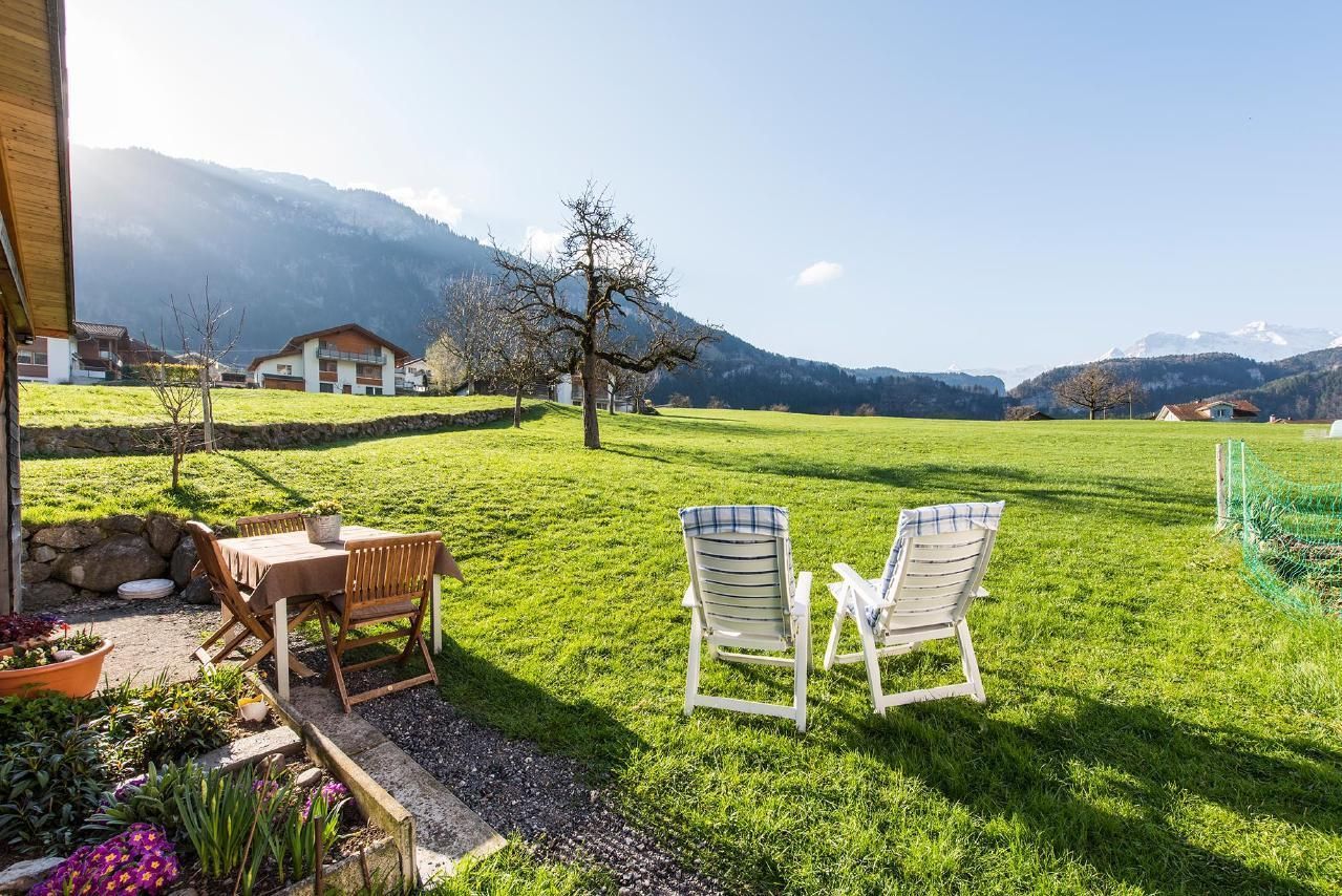 Der Außenbereich unseres Chalets mit Sitzplatz eröffnet Ihnen einen atemberaubenden Blick auf die Alpen und lädt zu Aktivitäten wie Wandern, Angeln, Velofahren oder einfach zum Entspannen ein. Für Kinder gibt es auf unserem Hof und in der Nähe viel zu entdecken, darunter ein Spielplatz mit Trampolin, Spielturm und weitere Attraktionen.