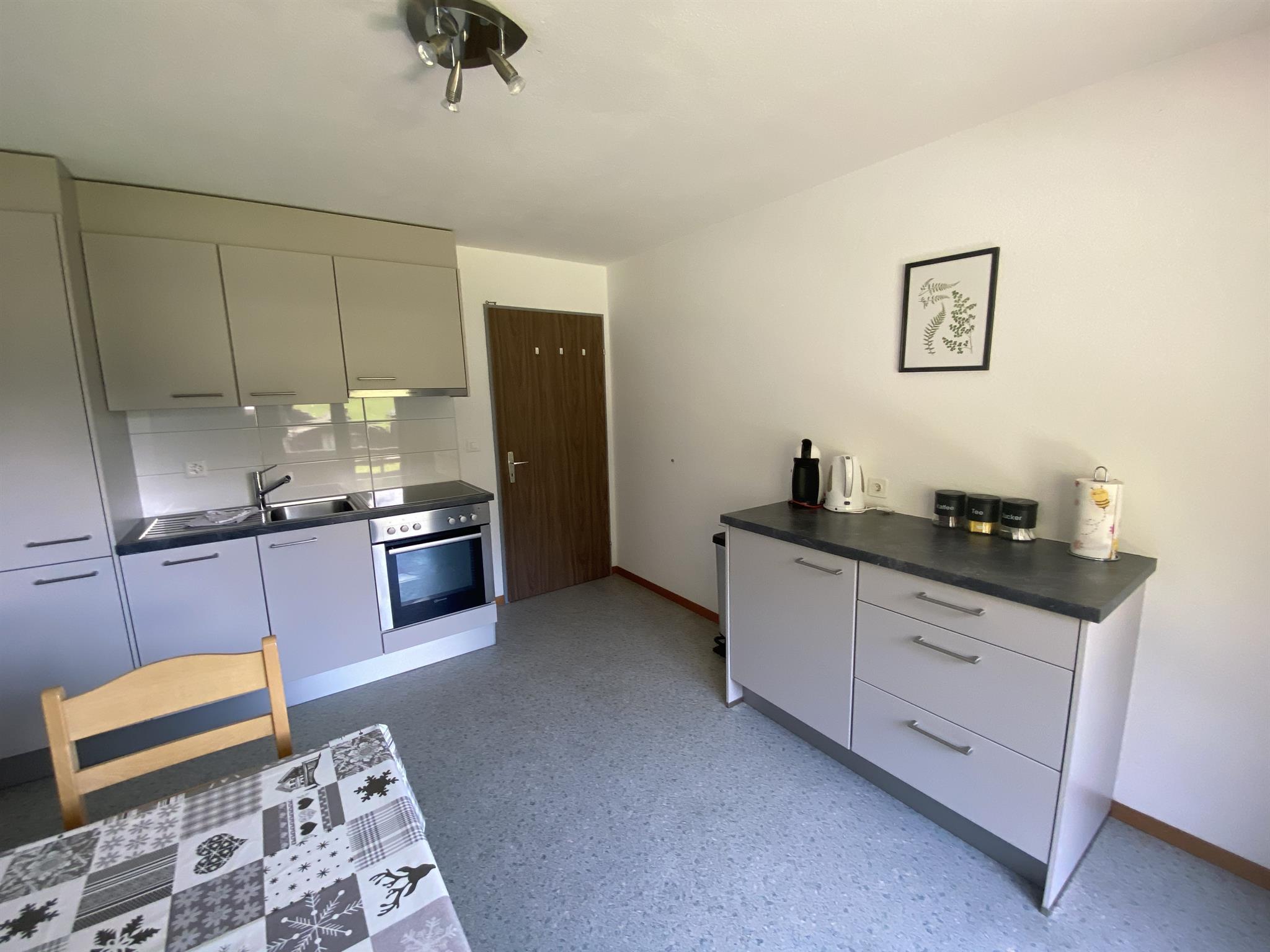 Die geschlossene, gut ausgestattete Küche verfügt über einen Esstisch und ebenfalls Zugang zum Südbalkon. Zur Ausstattung gehören eine Geschirrspülmaschine, eine Kaffeemaschine (Nescafé Dolce Gusto), Fondue-Geschirr und ein Racletteofen – ideal für gemütliche Abende.