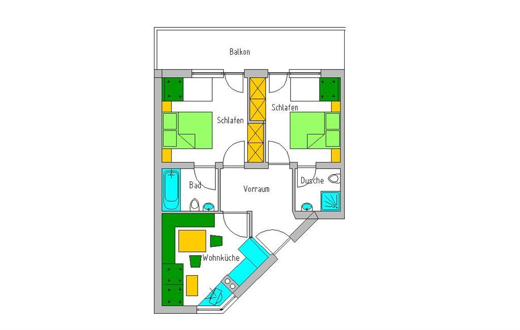 2 Zimmer mit jeweils Dusche/WC, Balkon, komplett eingerichtete Wohnküche mit Geschirrspüler, W-Lan, Kabel-TV im Zimmer und Wohnraum, Föhn und Safe