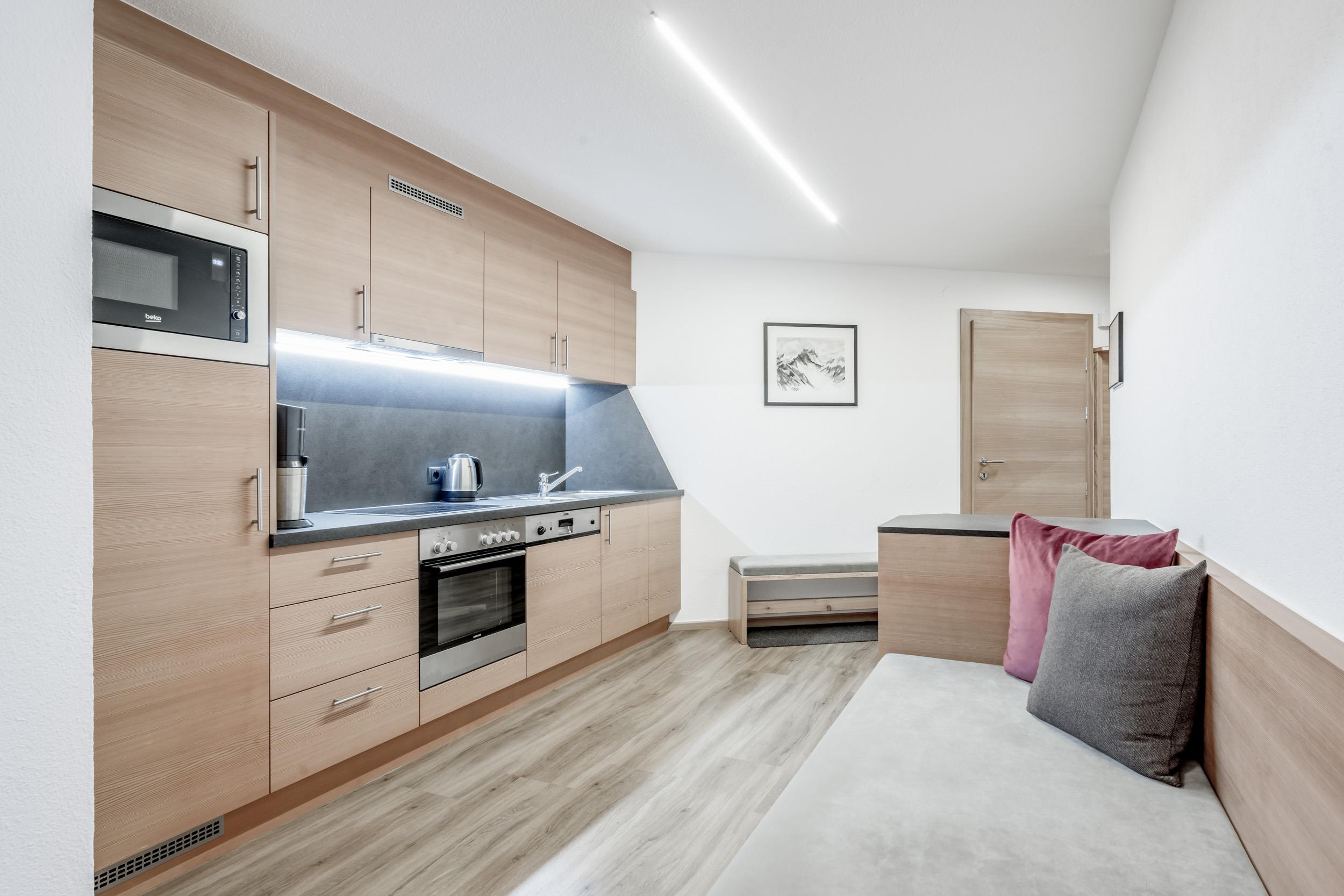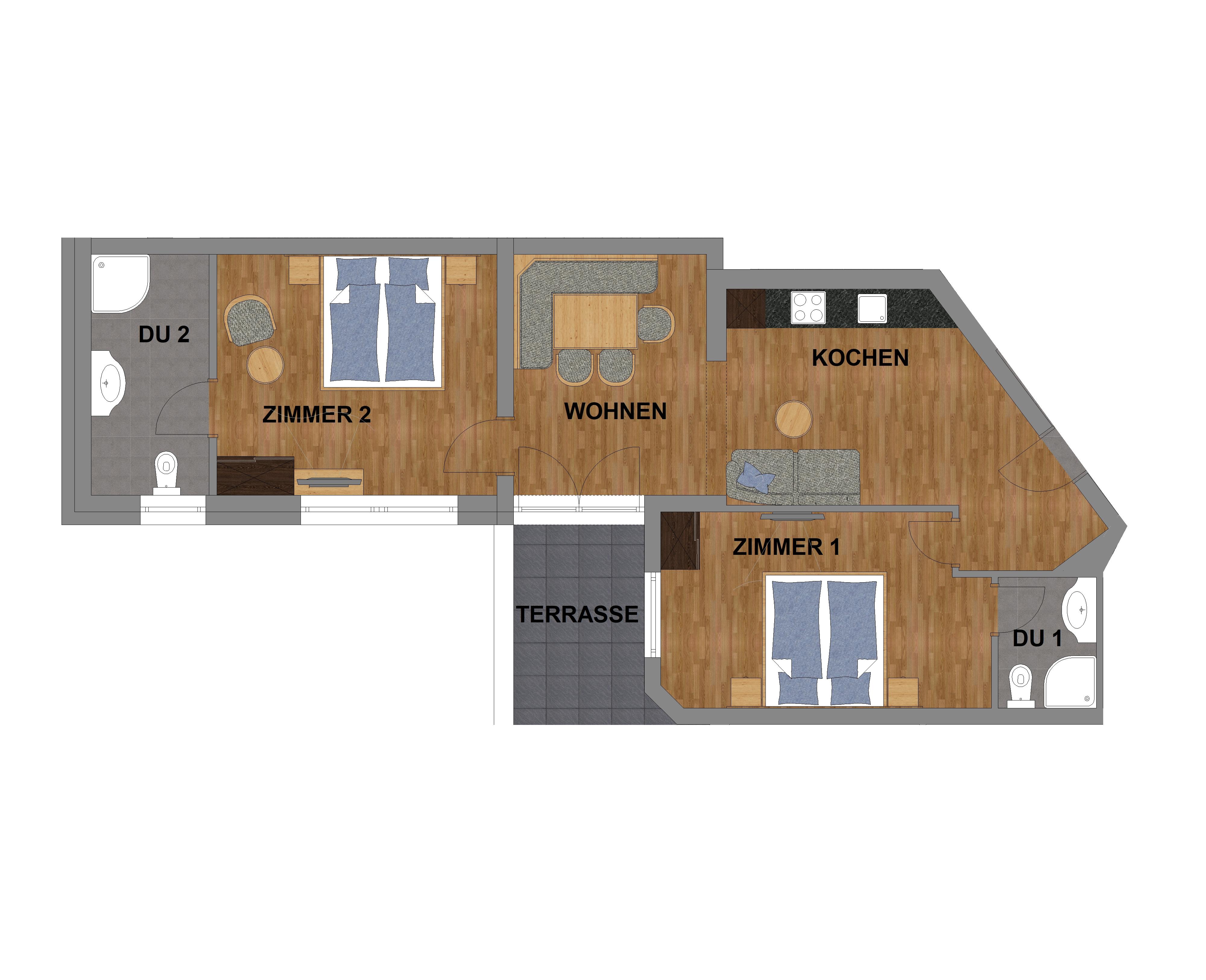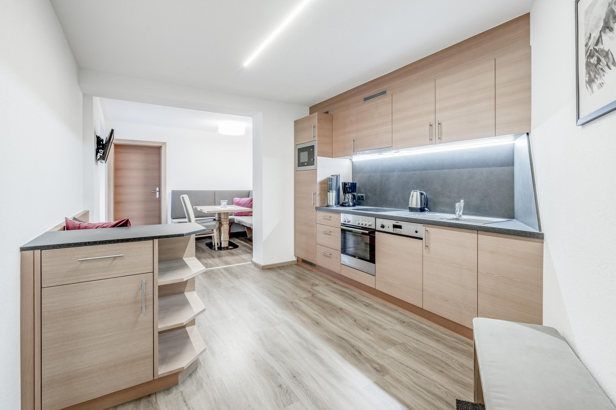 2 Doppelzimmer mit jeweils Dusche/WC und Haarföhn, Terrasse nach Südwest, komplett eingerichtete Wohnküche mit Backofen, Geschirrspüler, Mikrowelle,... W-Lan, Safe, Kabel-TV im Zimmern und Wohnraum.