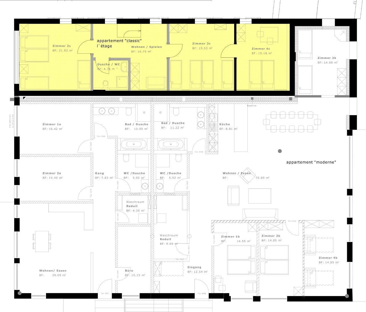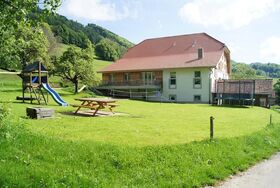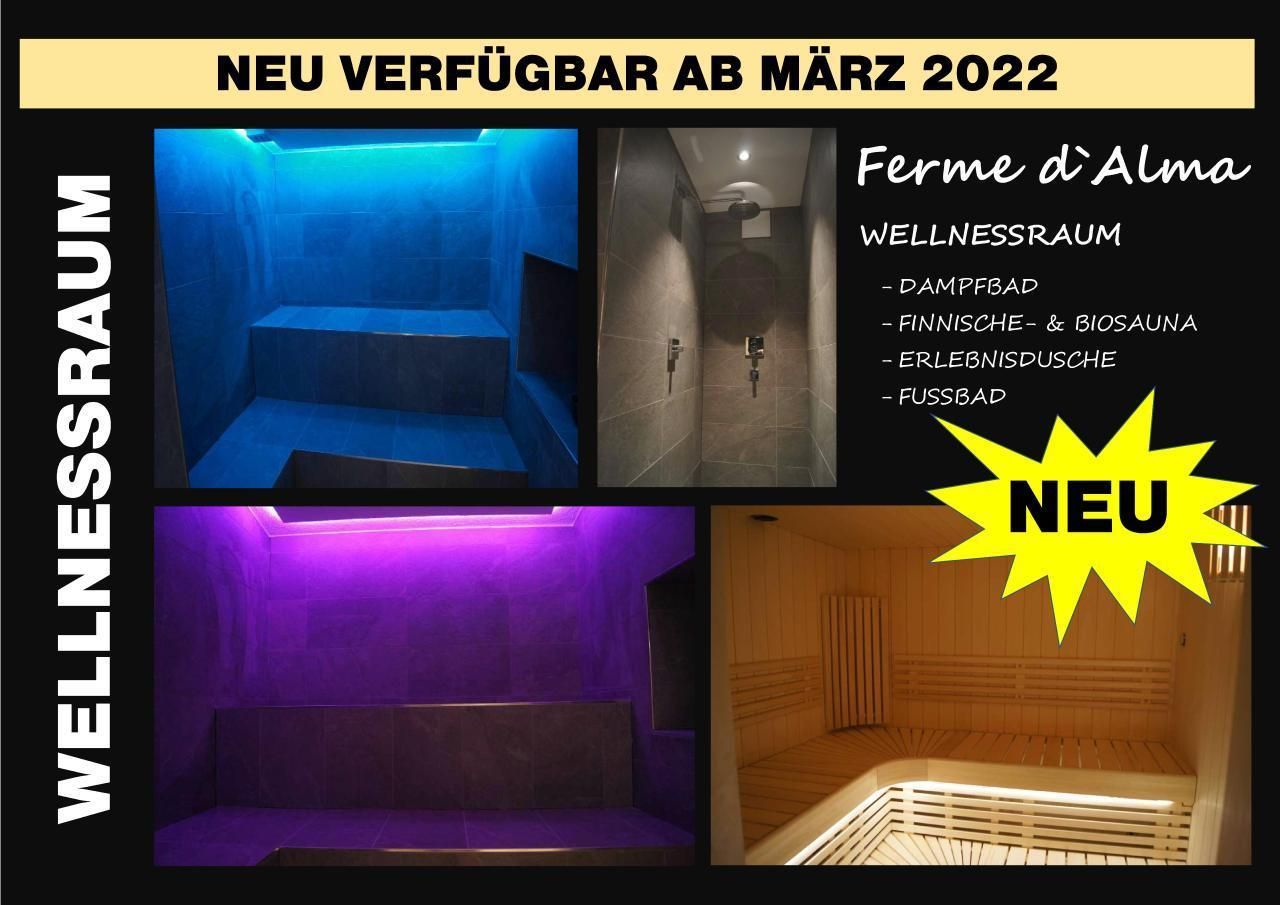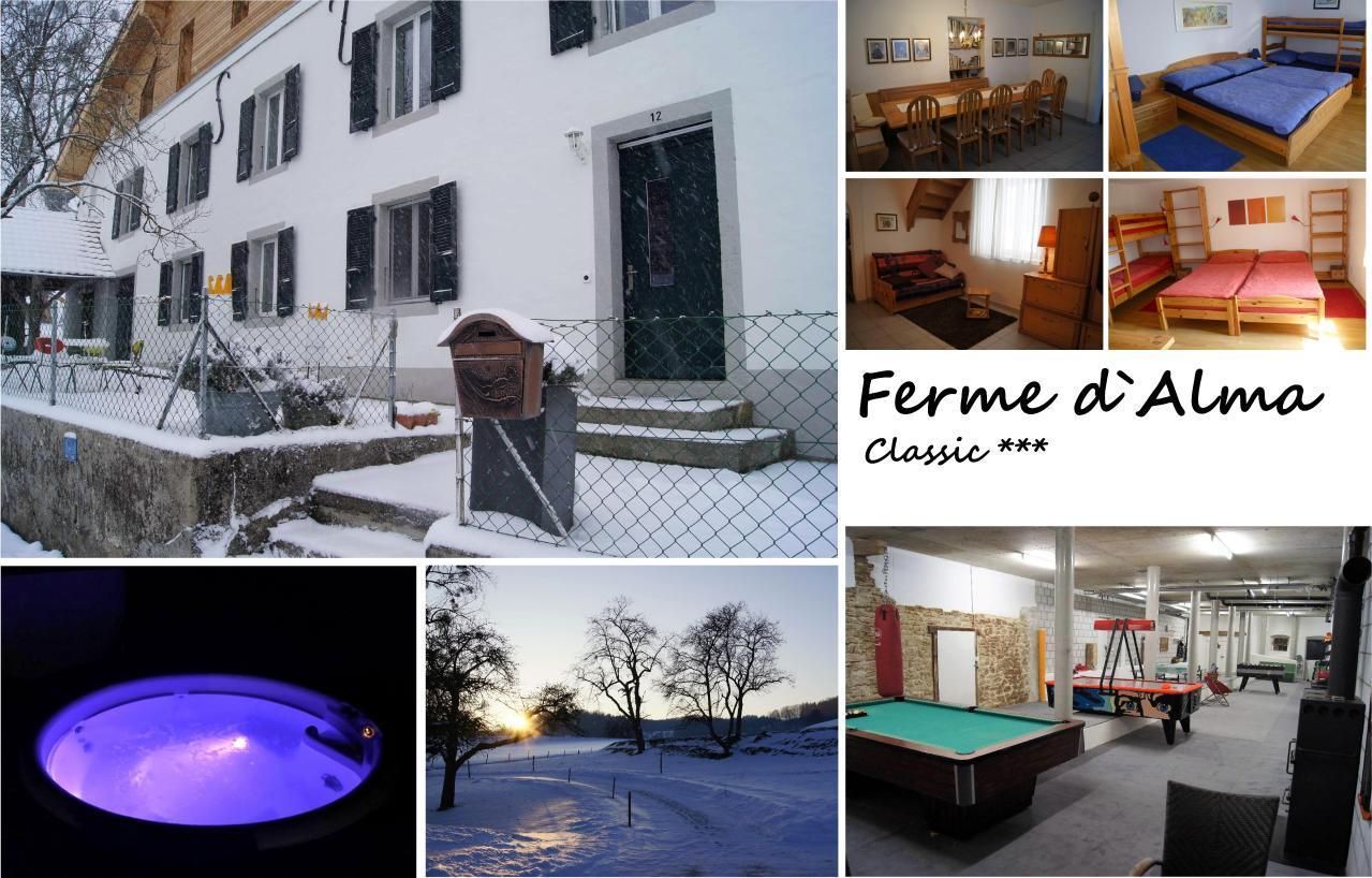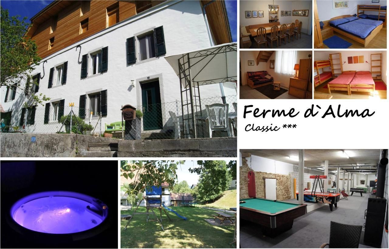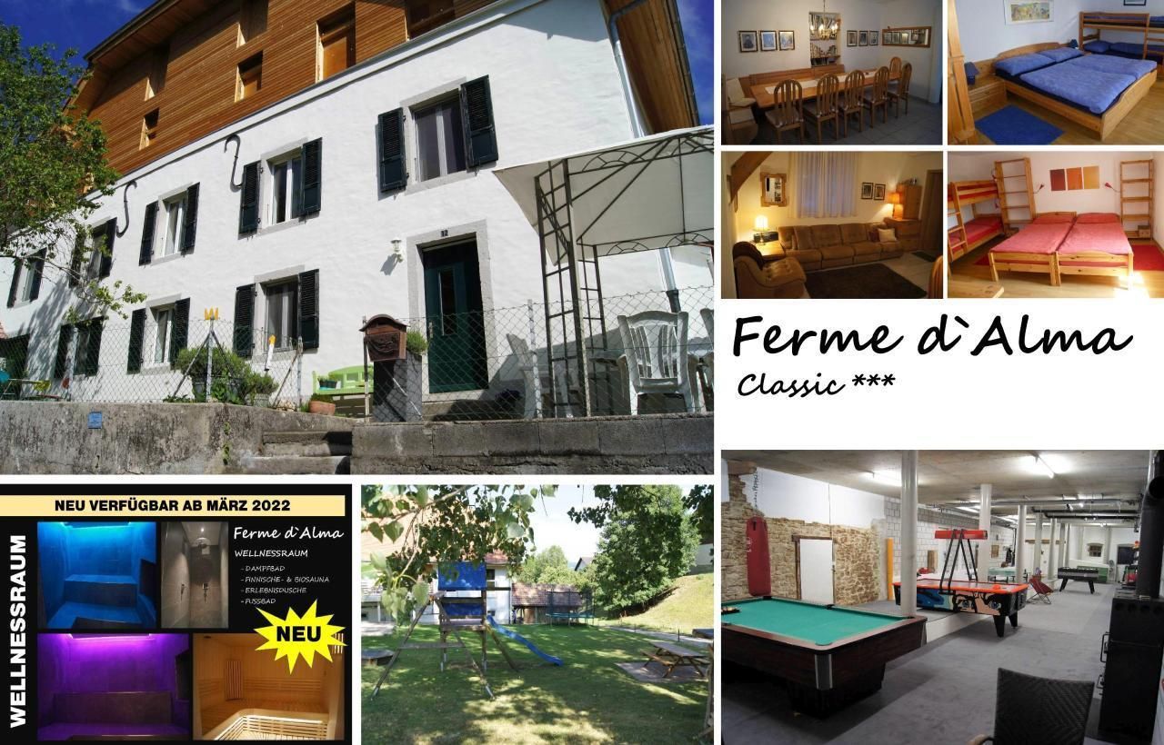 Das im idyllischen und persönlichen Juradörfchen Seleute gelegene Ferienhaus Ferme d' Alma bietet neben einer exklusiven Ausstattung viele Extras und Annehmlichkeiten. In der zweistöckigen Ferienwohnung Classic können Sie sich mit insgesamt 13 Personen in 4 liebevoll eingerichteten Schlafzimmern aufhalten und in auf beiden Stockwerken vorhandenen Badezimmern frisch machen. Die im Erdgeschoss gelegene Küche bietet alles was eine vollumfängliche Verköstigung aller Gäste benötigt. Angrenzend das Wohn-/Esszimmer mit grossem Tisch und Eckbank lädt ausserdem durch das gemütlich gehaltene Mobiliar zum Entspannen und Erholen ein. Im durch die Küche direkt zugänglichen Kellerraum finden Sie verschiedenste Spiele und Freizeitausrüstungen für Spiel und Sport (Velos + Helme, Tischfussball, Tischtennis, etc.). Im grossen Garten finden Sie vom Grillplatz über Spiel- und Sportflächen alles was Sie brauchen. Auch ein Aussenwhirlpool und ein top moderner Wellnessraum steht Ihnen auf Anfrage (nicht in Preis inbegriffen) zur Verfügung. Für Freizeitaktivitäten empfiehlt sich ausserdem das nahegelegene historische Städtchen St. Ursanne welches nur gerade 6km entfernt liegt, wo Sie sich im das Städtchen durchfliessenden Fluss Doubs dem Badespass, Kanu- und Schlauchbootfahrten, Entdeckungstouren oder einfach einem gemütlichen Picknick hingeben können.