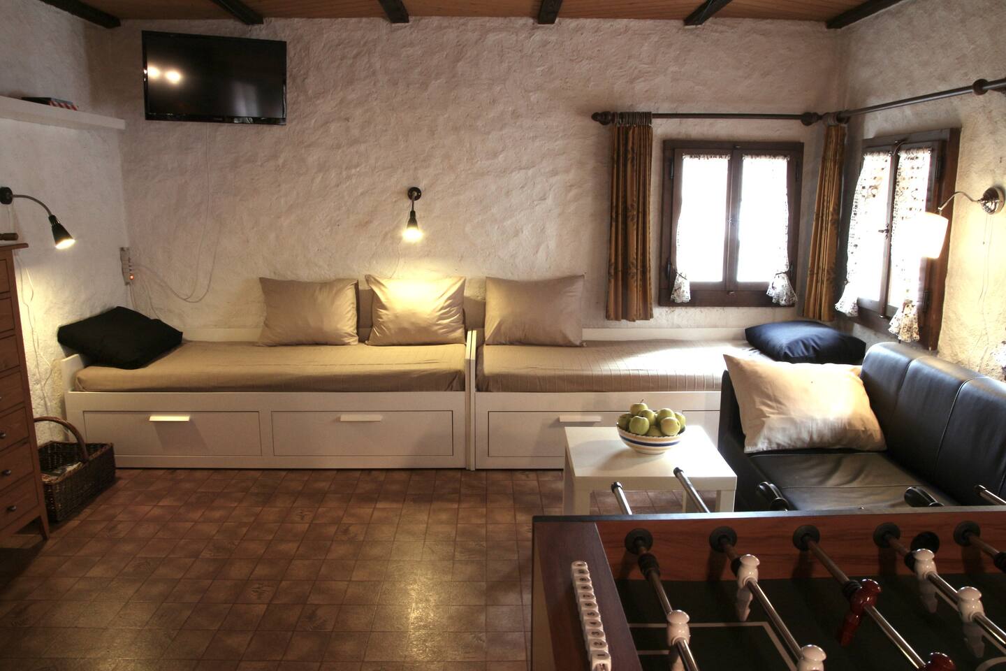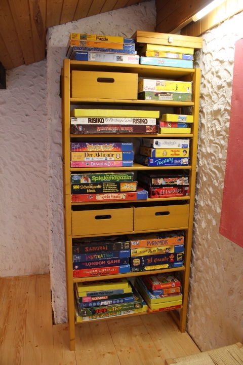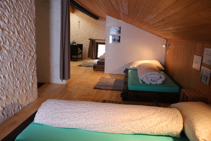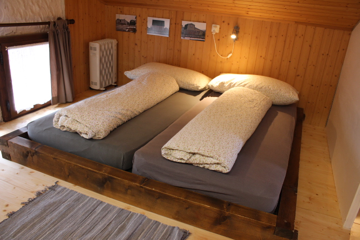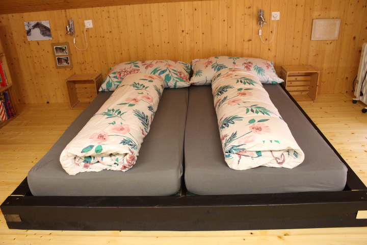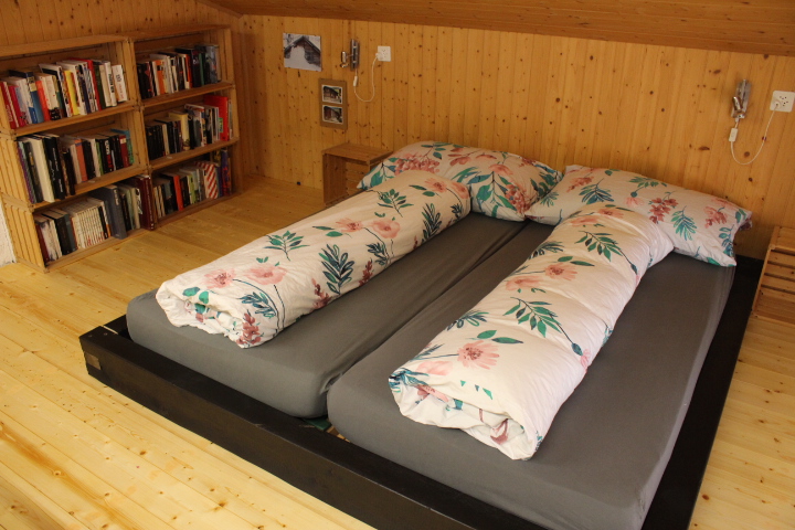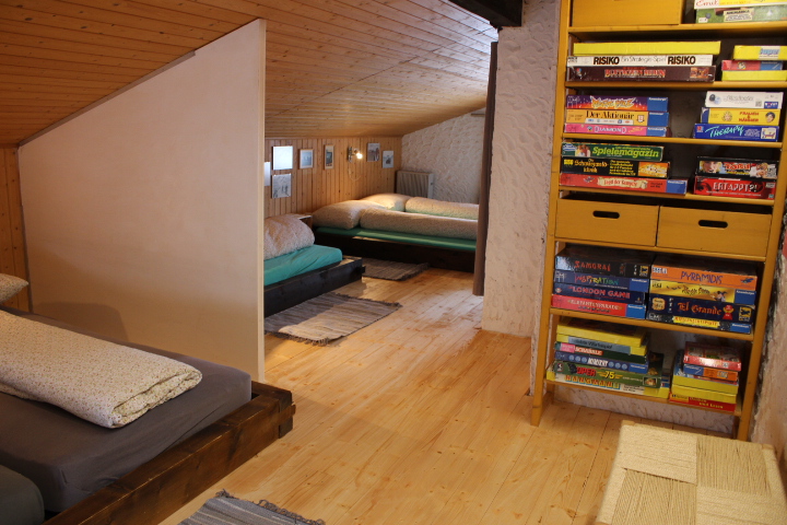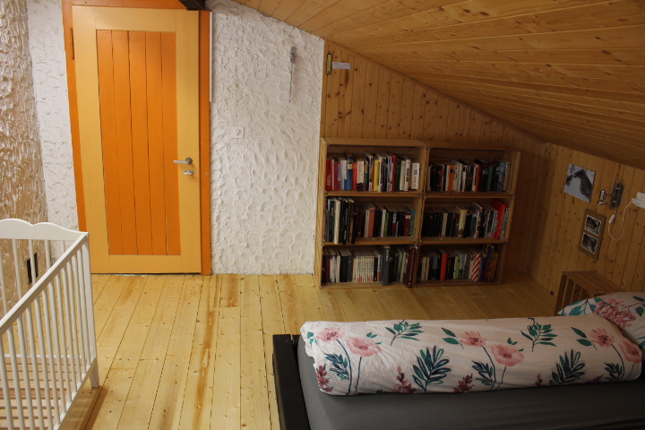 Im Dachgeschoss befinden sich ein ad mit Dusche, Waschbecken und Toilette. Die zwei Schlafzimmer (1x5, 1x2) haben bodenebene Betten, welche sich gemütlich unter der Dachschräge einnisten. In den Regalen hat es Bücher und Brettspiele. Ebenso gibt es ein TV (ohne Kabelanschluss) mit einer DVD-Auswahl.