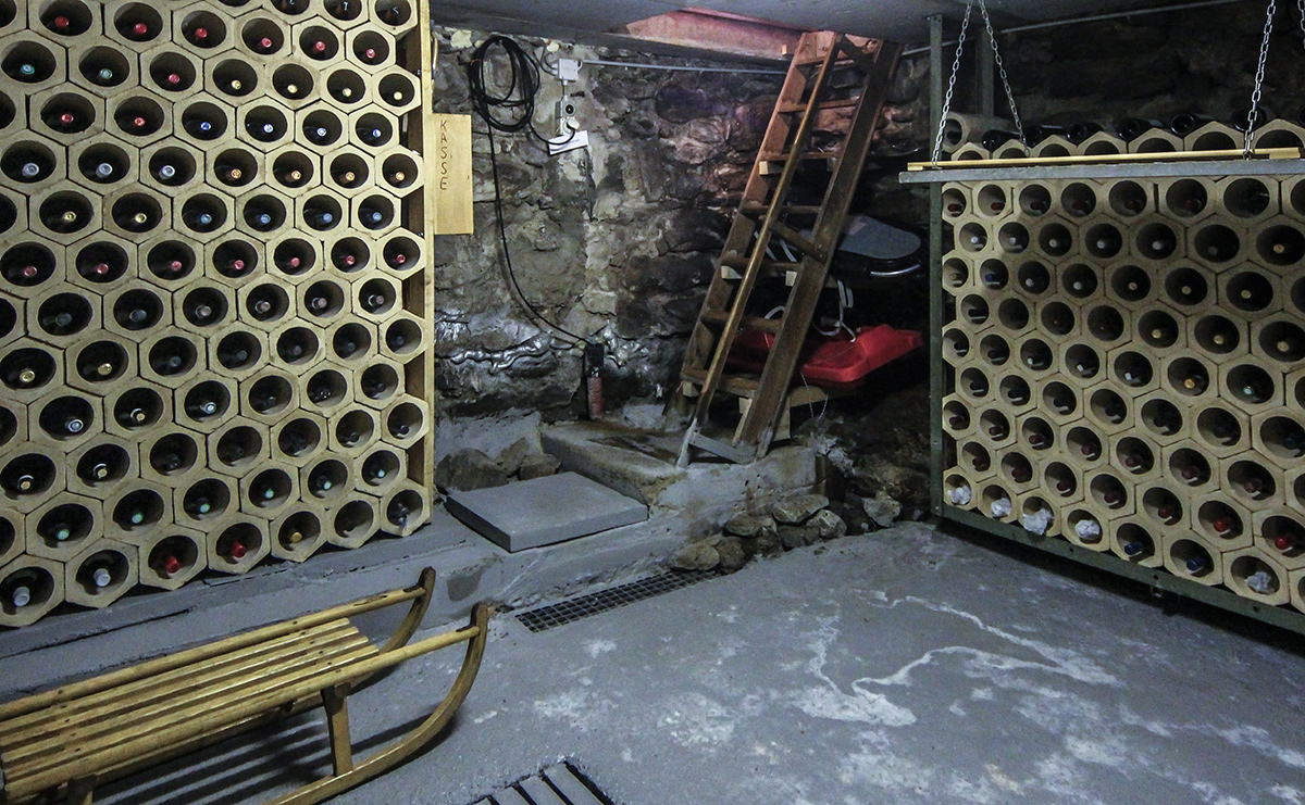 Durch einen Lukendeckel im Boden gelangen Sie in den Naturkeller, wo Vorrat und Material gut gelagert werden kann. In einem Weingestell gibt es eine schöne Auswahl von Weinen aus der ganzen Welt. Der Weinkeller ist für die Gäste geöffnet (gegen Bezahlung).