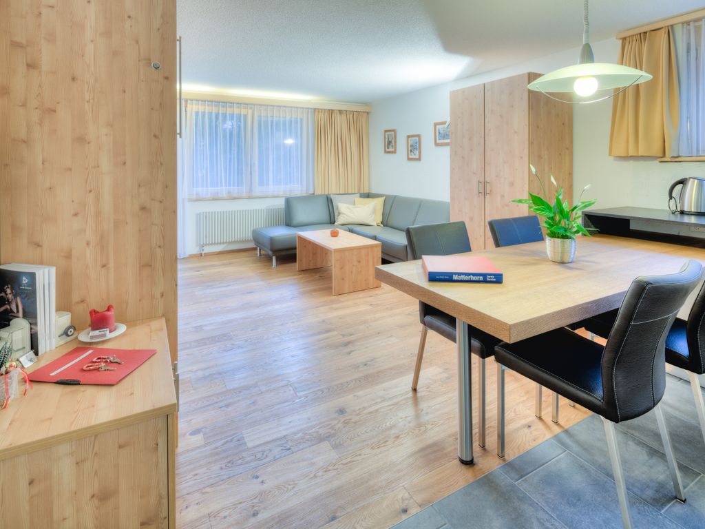 1 Schlafraum, Babybett, Babybett im Zimmer, Babyhochstuhl, Backofen, Balkon, DVD-Player, Fondue-Set, Garten, Geschirrspüler, Haustiere erlaubt, Internetverbindung, Kaffeemaschine, Kinderbett, Kochnische, Kombinierter Wohn- und Schlafbereich, Küche, Küchenwäsche, Kühlschrank, Matterhornblick, Raclette-Set, Radio, Terrasse, Tisch- und Küchenwäsche, TV, Wäschetrockner, Wäschetrockner im Haus, Waschmaschine, Waschmaschine im Haus, Wasserkocher, WiFi, Zustellbett