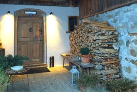 Die Terrasse mit traumhafter Aussicht in die Bergwelt verfügt über modernes Gartenmobiliar inkl. Sonnenschirm. Im Garten stehen zwei Loungesessel, eine Liege und ein Bistrotisch mit Stühlen. Der renovierte, ehemalige Geissenstall bietet Platz für Velos, Skiutensilien und dergleichen.