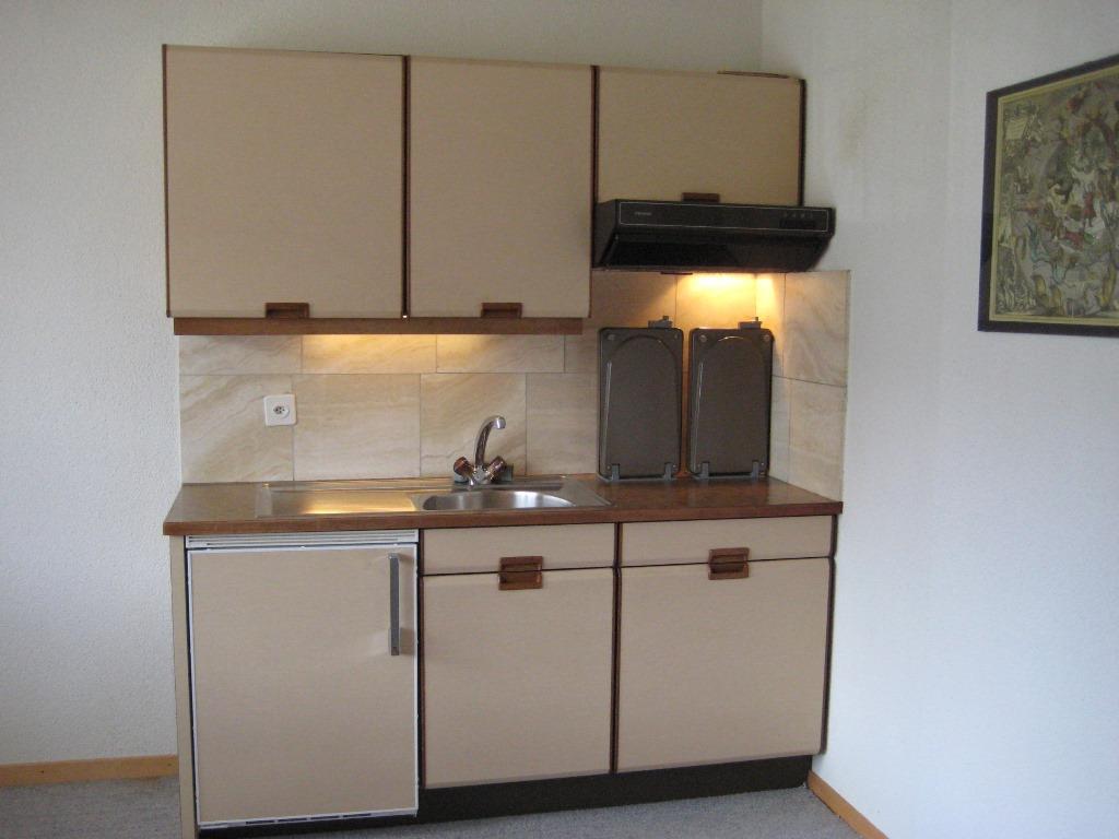 Kleine Wohnung mit Kochgelegenheit im Wohnzimmer, 1 Schlafzimmer mit Kajütenbett und 1 Badezimmer mit Douche. Ein zusätzliches Bett im Wohnzimmer bietet eine weitere Schlafmöglichkeit. In der Küche ist ein Fonduegeschirr vorhanden, nicht aber ein Racletteofen.