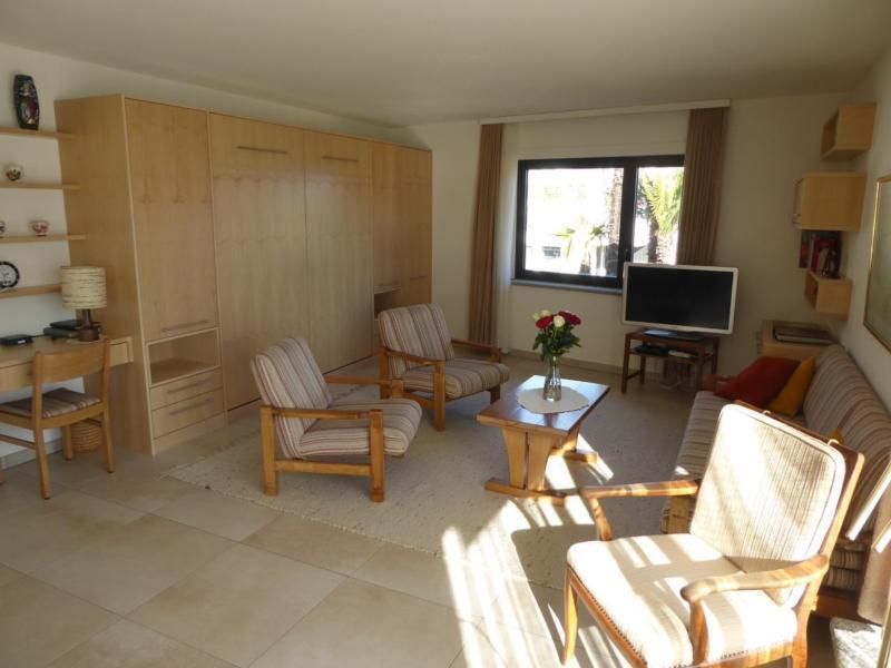 Hinter dem Haus lädt ein grosser Garten (800 m2), umgeben von Bäumen und Palmen mit Granittisch, Granitbank unter einer Pergola und Grillstelle zum Verweilen ein. Dieser Garten mit Tischtennistisch, Kletterturm mit Rutschbahn, Schaukel und Sandkasten ist auch eine ideale Spielwiese für Kinder. Im Frühjahr 2023 haben wir den Garten neu gestaltet (Anhebung des Terrains, Neuansaat Rasen, Pergola).