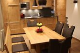 Sehr helles Apartment mit Panoramafenstern und 2 Balkonen mit Traumblick auf die Berge und die Bergbahn. Zwei Schlafzimmer mit Doppelbett, separaten Matratzen und jeweils eigenem Zugang zum großen Badezimmer. Gemütliches Wohnzimmer mit Ausziehcouch und Effektkamin, Sat-TV inkl. Radio, CD- DVD Player. Vollausgestatteter, offener Küchenbereich, großer Esstisch mit Sitzbank. Vom Wohn/Küchenbereich Zugang zum südwestseitigen Panoramabalkon. Von beiden Schlafzimmern Zugang zum ostseitigen Balkon. Geräumiges Badezimmer mit begehbarer Dusche, Badewanne mit Lichtspiel, Fön, Kosmetikspiegel und eigener Infrarotkabine mit Lichttherapie.