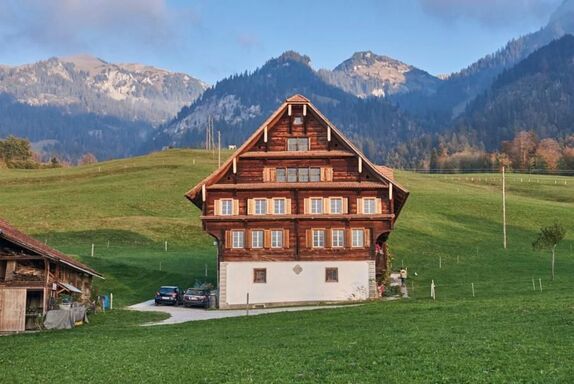 Garten: Der Umschwung umfasst das ganze Heimet. Ein Sitzplatz neben dem Eingang erlaubt den Aufenthalt im Freien. Neben dem Haus liegt ein Kuhstall mit Heustock. Wir bitten Sie aus Rücksicht auf die Tiere und aus feuerpolizeilichen Gründen auf dem gesamten Hofgelände nicht zu rauchen.