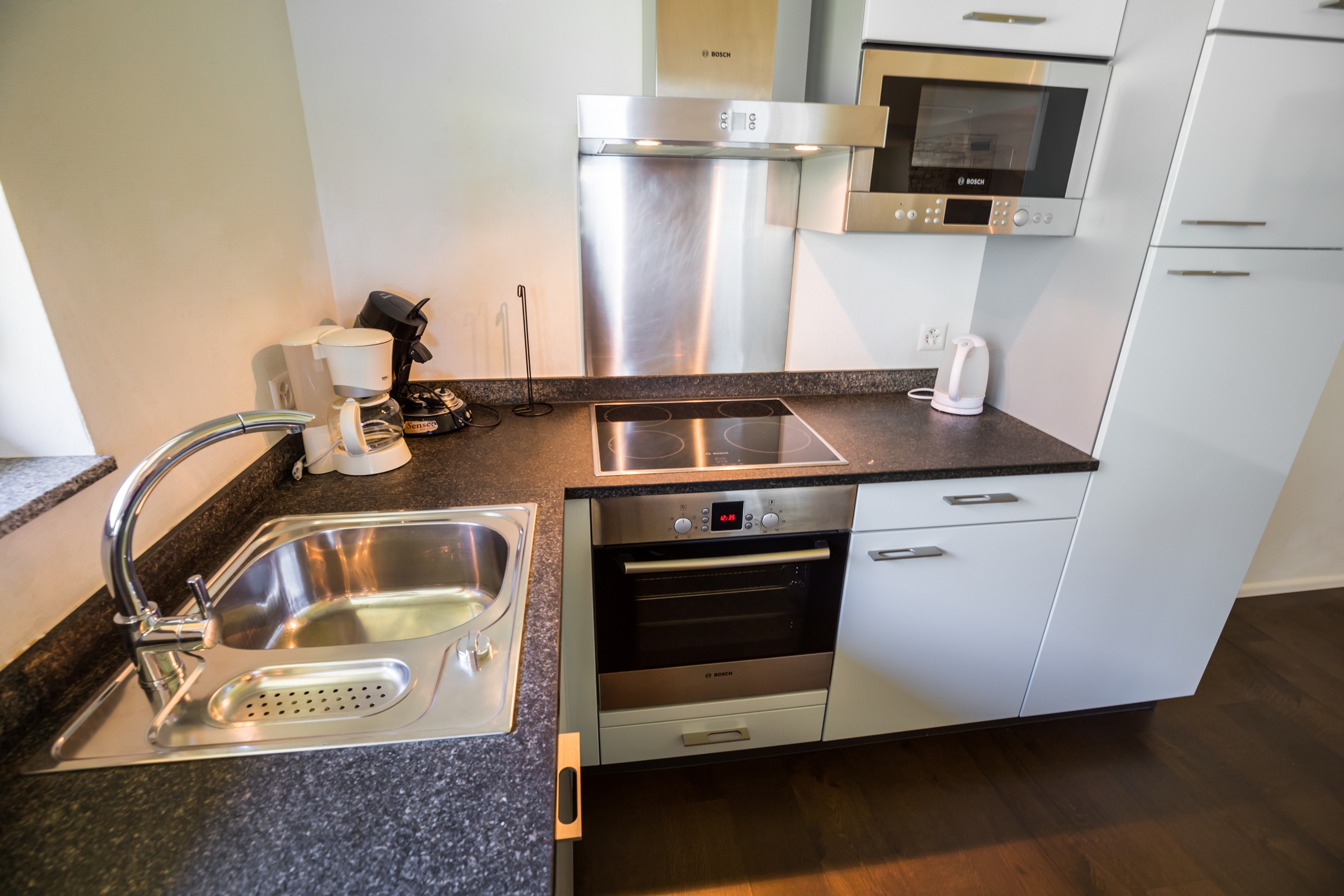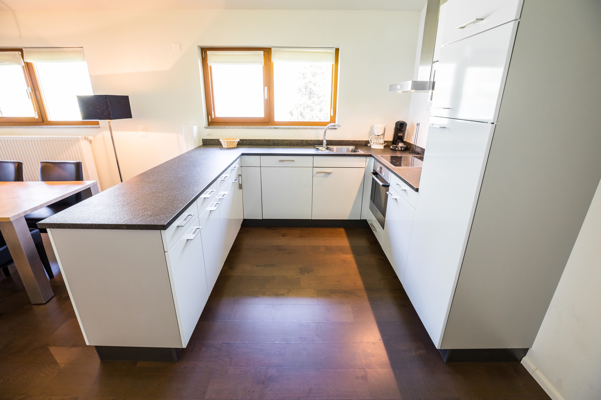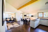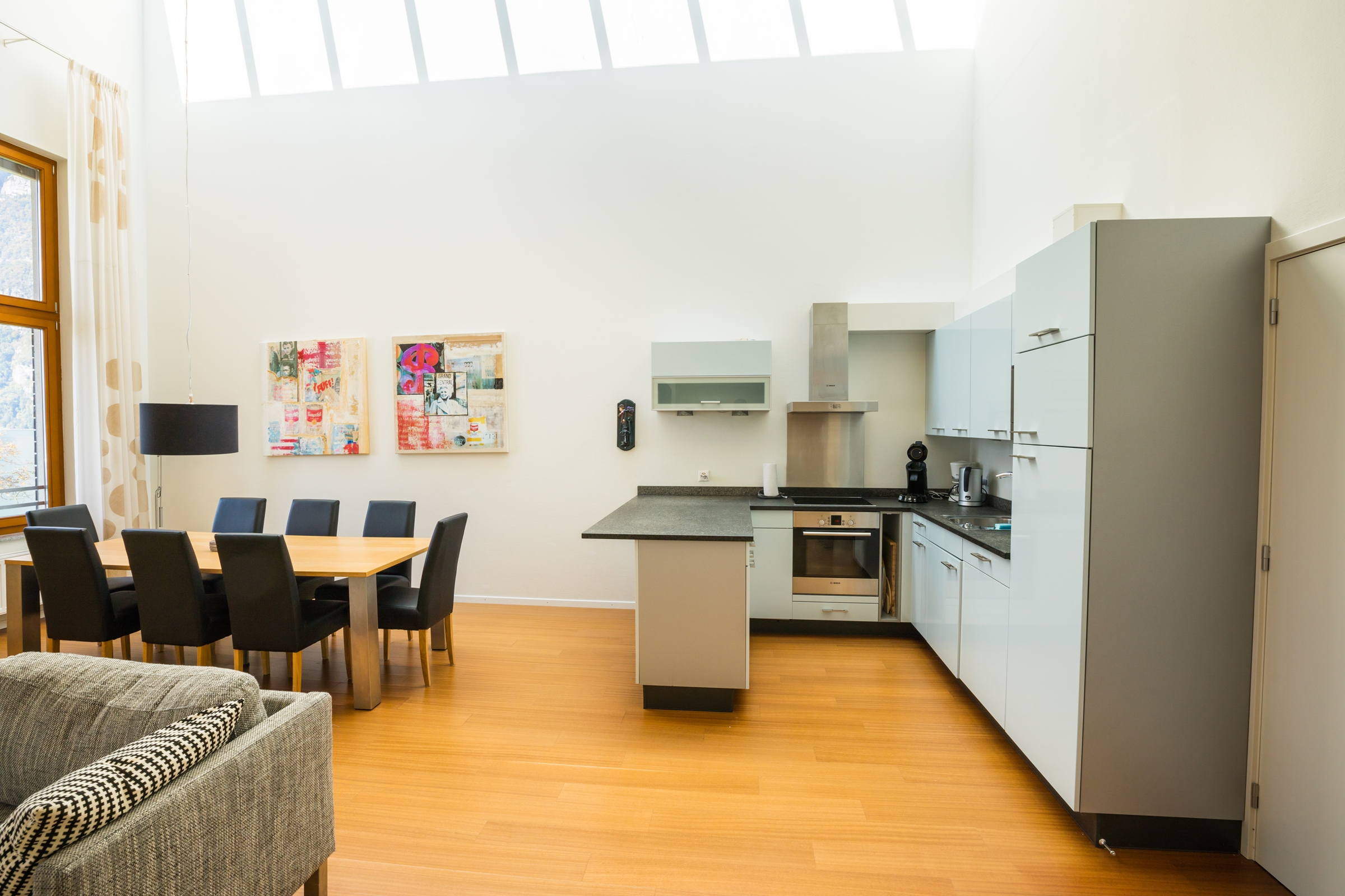 ein Wohn- und Esszimmer eine offene und moderne Küche mit Nespresso Kapselmaschine Inneneinrichtung