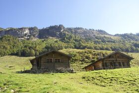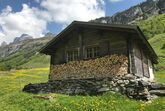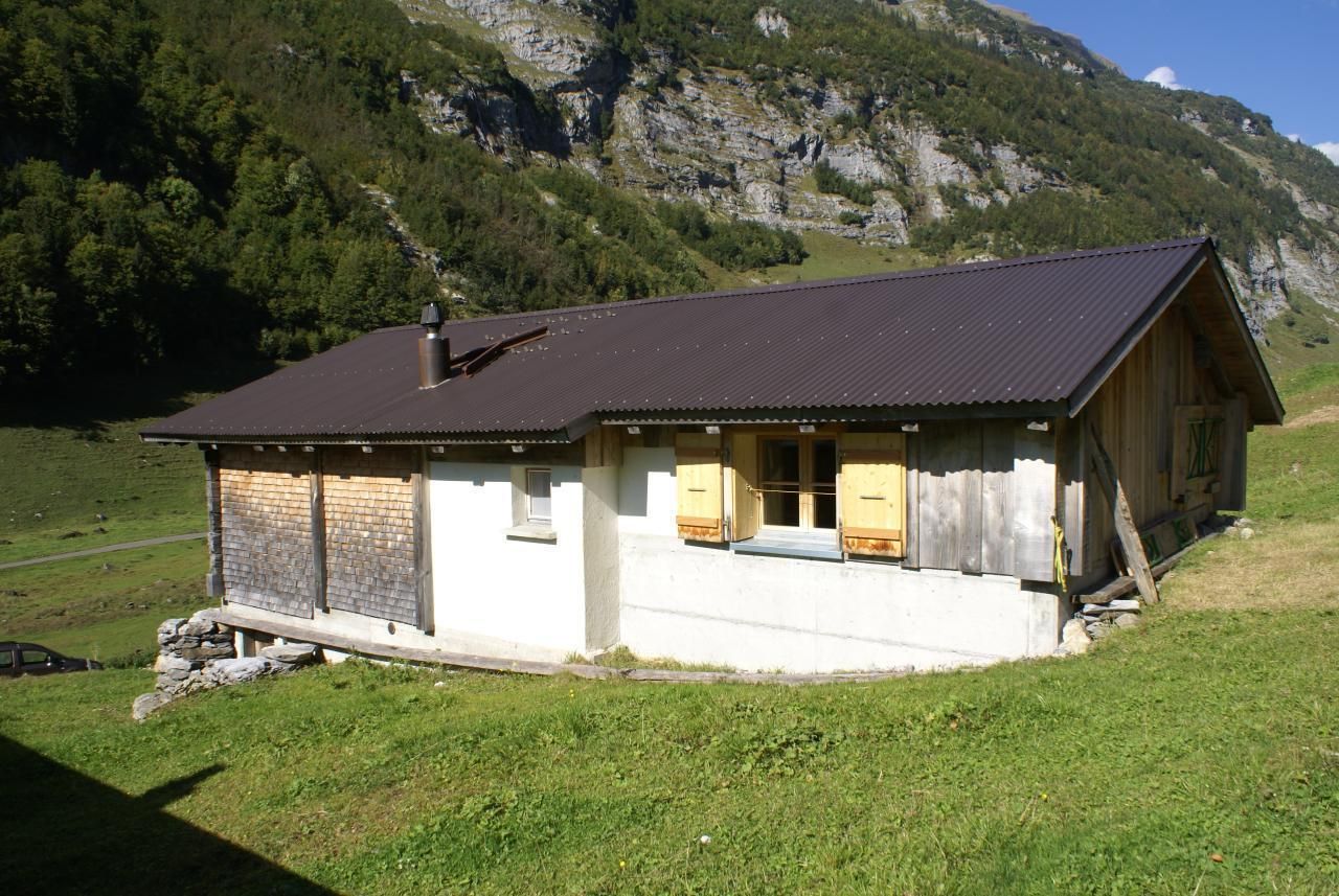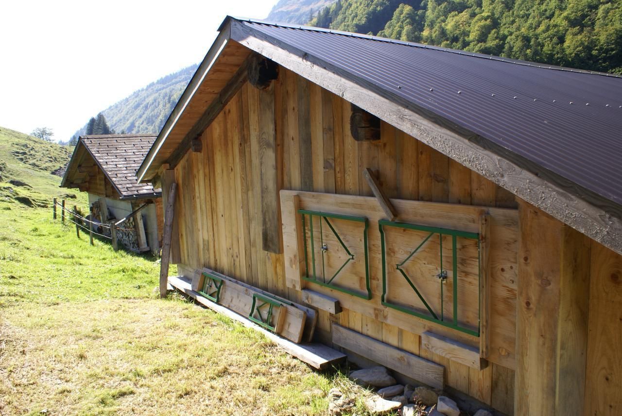 Die Alphütte ist im typischen Chaletstil der Region erbaut mit einem Wohn- und einem Stallteil.