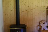 Der Wohnraum ist ausgestattet mit einer Wohnküche, Esstisch einem Kajütenbett und einem Schwedenofen.