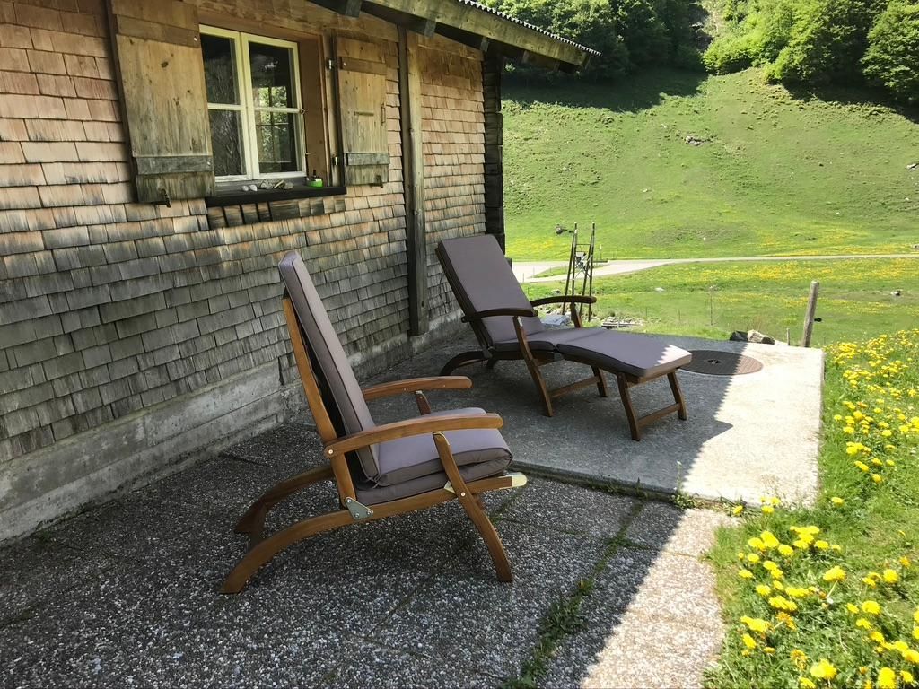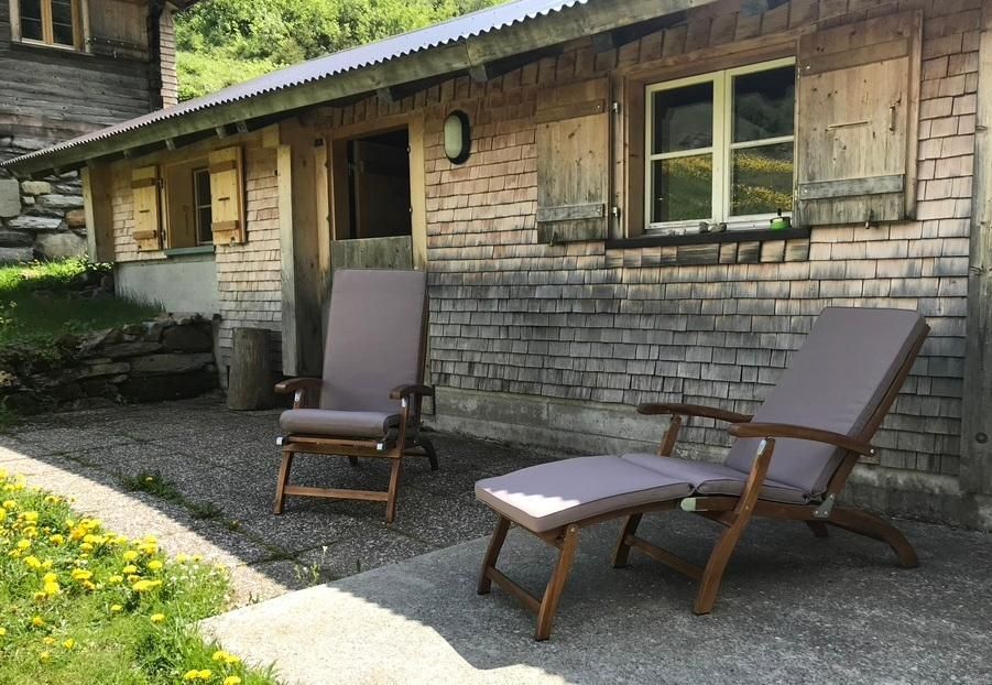 Die Alphütte verfügt über zwei komfortable Deckchairstühle (Liegestühle mit Polster), die sowohl drinnen als Lesestühle, wie auch draussen als Liegestühle benutzt werden können.