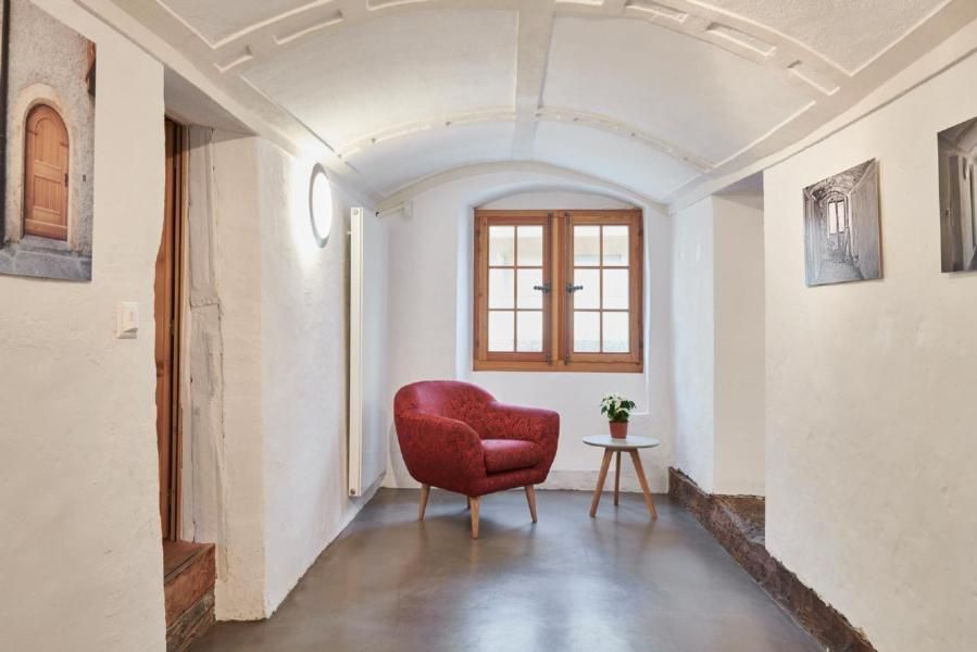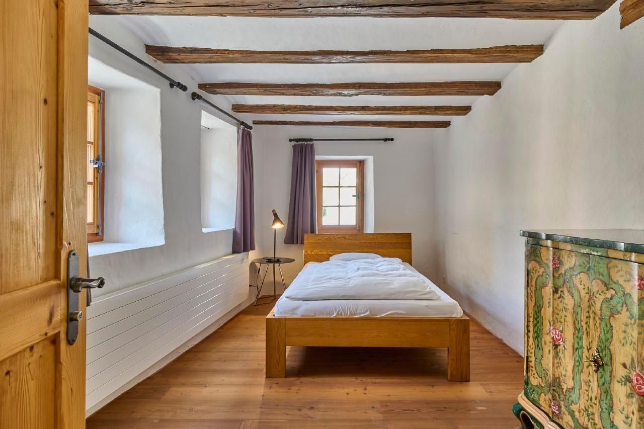 Anzahl Personen 4-6: Es ist ein Babybett (bis 2 Jahre) vorhanden. Das Haus bietet Platz für vier bis sechs Gäste (plus Baby). Das Haus wird durch das grosse Tor durch die Passage hindurch rechts betreten. Im Treppenhaus, welches sich wie eine Wirbelsäule durch das Haus schlängelt geht es in die Küche ab. Im Obergeschoss finden sich das Wohn/Esszimmer und die zwei Einzelzimmer im Erdgeschoss das Doppelzimmer mit einem zusätzlichen Bettsofa. Auf dem Zwischengeschossen findet sich jeweils die Dusche/WC. Die Böden bestehen aus Holz und Stein weshalb wir gute Hausschuhe empfehlen.