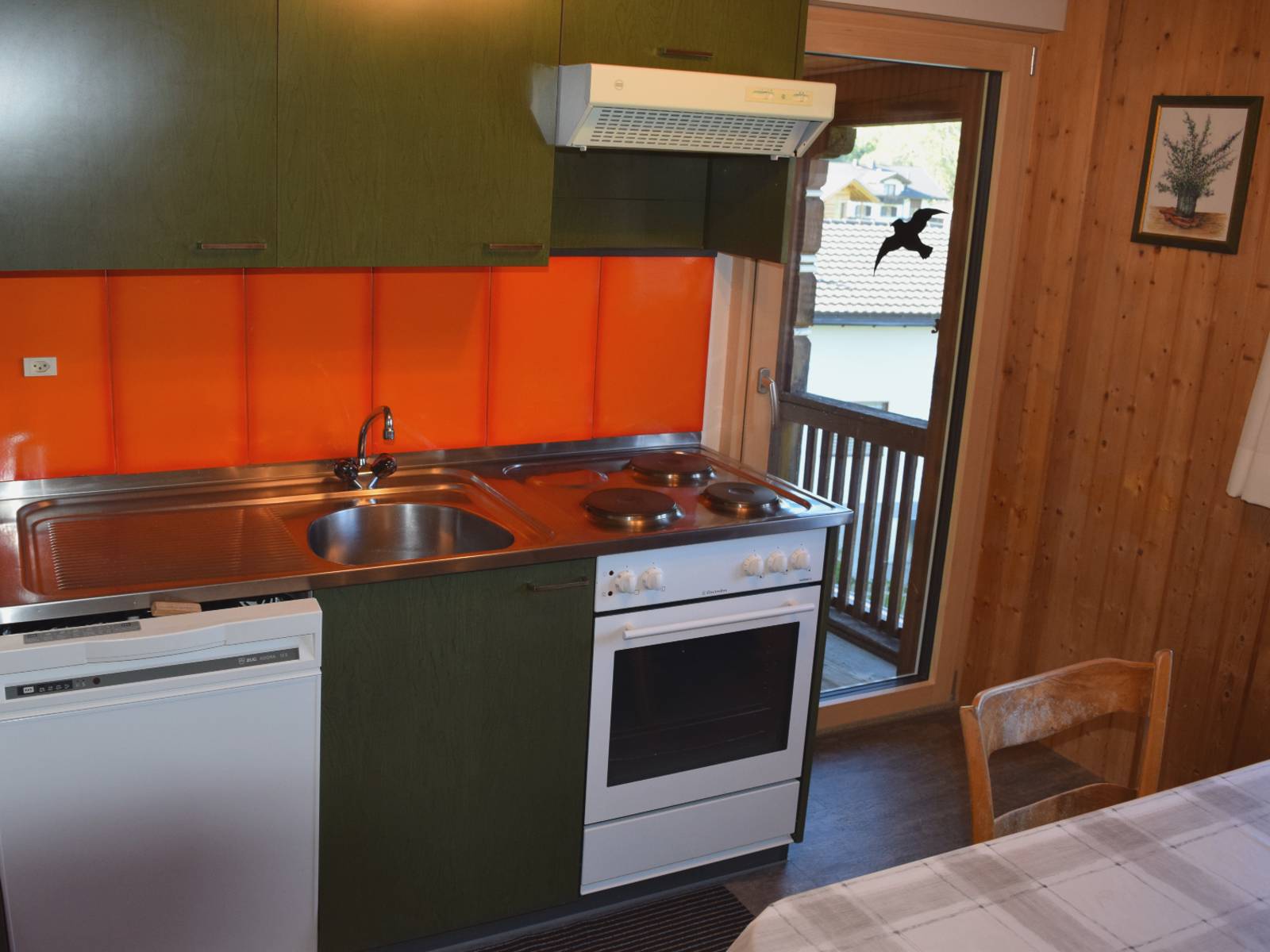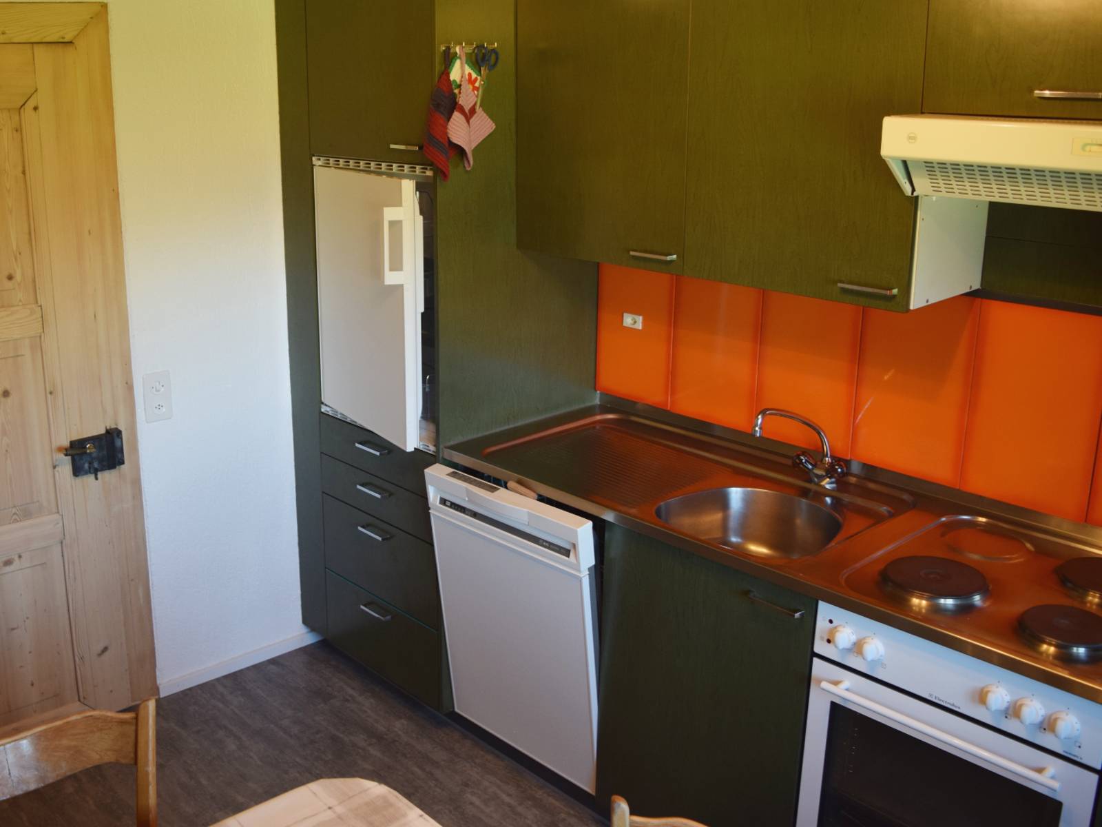Wohnküche mit kleinem Balkon. Elektkroherd mit Backofen, Mikrowelle, Geschirrspüler, Kühlschrank, Espresso-Kaffeemaschine, Sitzecke mit grossem EsstischBadezimmer: