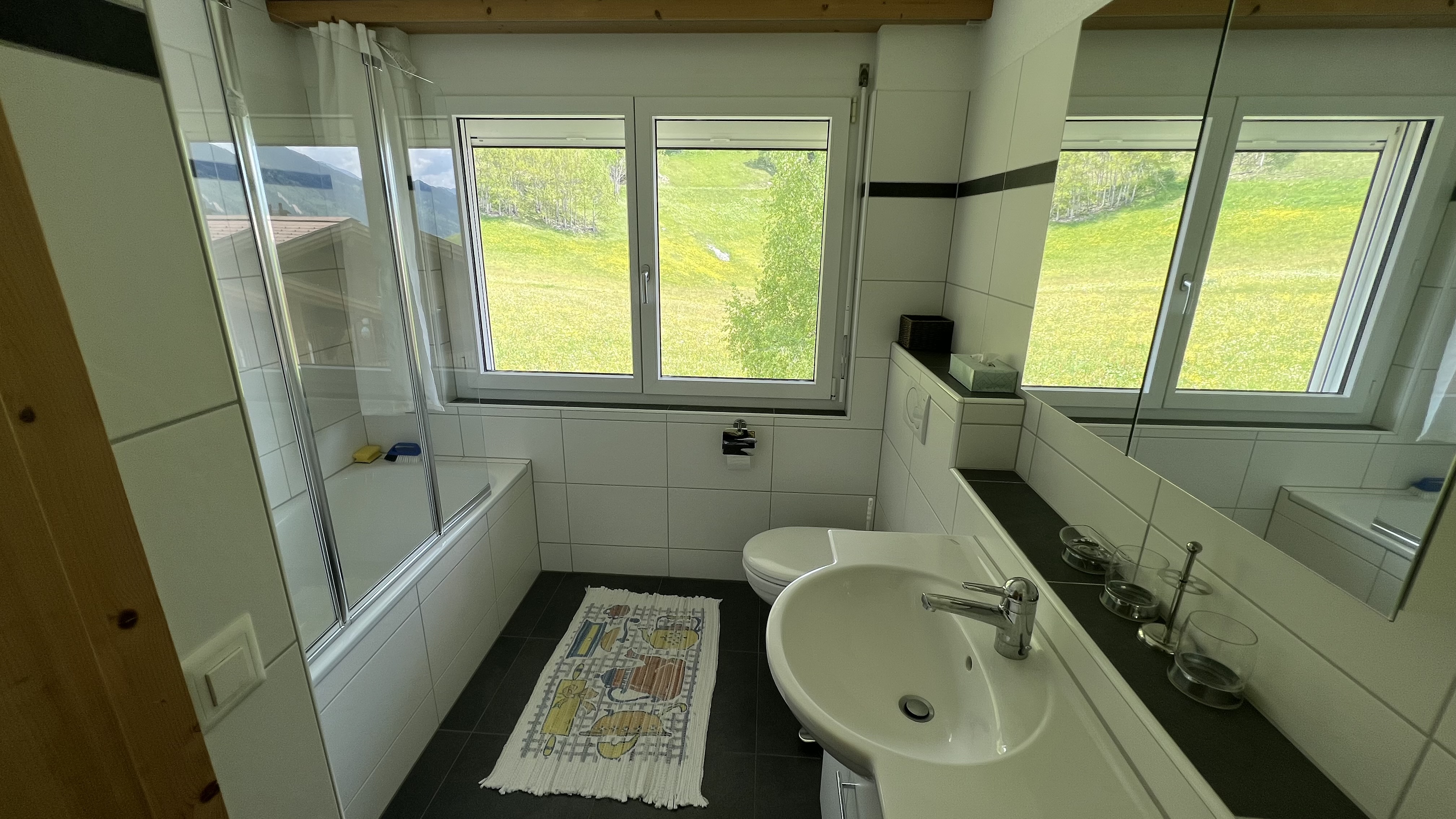 Sehr komfortable, sonnige Dachwohnung mit 4.5 m Raumhöhe im Wohnbereich und Panoramafenster mit traumhafter Aussicht auf die Alpen. Gemütlicher Schwedenofen im Wohnzimmer. Zwei Schlafzimmer, zwei Badezimmer (komfortabel für 4 Pers.) Grosser Balkon, Südlage. Sicheres und einfaches Parkieren in der privaten Garagenbox. Viel Platz in der Wohnung vorhanden. Skiraum im Keller. Details: Eigene Schränke und Schuhregal. Wohnzimmer: Bequemes L-Sofa, TV, CD-/DVD-Player und Lesebücher. Essbereich mit Holztisch für 4 Personen, vielseitig ausgestattete Küche mit Backofen, Glaskeramik, Kühlschrank mit Gefrierfach, Spülmaschine, Nespresso Maschine, Toaster und genügend Pfannen. 2 Badezimmer: eins mit Badewanne und eins mit Dusche.
