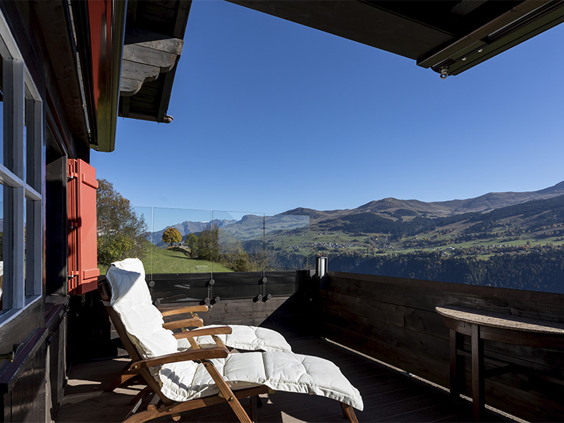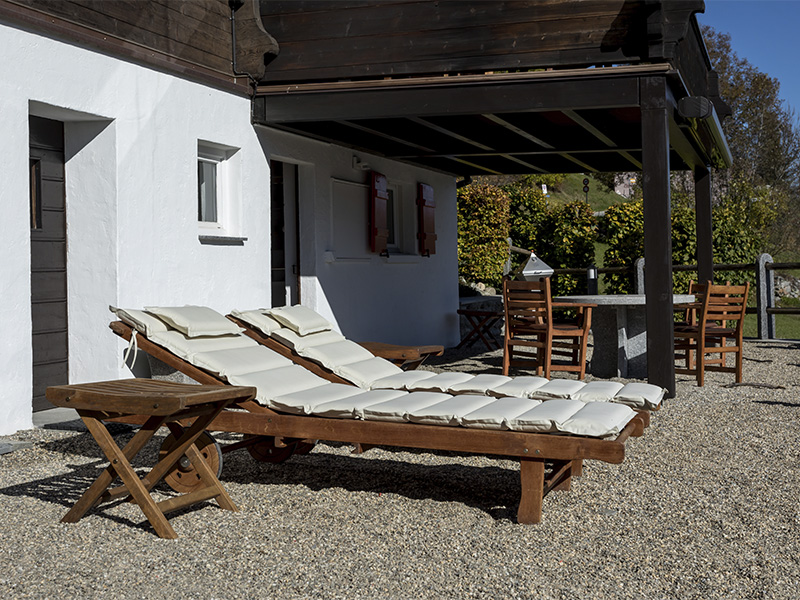 Grosser Balkon, 5x3 m, unverbauter Südhang, freie Sicht von Ost nach West ins Tal und in die Berge, Tisch mit 4 bequemen Stühlen, 2 Deckchairs, 2 Sonnenstoren, teilweise gedeckt. Gartenterrasse: