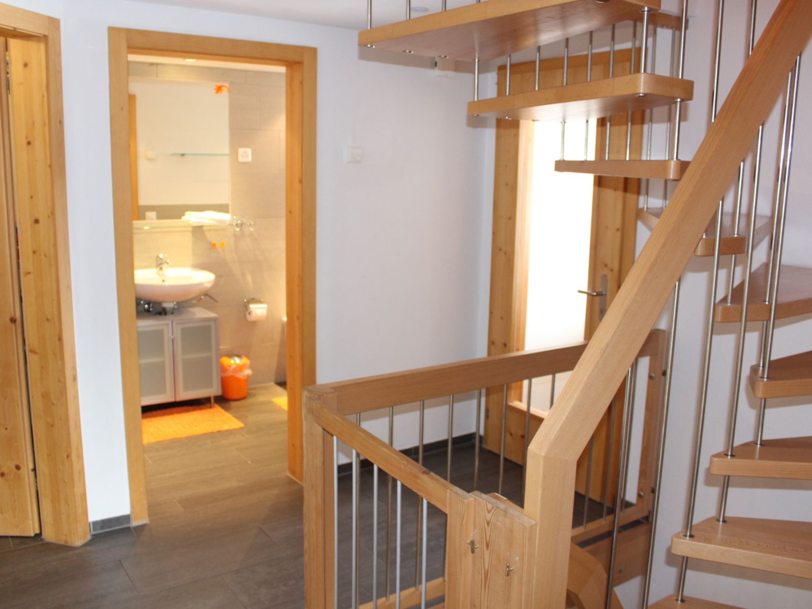 Eine offene Gallerie mit Sitzmöglichkeiten lädt zum lesen und erholen ein. Ein grosses Fenster bietet eine unverbaute Sicht ins Safiental. Badezimmer: