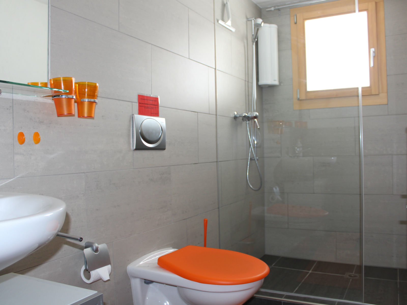 Ein Badezimme rmit Dusche und WC/Lavabo. Inneneinrichtung:
