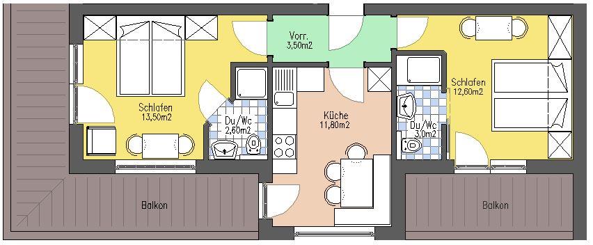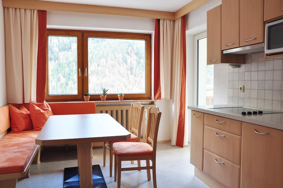 Gemütliches Appartement mit 1 Doppelzimmern aus Zirbenholz und 1 Dreibettzimmer (Doppelbett und Einzelbett) jeweils mit Dusche/WC und Föhn, Flat-TV und Balkon. Wohnküche (voll ausgestattet) mit großzügigem Essplatz , Flat-TV und Safe. Brötchnservice ist möglich. Größe ca. 48 m².