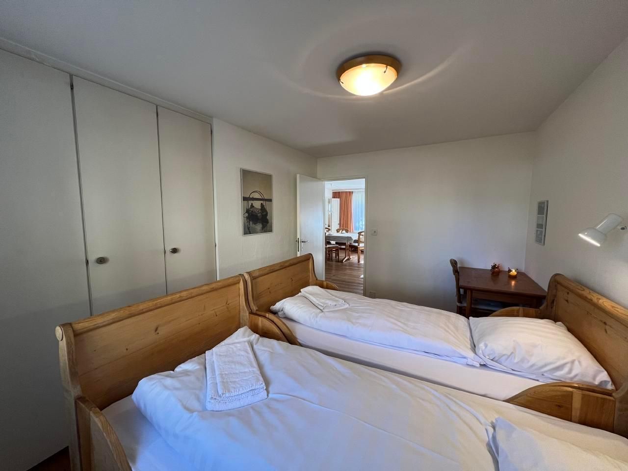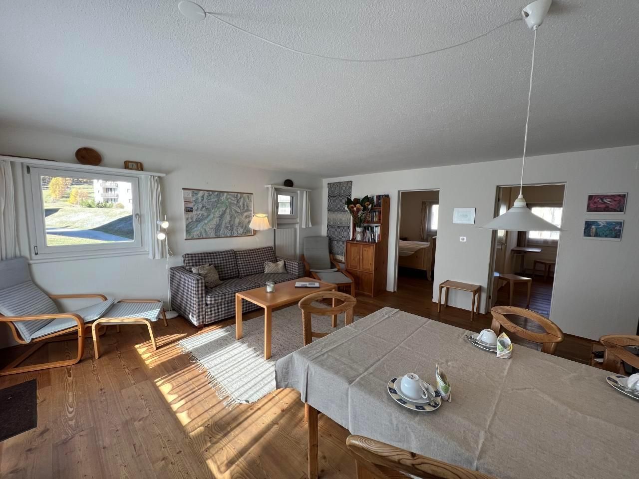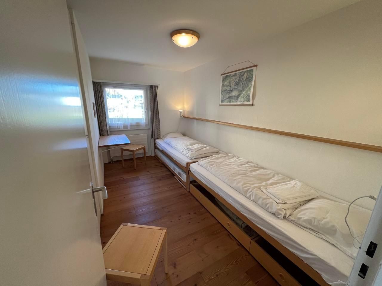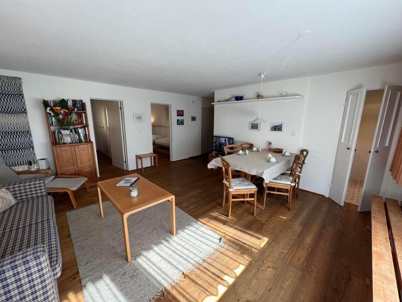 Im Inneren erwartet Sie ein komfortables Wohn- und Esszimmer mit direktem Zugang zum Balkon, ein Schlafzimmer mit Doppelbett sowie ein weiteres Schlafzimmer mit zwei Einzelbetten. Die Küche ist gut ausgestattet mit einer Filterkaffee- und einer Nespresso-Maschine, einem Fondue-Set (Raclette nicht vorhanden), sodass Sie während Ihres Aufenthalts bequem eigene Mahlzeiten zubereiten können. Das Badezimmer verfügt über eine einladende Dusche. Zusätzlich steht Ihnen gratis WLAN-Zugang zur Verfügung und für die Allgemeinheit gibt es eine Waschmaschine, einen Skiraum sowie einen Wachsraum.