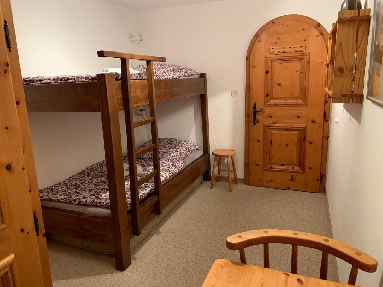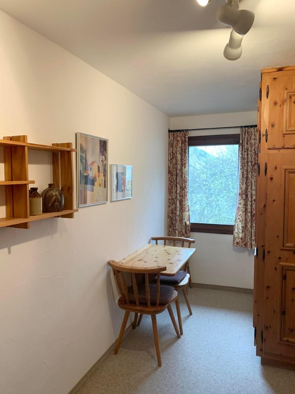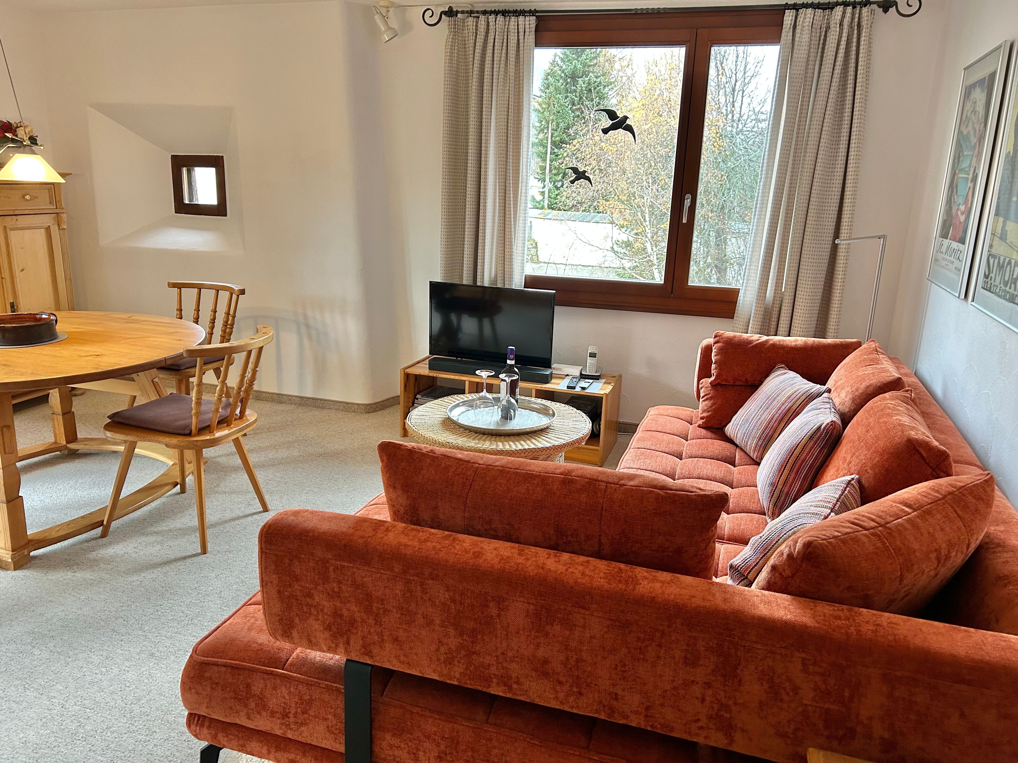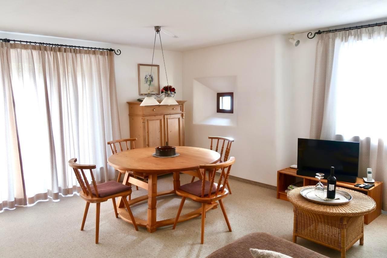 Im Inneren erwartet die Gäste eine sonnendurchflutete Wohnung im 1. Stock, liebevoll eingerichtet mit einheimischen Arvenmöbeln im typischen Engadiner Stil. Die Wohnung verfügt über einen gemütlichen Wohnraum mit südseitigem Balkon, Essplatz für vier Personen und einer bequemen Polstersitzecke zum Entspannen. Eine gut ausgestattete Küche, durch eine Theke vom Wohnraum getrennt, bietet alles, was der Feriengast zum Kochen gerne vorfinden möchte, inklusive Spülmaschine, Gefrierschrank und Kaffeemaschine. Zwei Schlafzimmer, eines mit Doppelbett und eines mit Stockbetten ausgestattet, bieten ausreichend Platz für die ganze Familie, ergänzt durch ein Badezimmer mit Dusche und WC sowie einen einladenden Flur mit großer Garderobe.