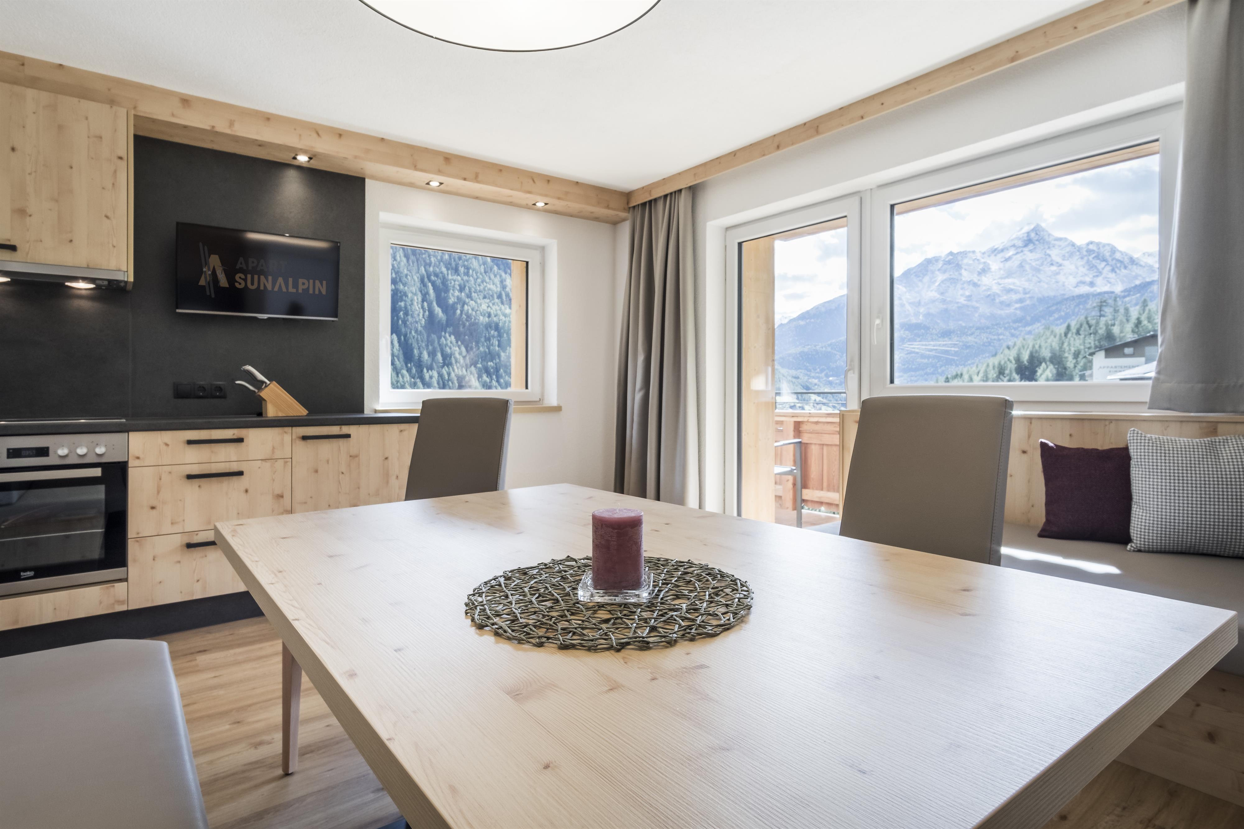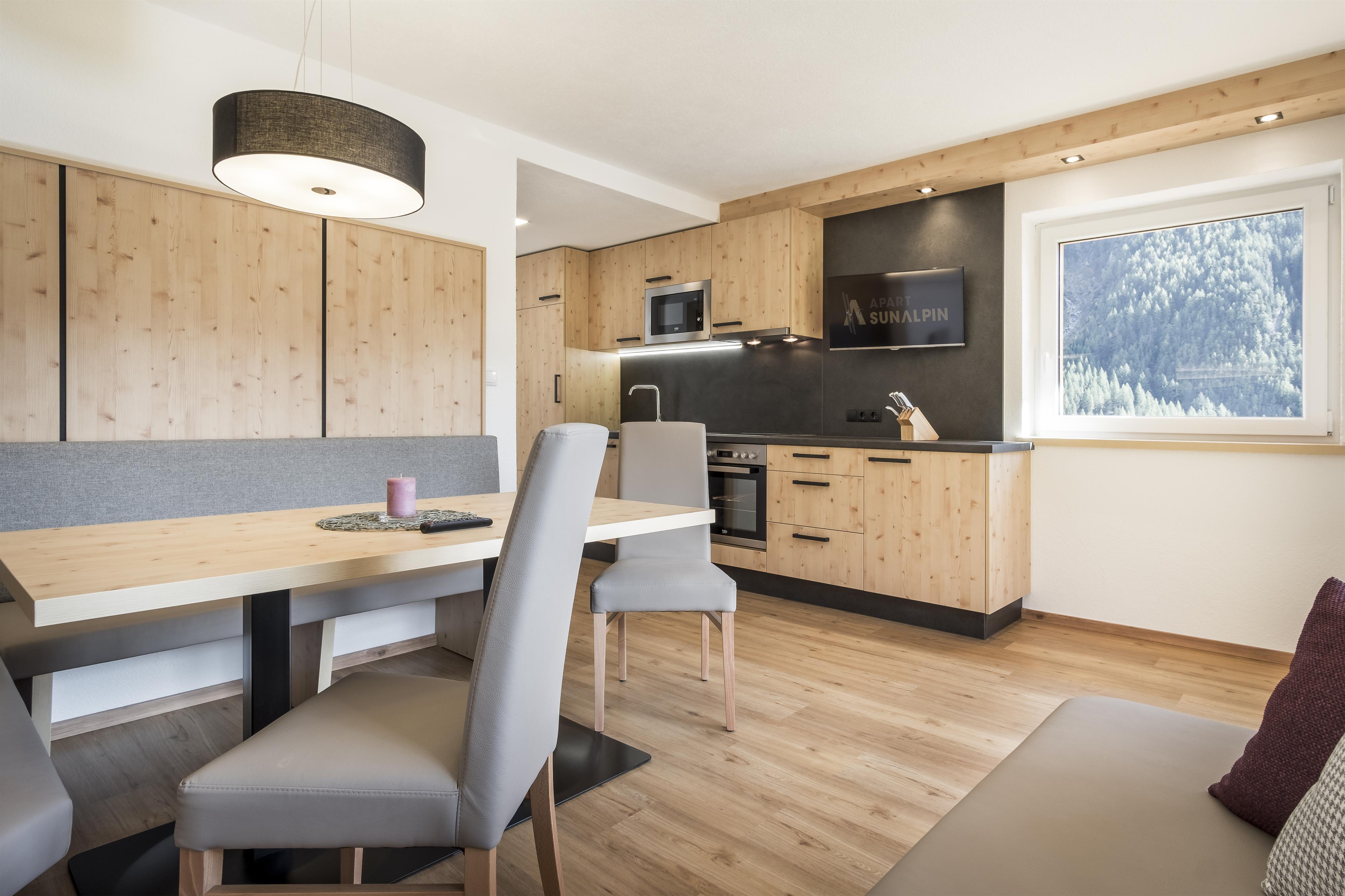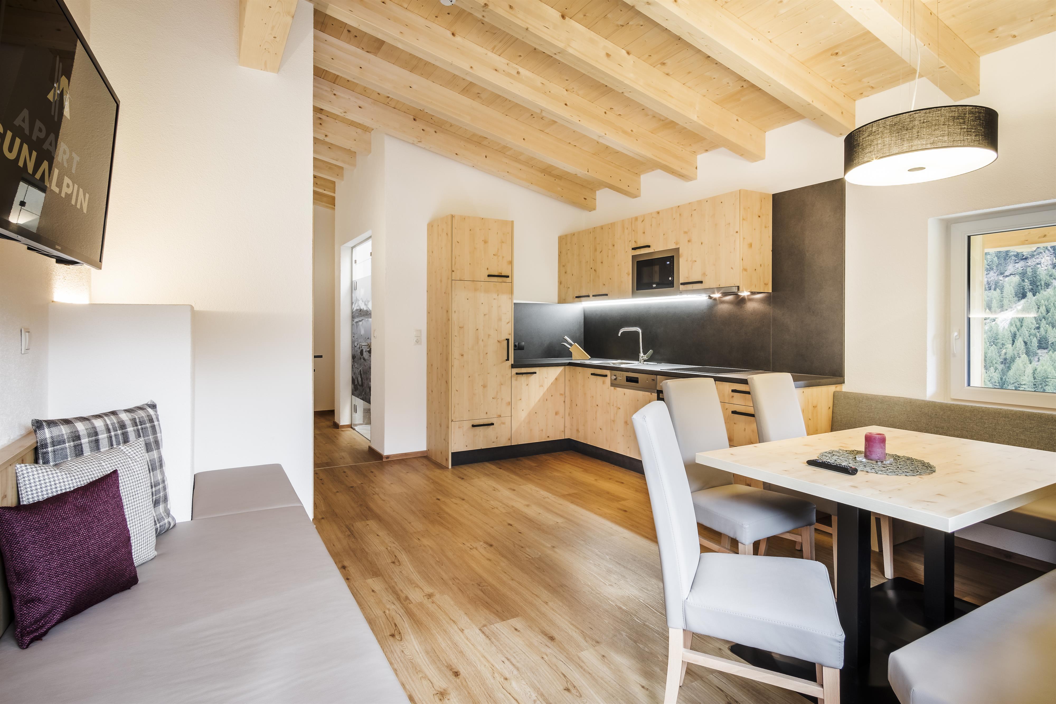 Neu gestaltetes Appartement mit 2 Doppelzimmer, Flat-TV und Balkon. 1 Badezimmer mit Dusche und separatem WC. Wohnküche mit Kachelofen, Flat-TV und gemütlicher Essecke im Tiroler Stil, moderner und komplett ausgestatteter Kochbereich. Das Appartement Brunnenkogl befindet sich im 3. Stock mit Sichtdachstuhl.
