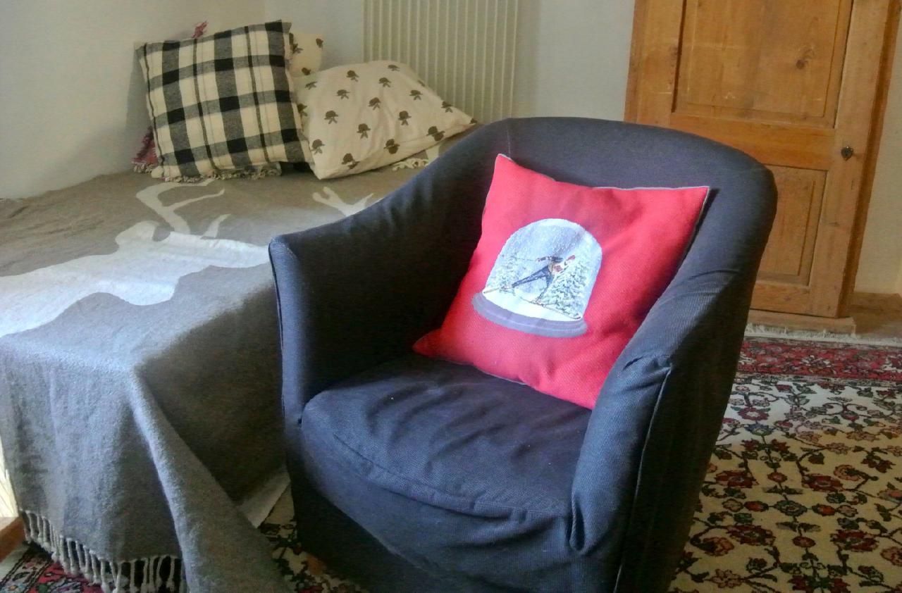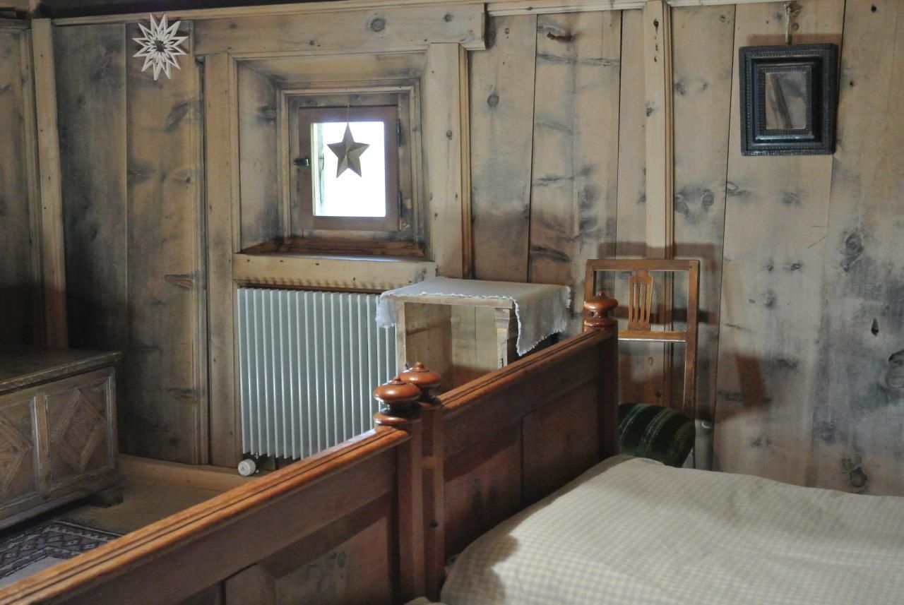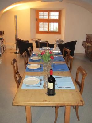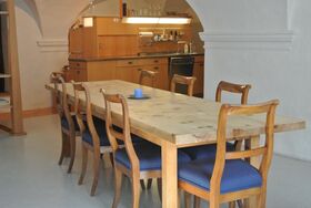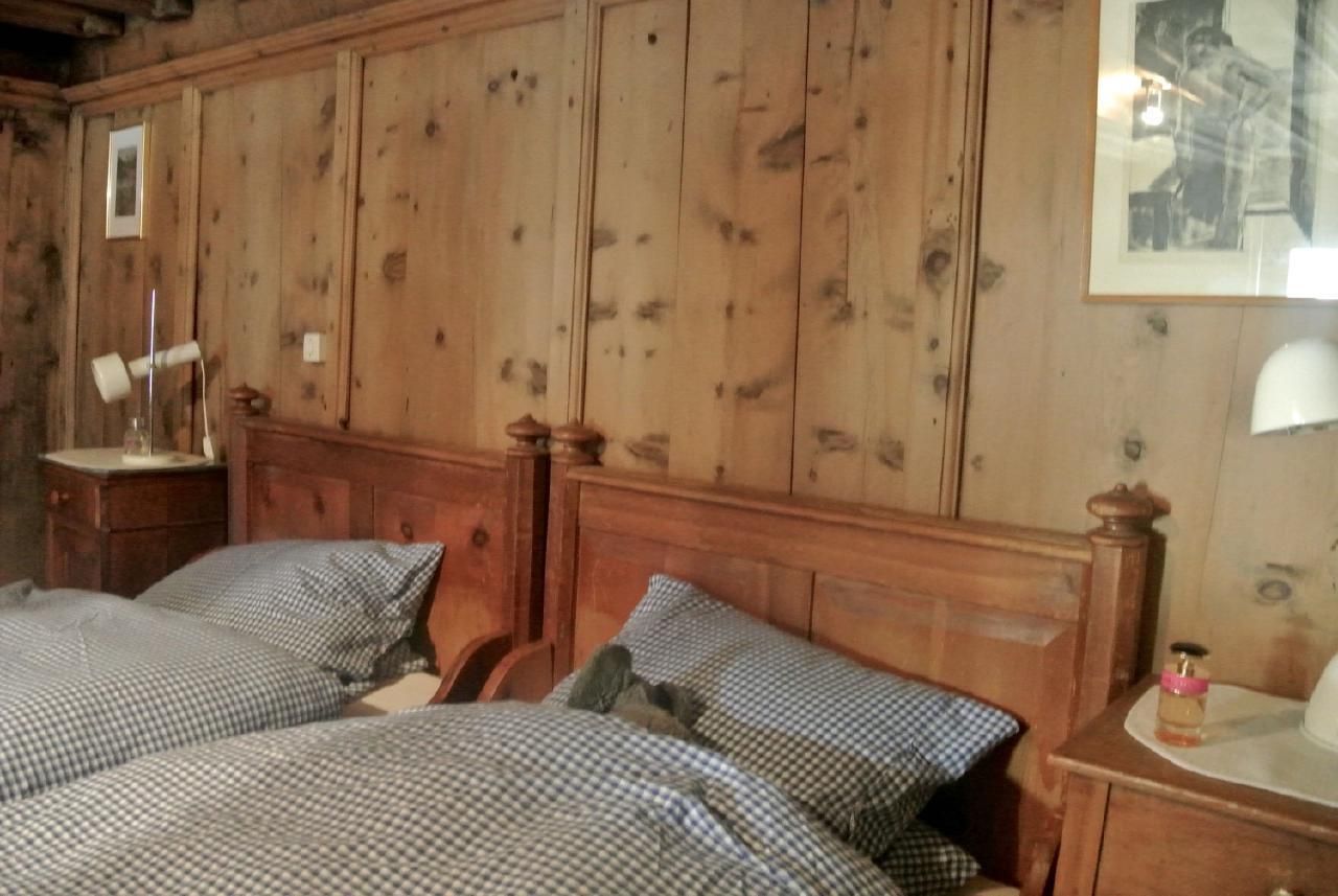 - 1. OG: Grosses offenes Wohnzimmer mit Zugang zum Essbereich (Tisch für 10 Personen) und Küche mit Geschirrspüler und Nespressomaschine, eine historische Arvenstube mit Platz für 4 Personen, ein Doppelzimmer mit zwei einzelnen Betten