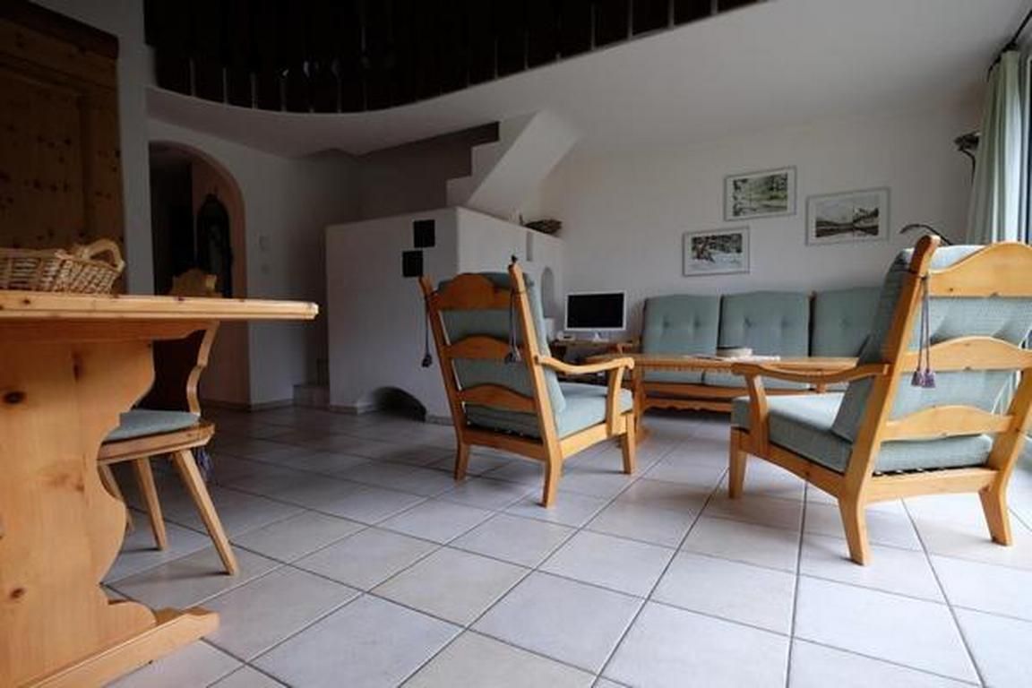 Die Innenausstattung der Wohnung spricht für einen hohen Wohnkomfort: Das Wohnzimmer ist mit heimeligen Arvenholzmöbeln, einem großen Esstisch mit Eckbank, einer durchdachten Küchendurchreiche und einer bequemen Polstergruppe ausgestattet. Direkter Zugang zur sonnigen Terrasse lädt ein, die Stunden im Freien zu verbringen. Die Küche bietet moderne Annehmlichkeiten wie Fenster, Granitabdeckung, Glaskeramikkochplatte, großzügigen Kühlschrank mit Tiefkühlabteil, Backofen und diverse Kaffeemaschinen samt Nespresso. Das Badezimmer ist mit einer Badewanne und Glaswand ausgestattet, während in der ganzen Wohnung Bodenplatten und eine individuell einstellbare Bodenheizung für Behaglichkeit sorgen.