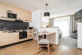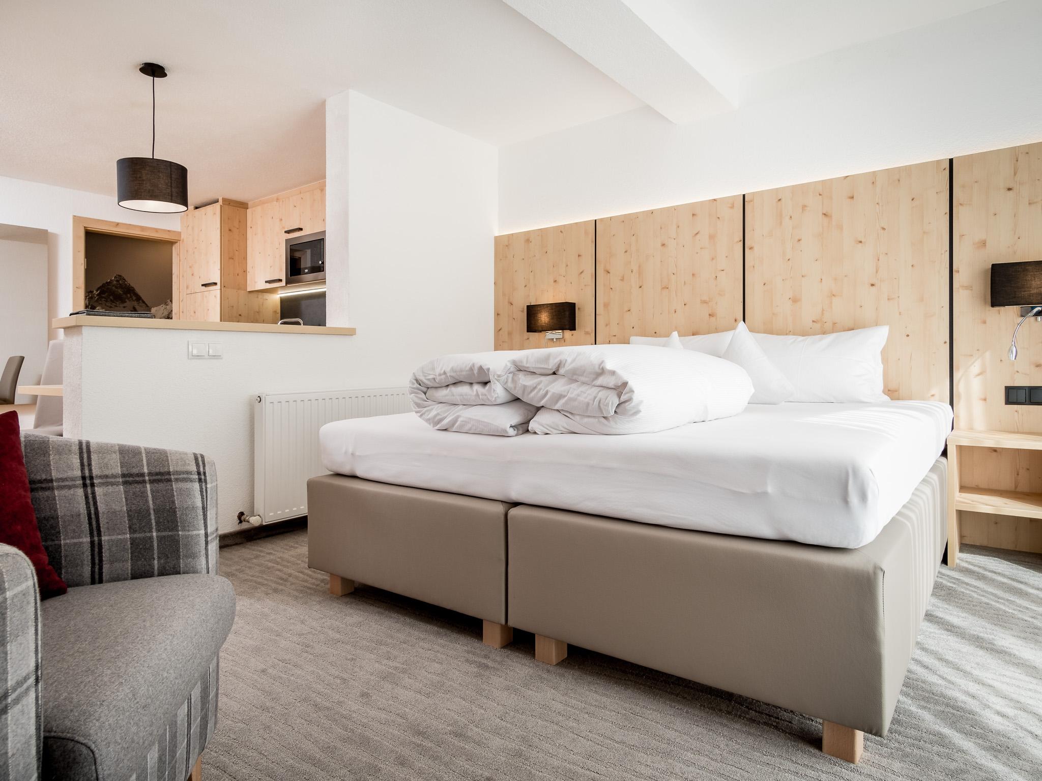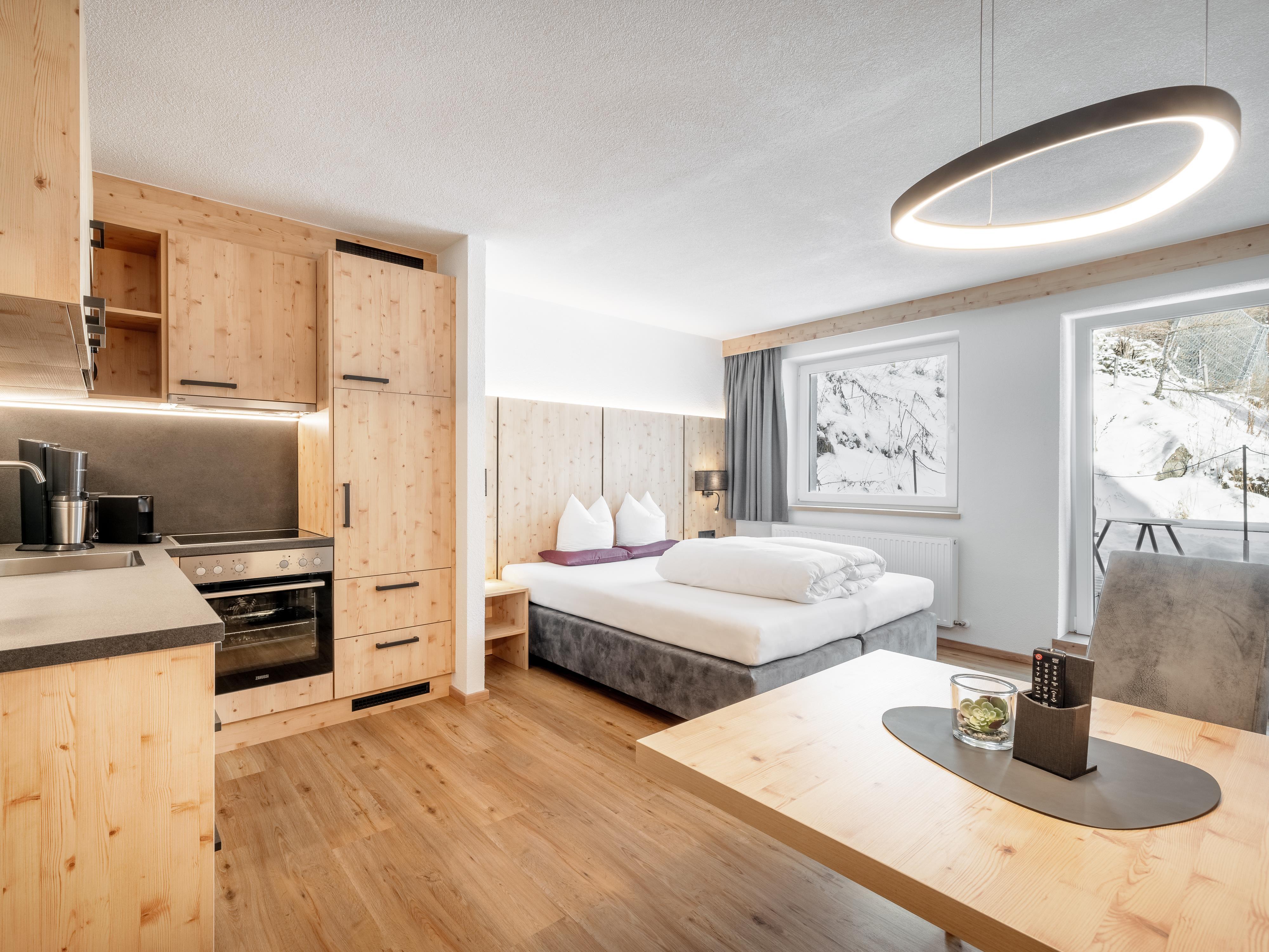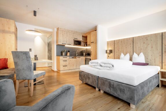 De Luxe Studio für 2 Personen mit einem Wohn-Schlafraum, optisch abgetrennte Küche mit gemütlichem Essplatz, Badezimmer mit Dusche/WC, Terrasse, Zimmersafe, Flat-TV. Größe ca. 30 m².