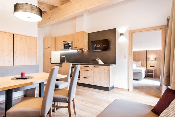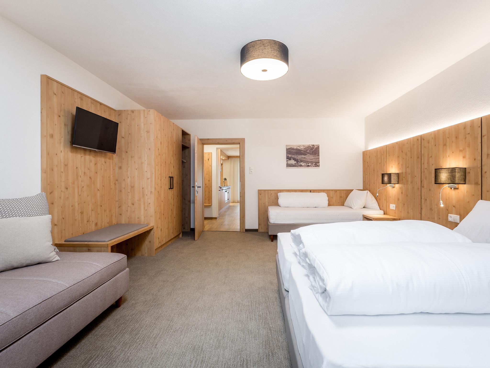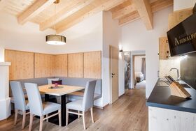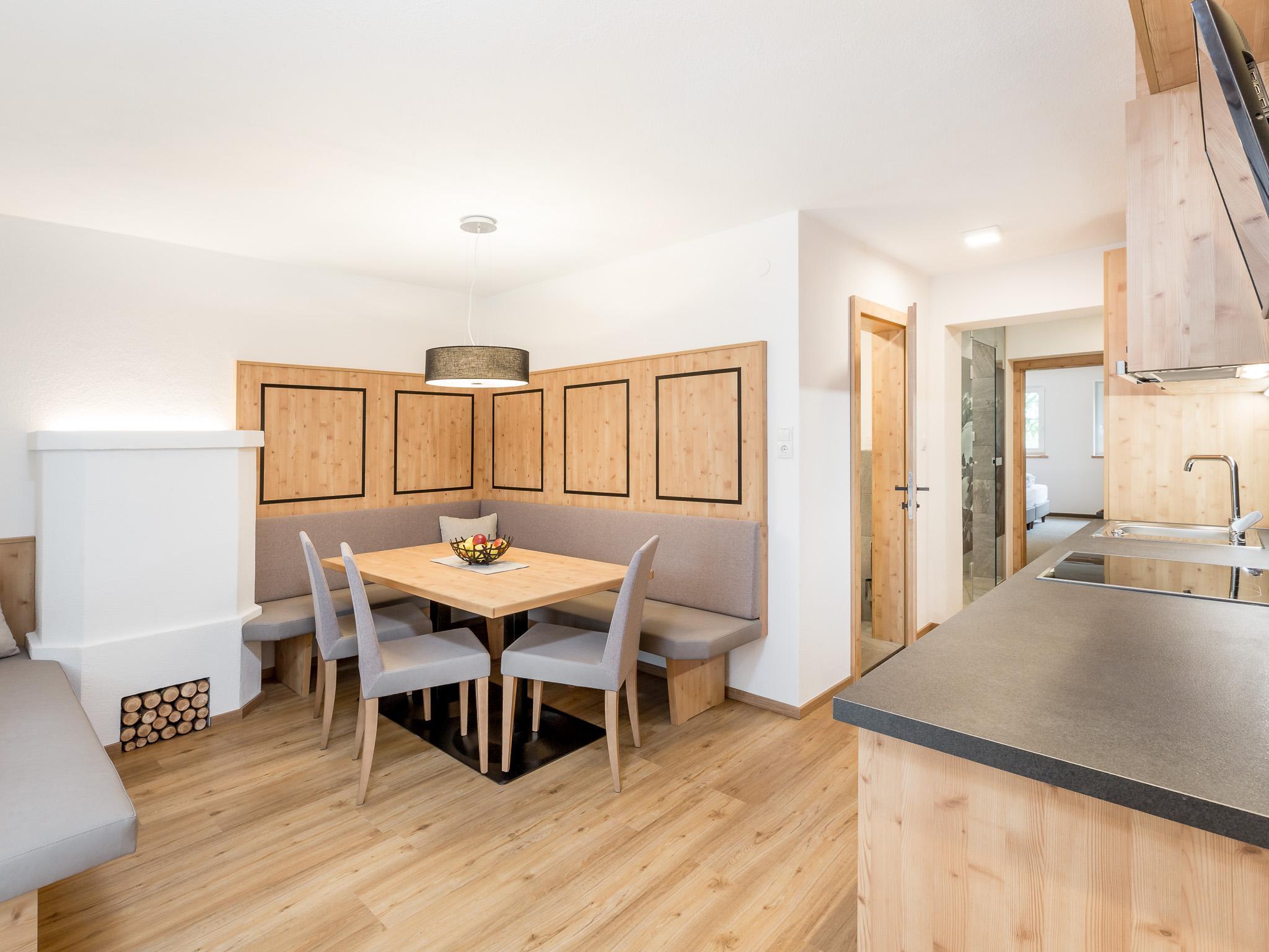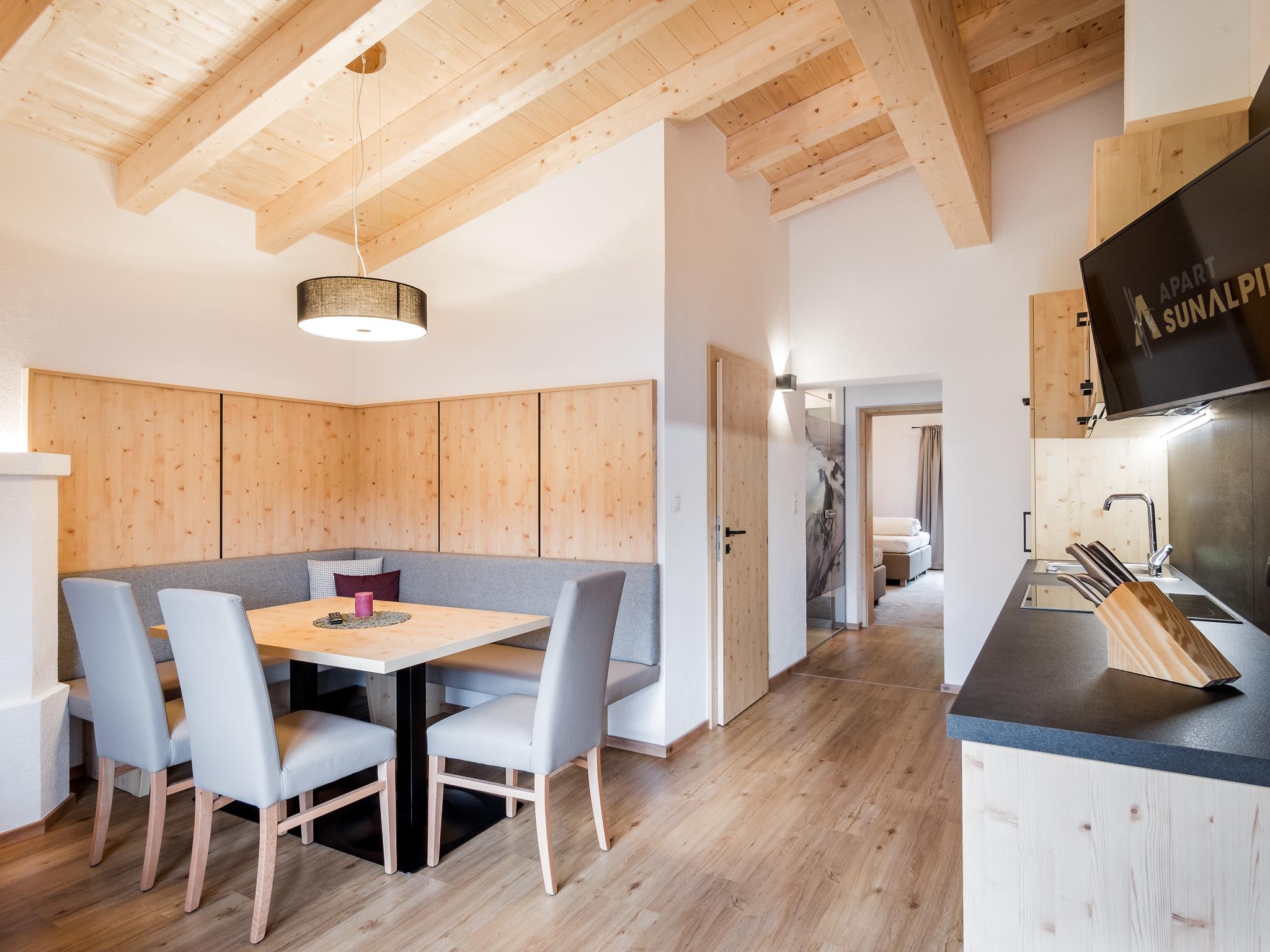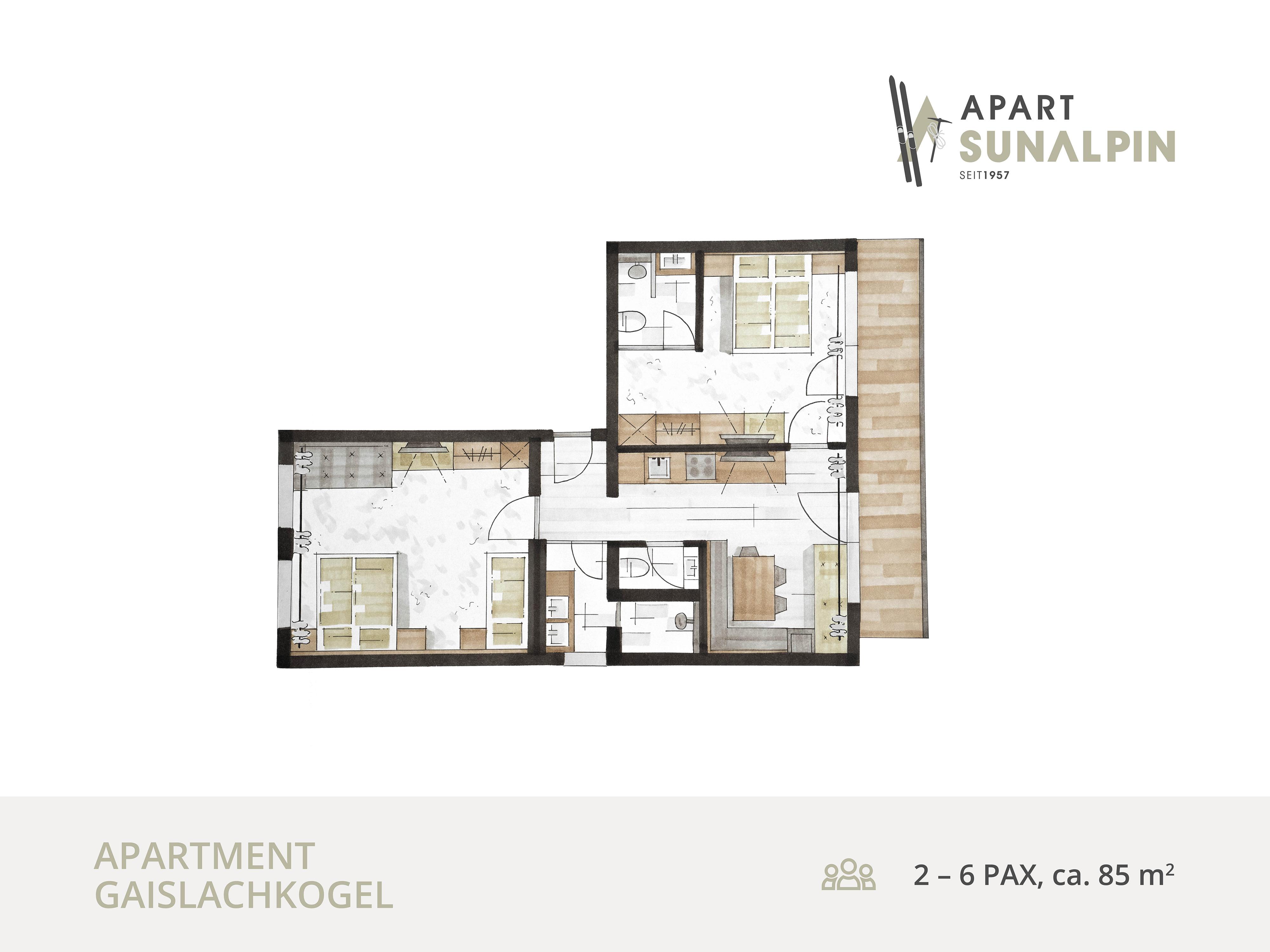 Komplett neu gestaltetes Appartement mit 2 Schlafzimmer (1 Doppelzimmer und 1 großes Zimmer mit 3 trennbaren Betten und 1 Schlafsofa), Flat-TV, Zimmersafe, 2 Badezimmer mit Dusche/WC, Haarföhn. Gemütliche Wohnküche mit Bauernofen, Essbereich im Tiroler Stil und Flat-TV. Größe ca. 80 m². Das Appartement Gaislachkogl befindet sich auf der 3. Etage mit Sichtdachstuhl.